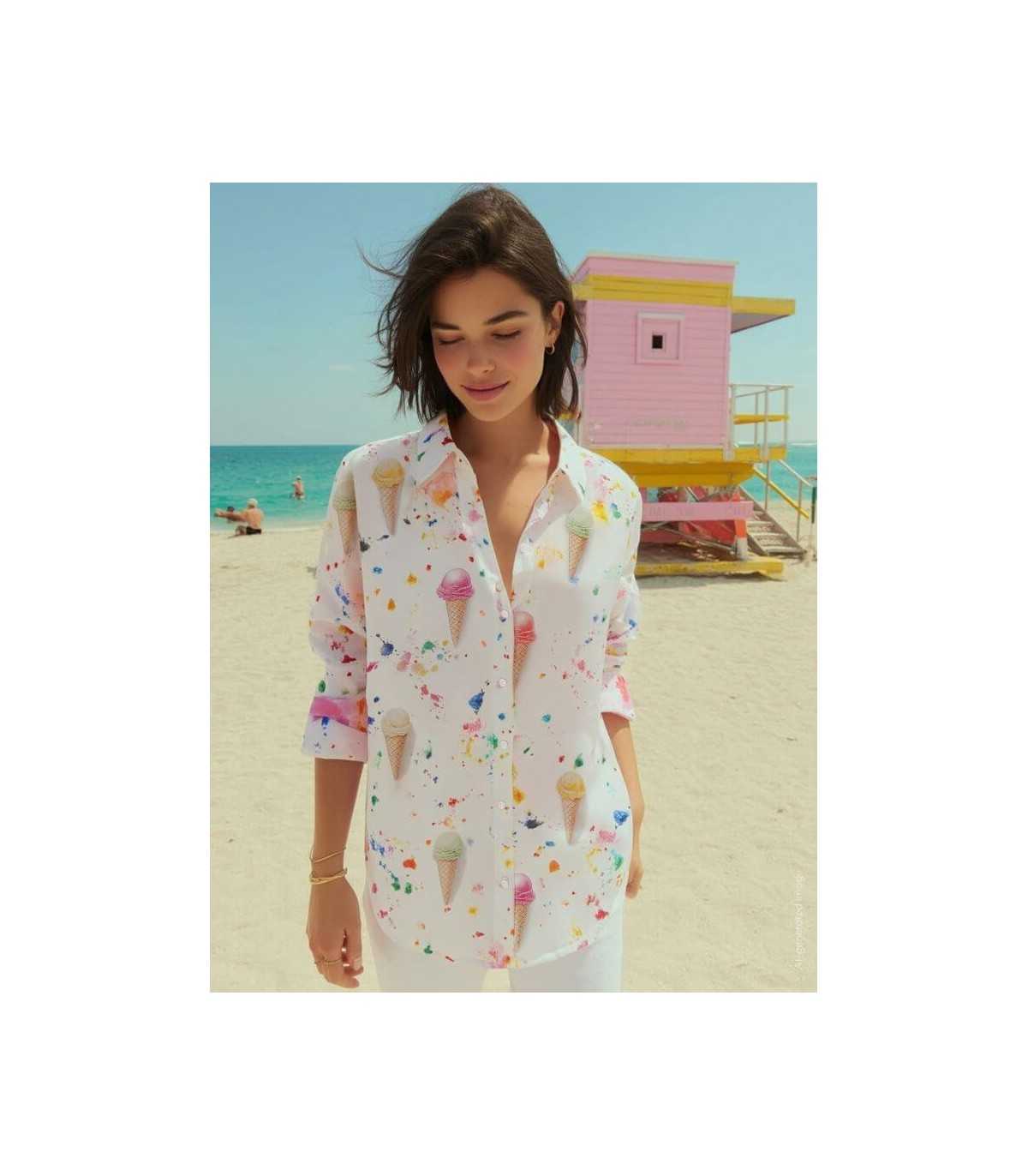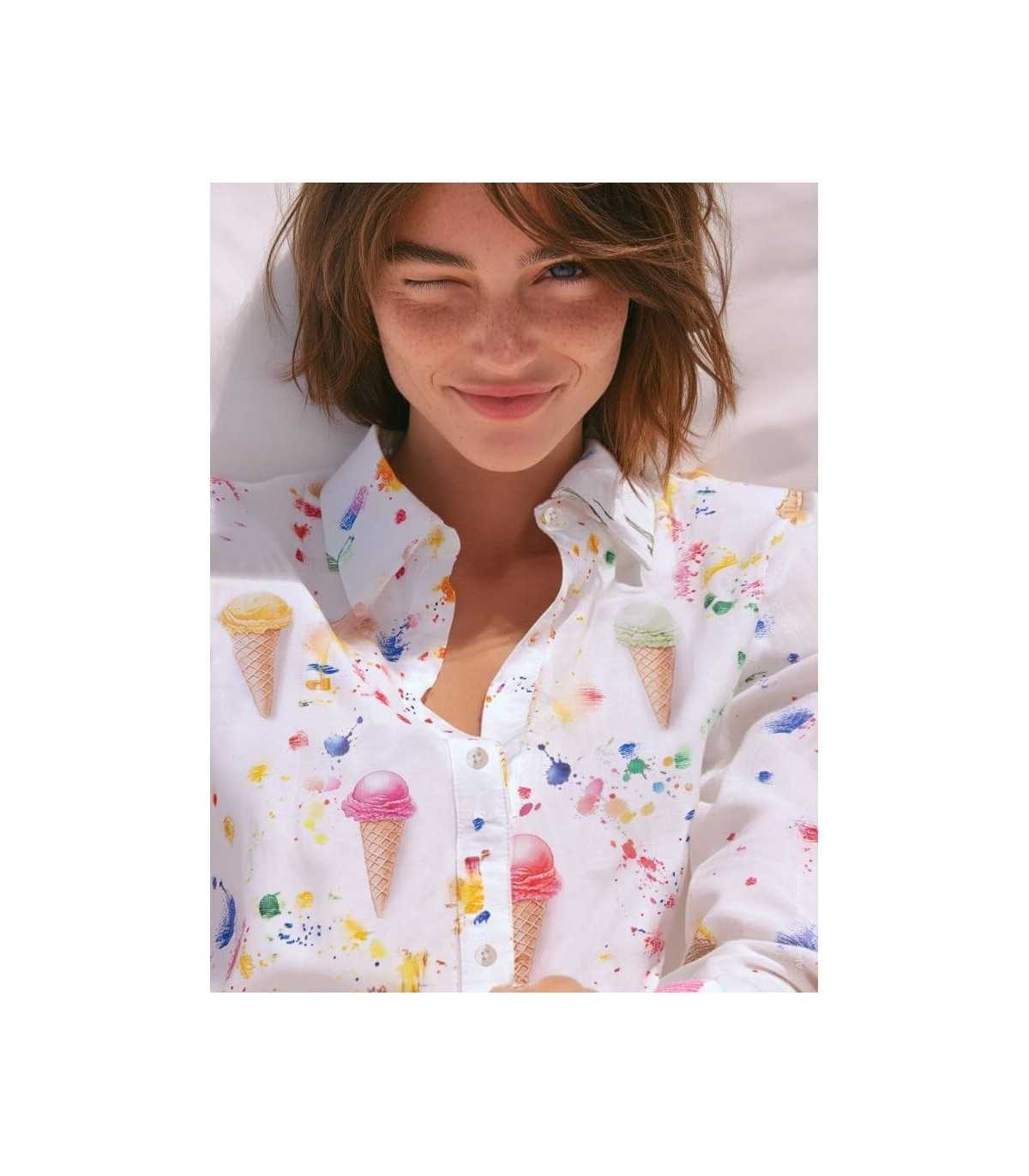 Camisa estampado conos de helados multicolor, cuello camisero, cierre frontal con botones, manga larga y bajo redondeado, de la marca española Vilagallo.