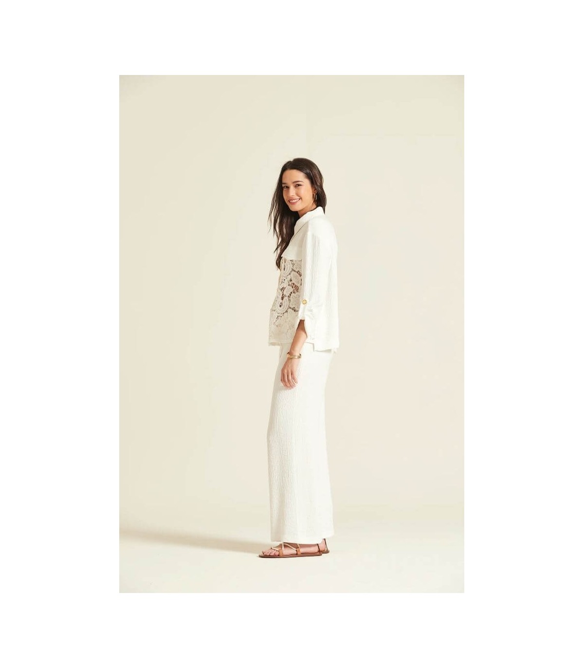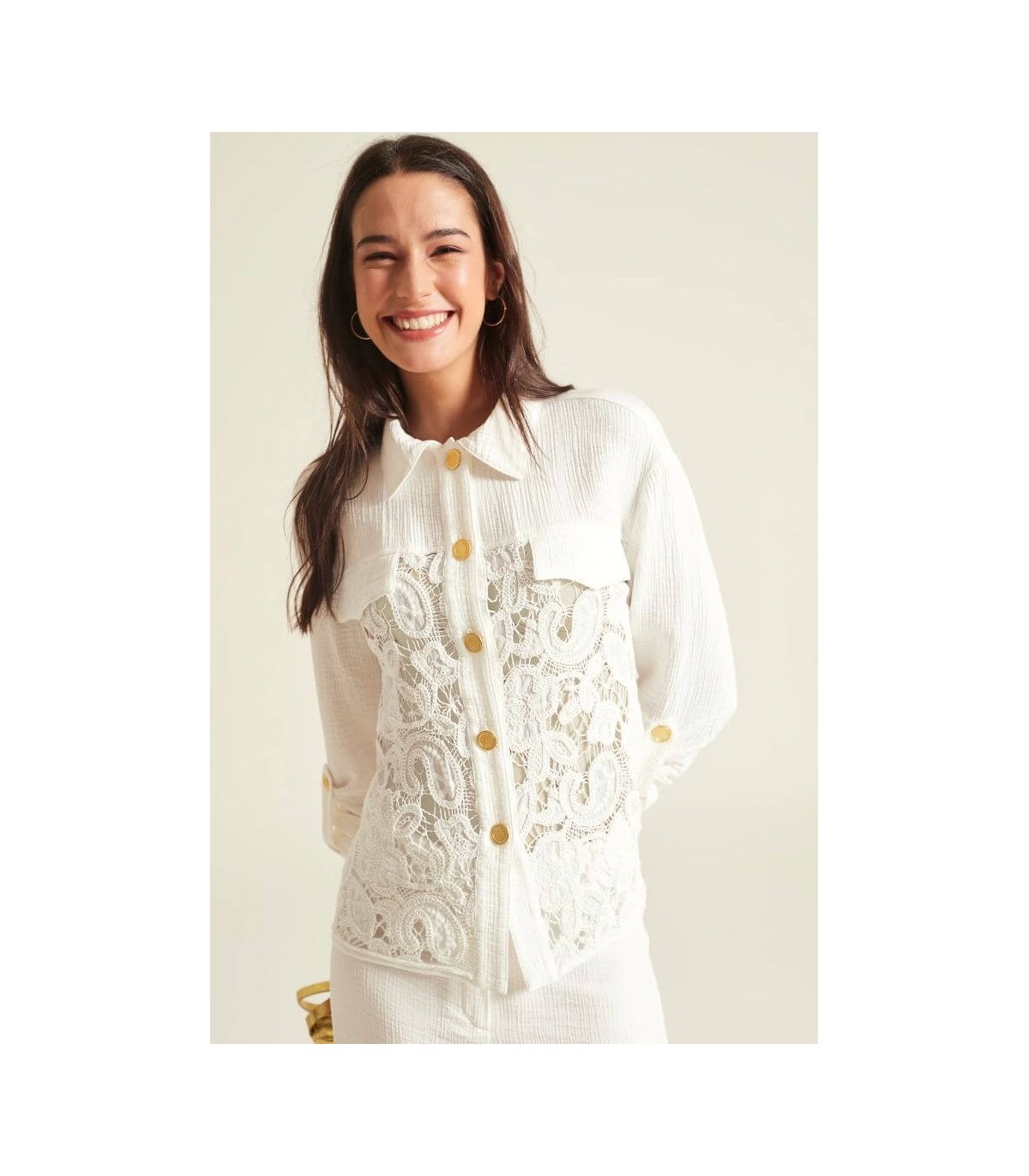 Camisa bordada de guipure floral, cuello camisero clásico, cierre frontal con botones dorados y bolsillos plastrón con solapa, de la marca española Oky.
