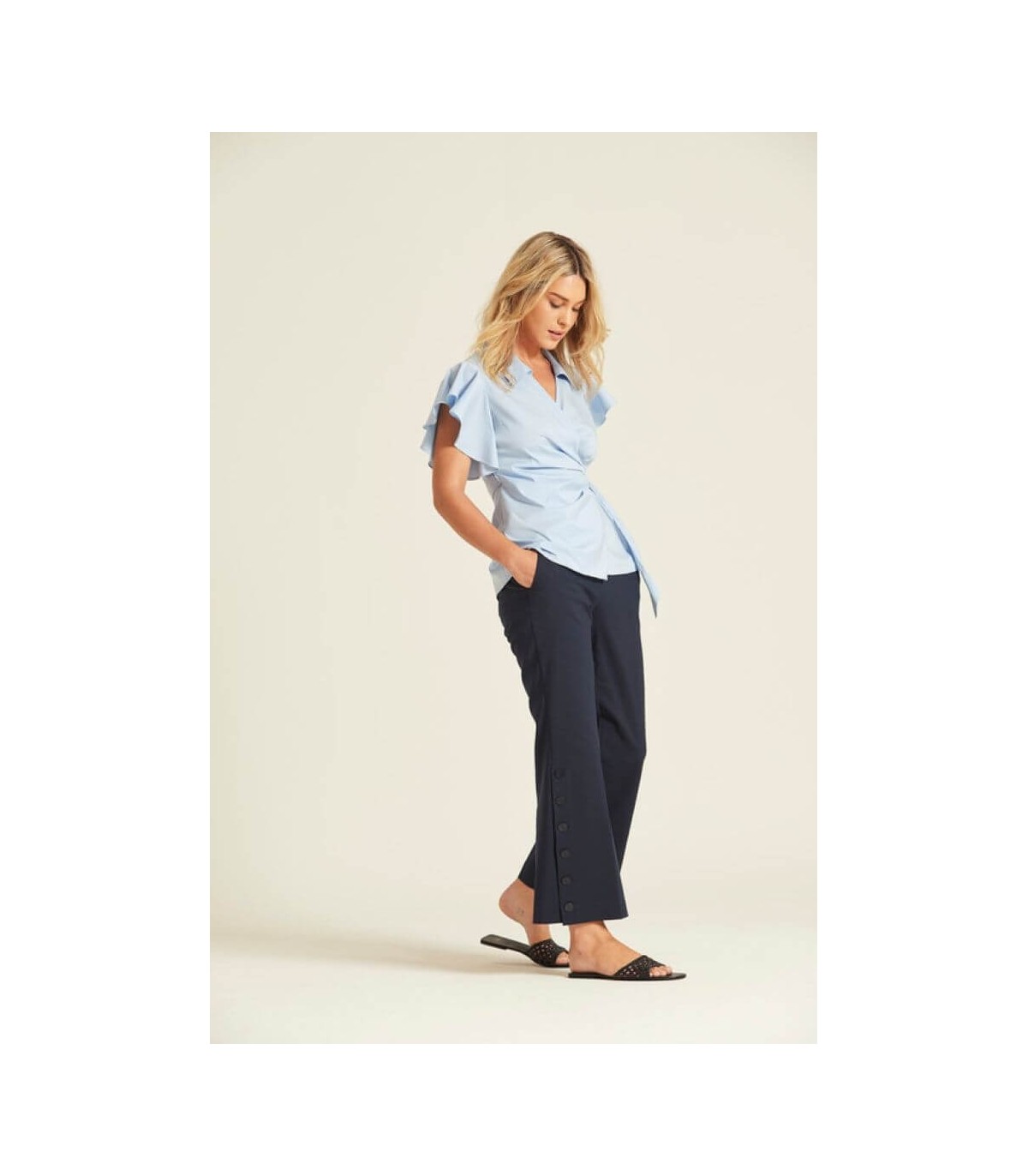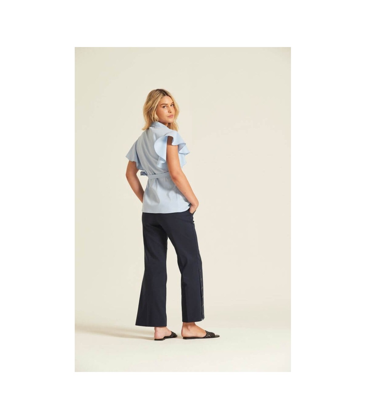 Camisa de popelín elástico celeste, escote cruzado en pico, cierre de lazada lateral y mangas cortas con volantes, de la marca española Oky.