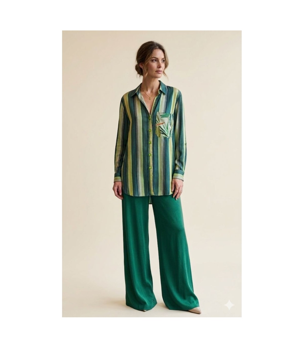 Camisa estampada de rayas verticales en verdes, bolsillo de plastrón estampado floral, terminación del bajo con puntas redondeadas, cierre frontal de botones, manga larga con terminación con vuelta y cinta con botón de ajuste, de la marca española Oky.