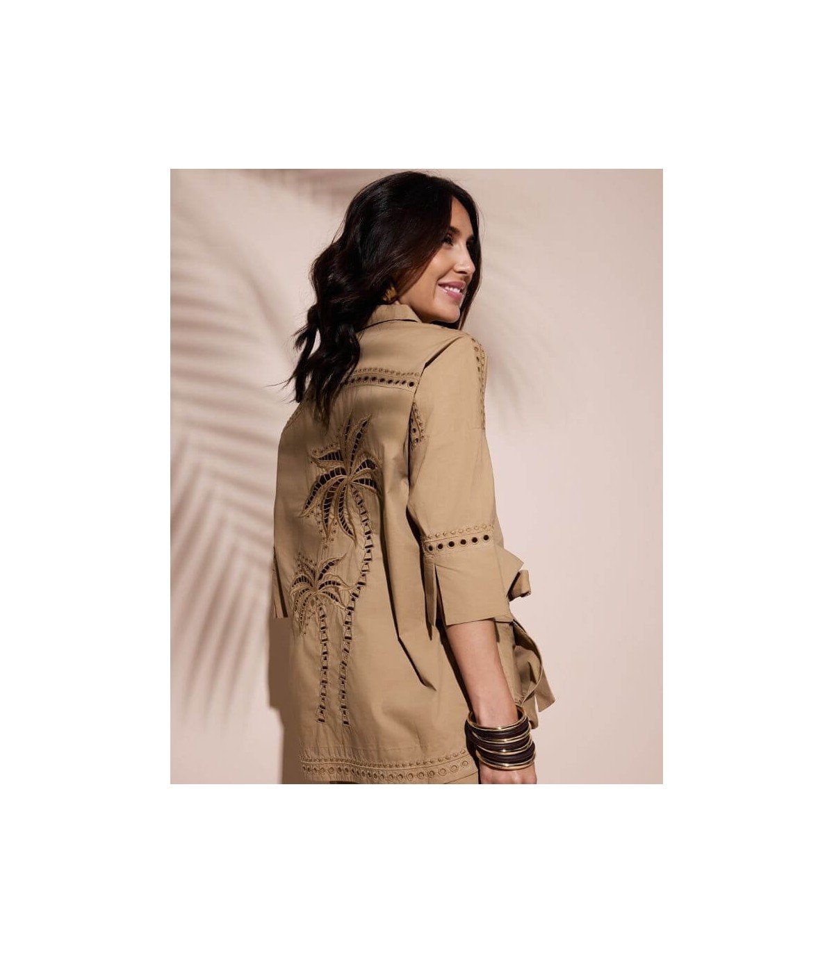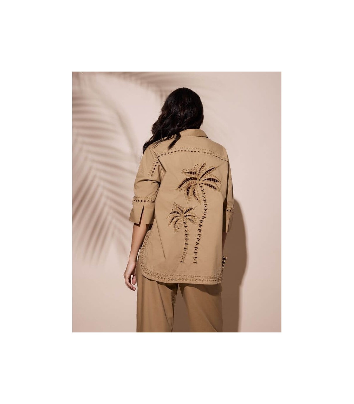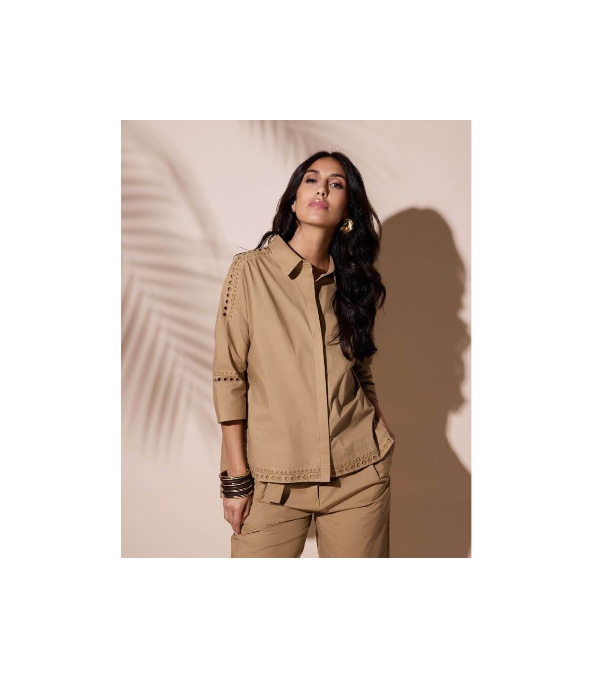 Camisa en tejido de algodón, color camel, corte amplio, mangas tres cuartos, detalles calados y bordado inglés, de la marca francesa Fuego.