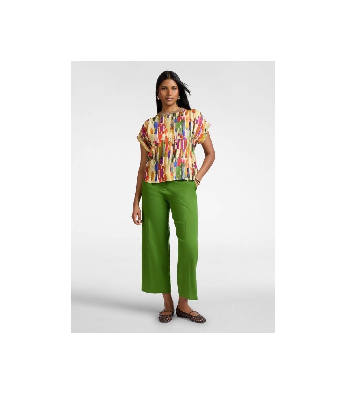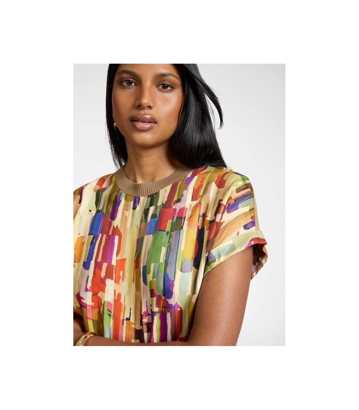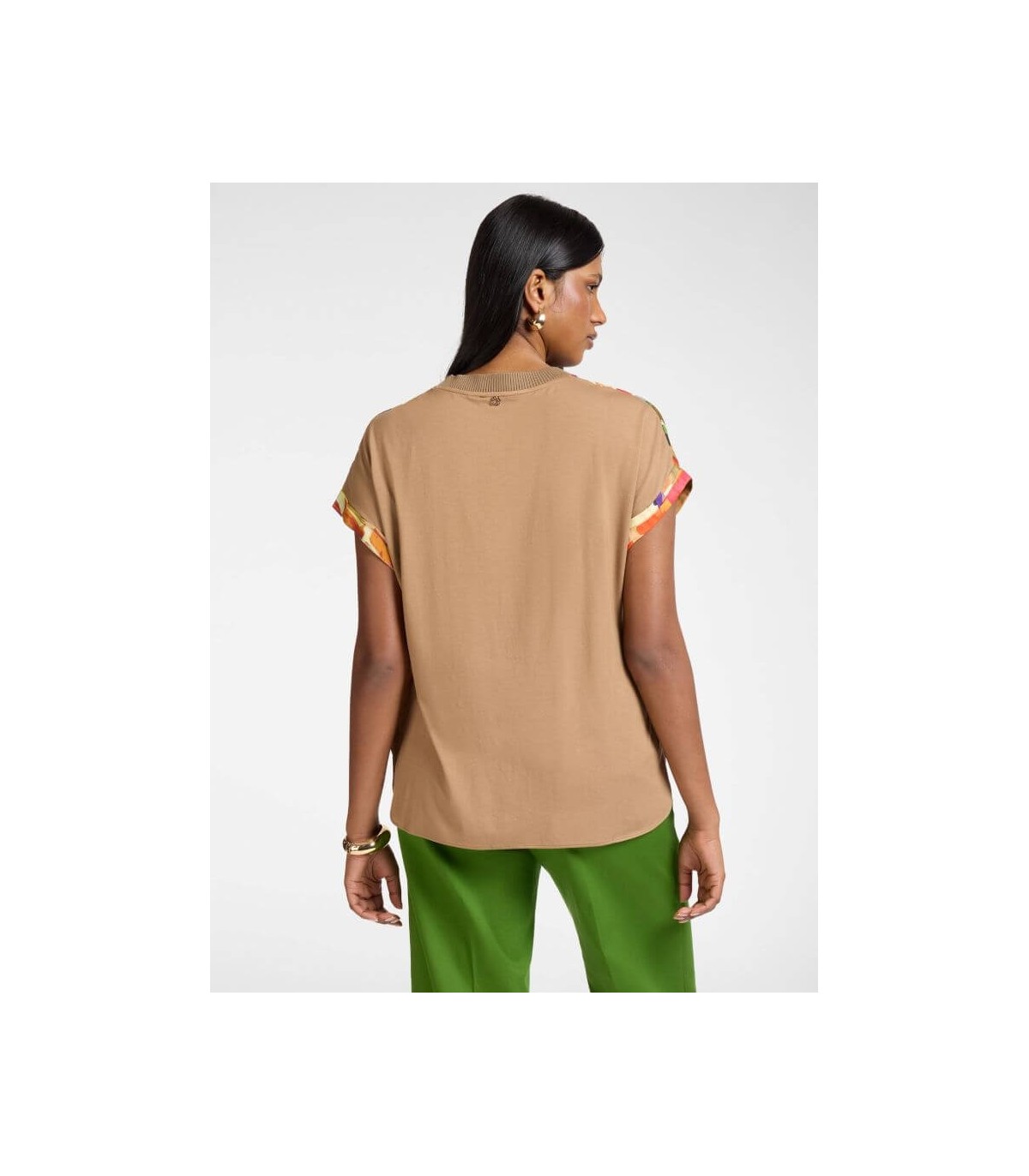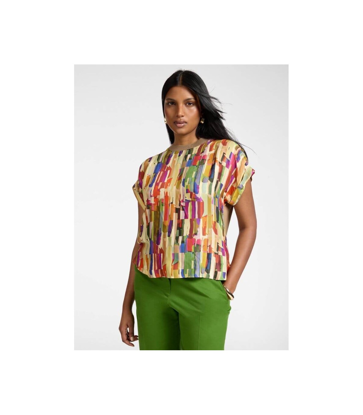 Camiseta en dos tejidos con delantero en raso estampado multicolor y mangas cortas, de la marca italiana Elena Mirò.
