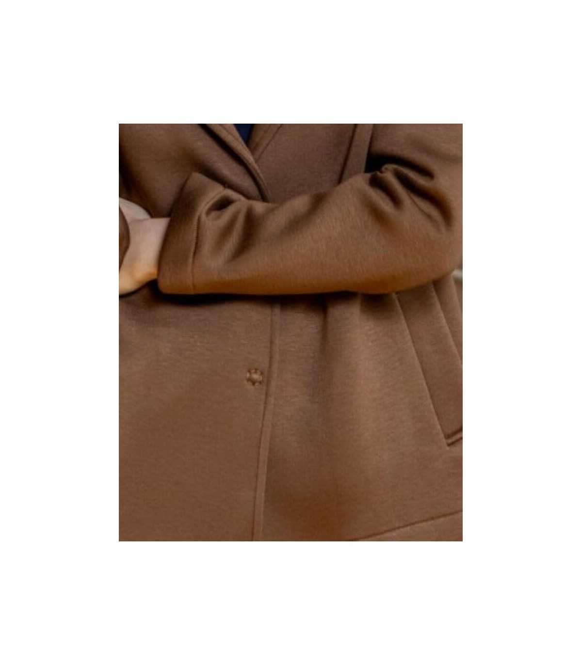 Chaqueta en tejido de neopreno color tabaco, cierre frontal de clip, capucha, bolsillos laterales y sin forrar, de la marca española Trovels.