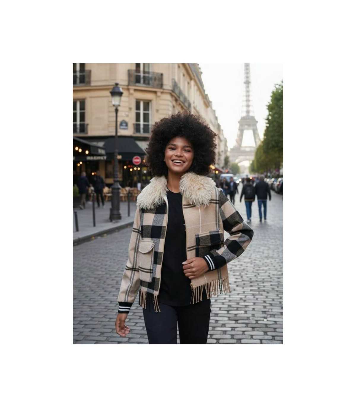 Chaqueta bomber de cuadros en tonos beige, negro y gris, corte recto con bajo con flecos, cierre frontal de cremallera dorada y puños de canalé, cuello desmontable de pelo sintético en color beige y interior con forro estampado.