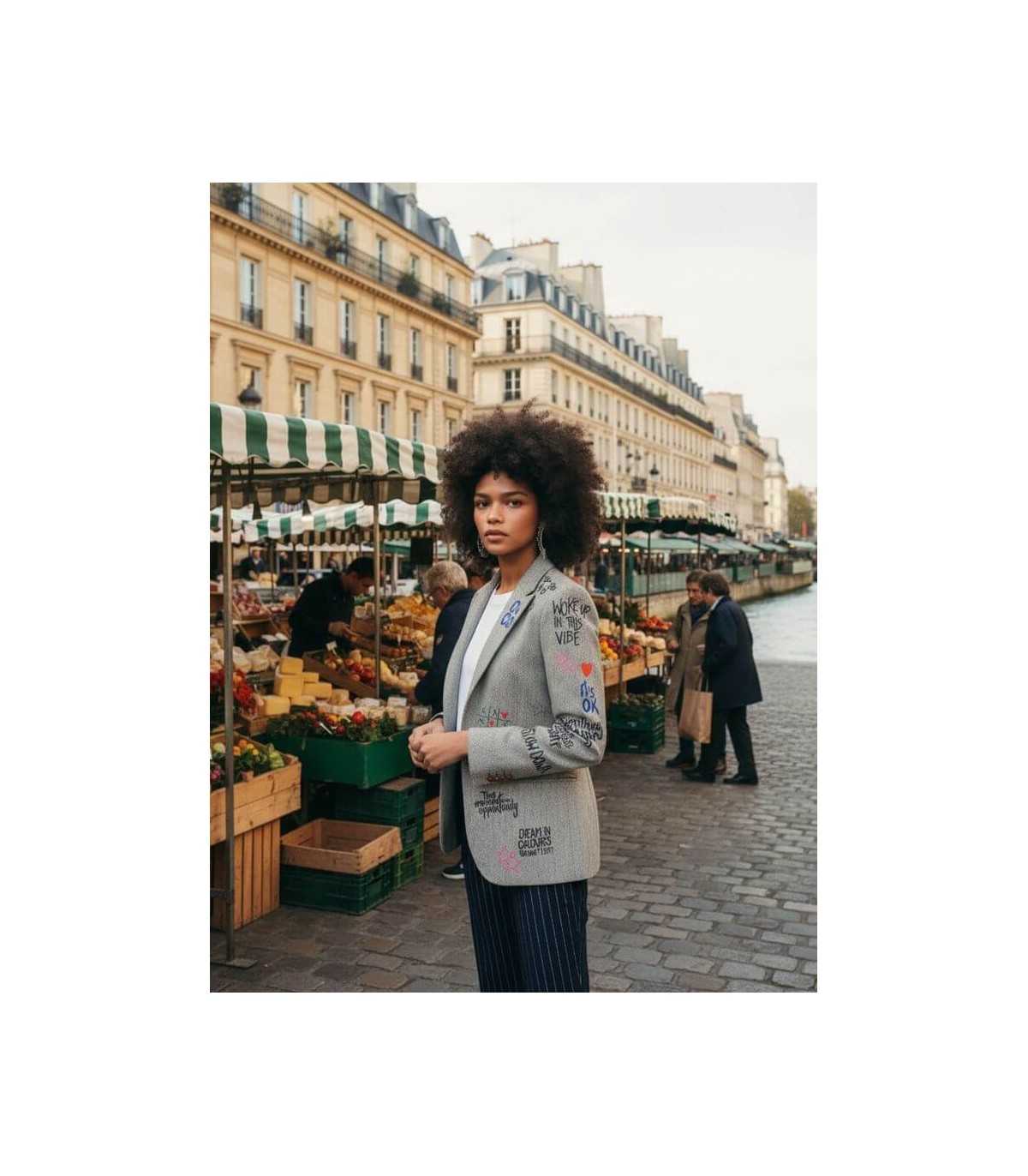 Chaqueta gris de espiga con ilustraciones serigrafiadas en delantero, espalda y mangas, corte recto con solapa y cierre de un botón. Bolsillos con vivo y tres botones decorativos en el puño y forrada, de la marca española Vilagallo.