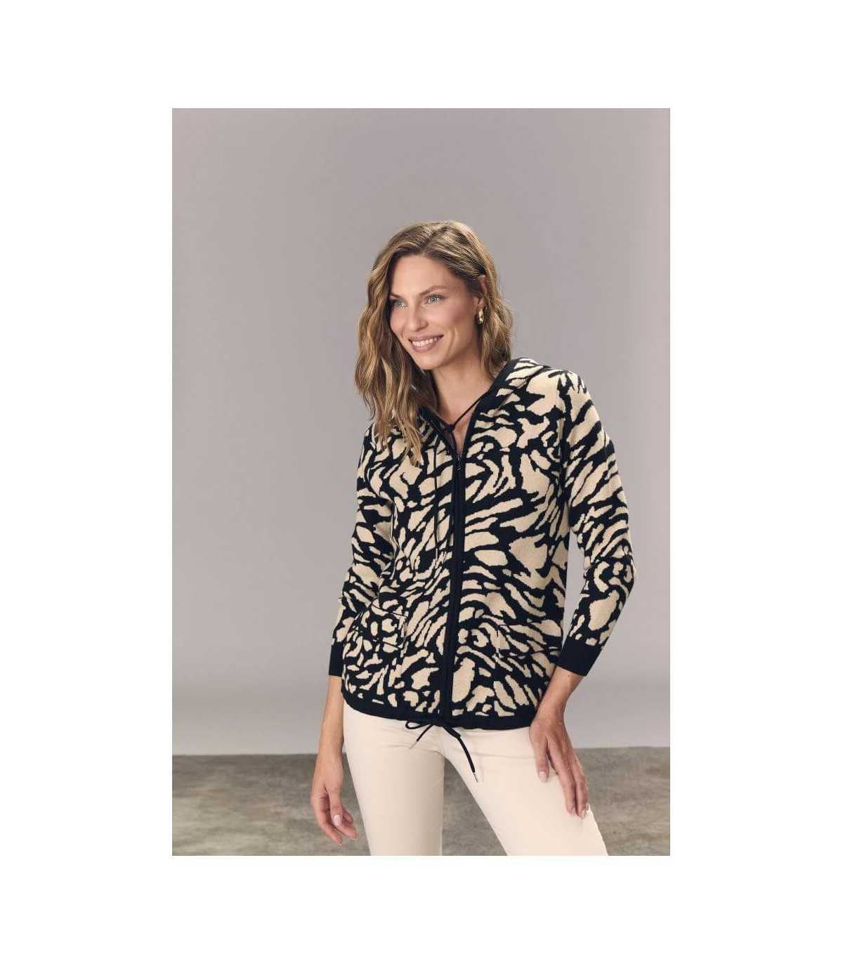 Chaqueta en tejido de punto bicolor, bloques de color, escote contemporáneo y mangas tres cuartos, de la marca canadiense Joseph Ribkoff.Composición 22% nailon, 28% poliéster, 50% rayón viscosa.