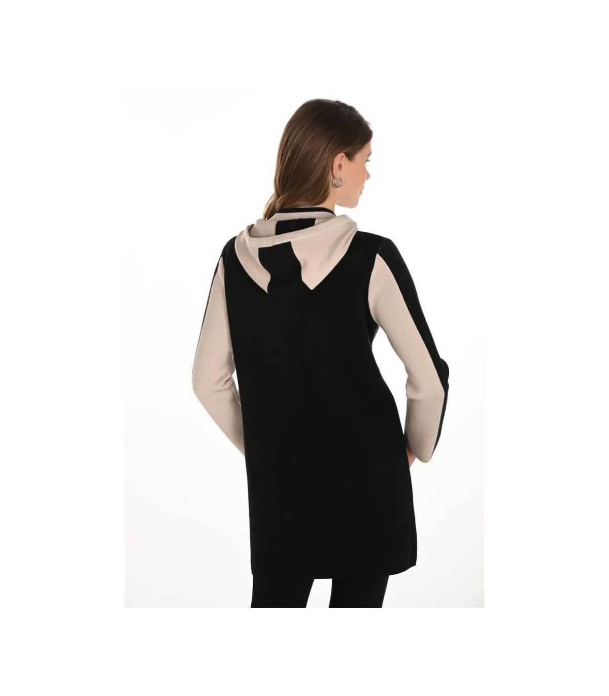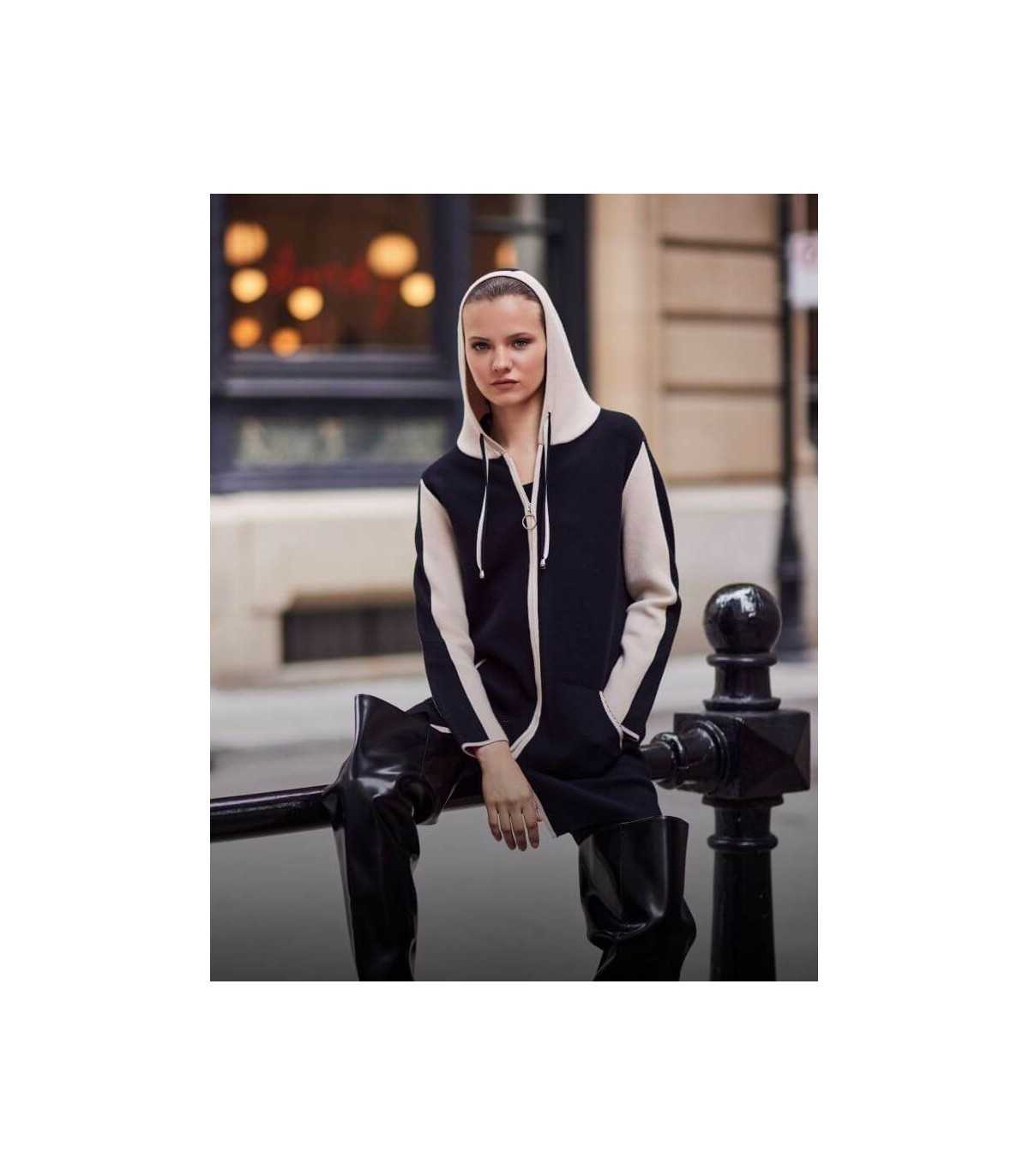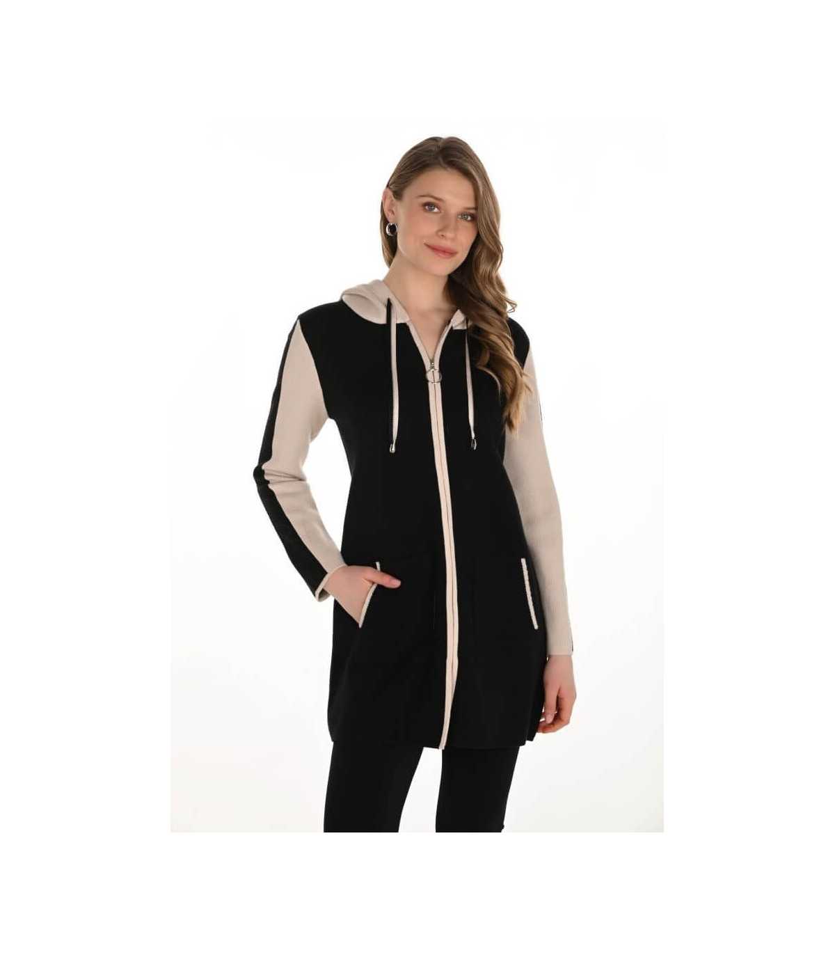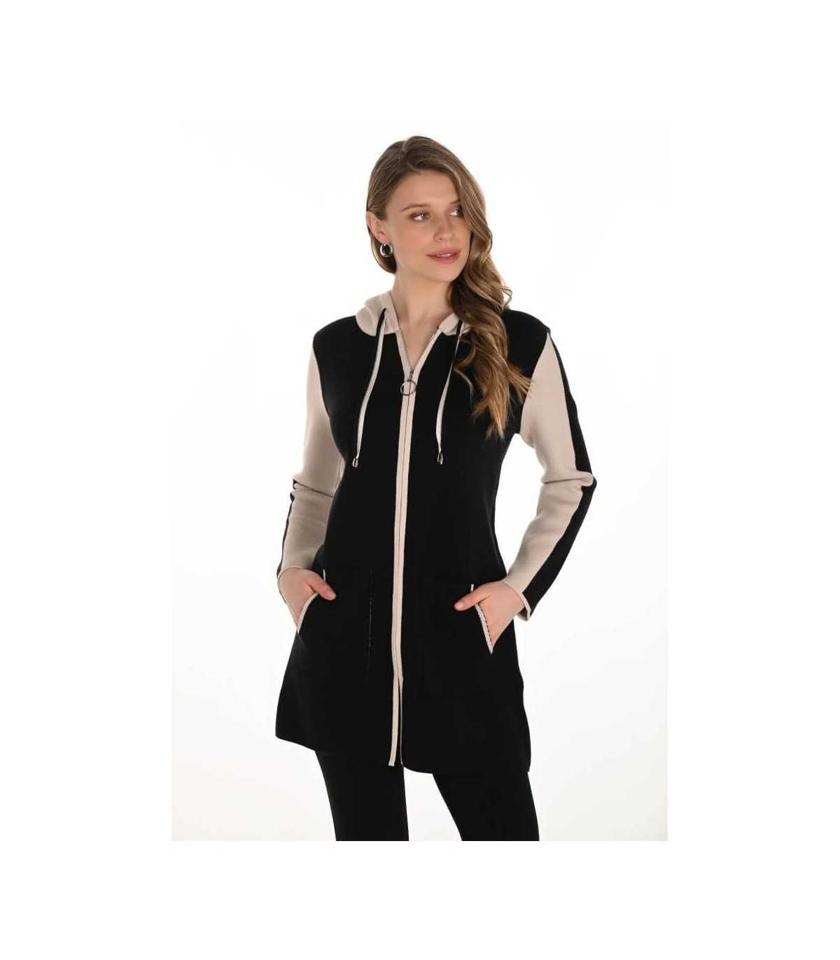 Chaqueta larga de punto en color negro y cenefa en beige, capucha con tirador de ajuste, bolsillos y cierre de cremallera, de la marca canadiense Frank Lyman.