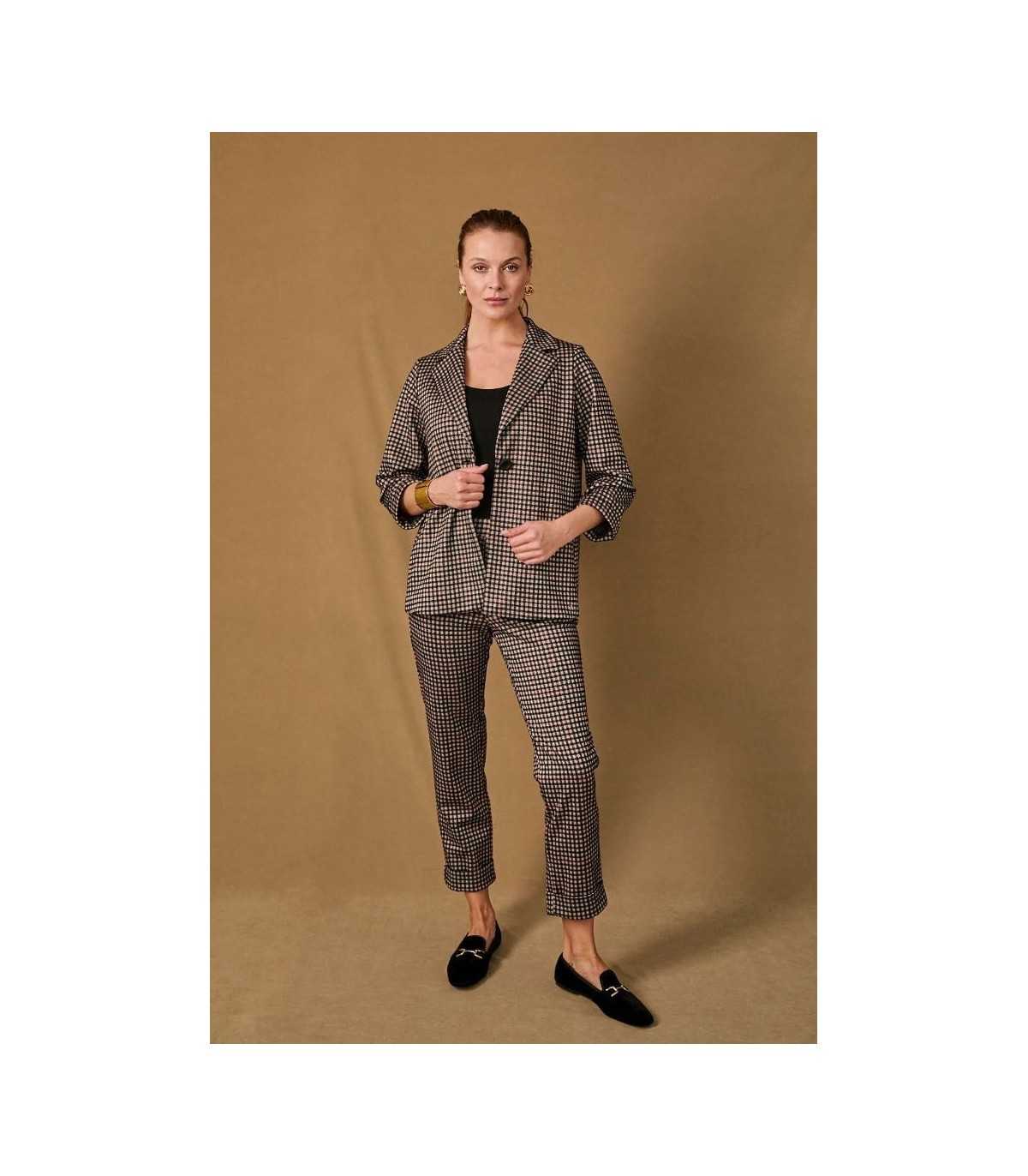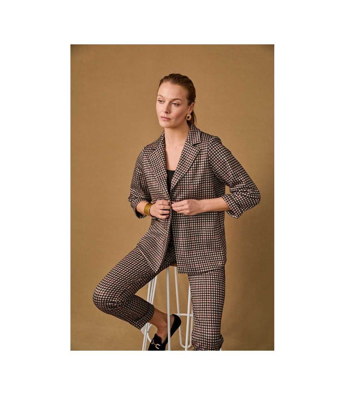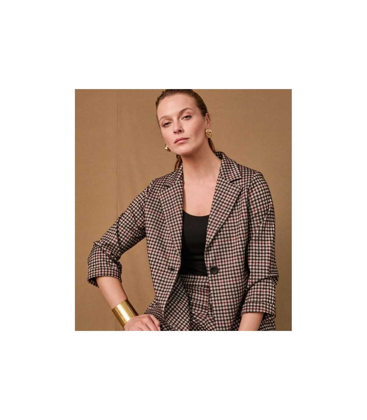 Chaqueta de cuadros en tono negro, beige y burdeos, línea recta, bolsillos laterales y cierre de un botón, de la marca española Anna Mora.