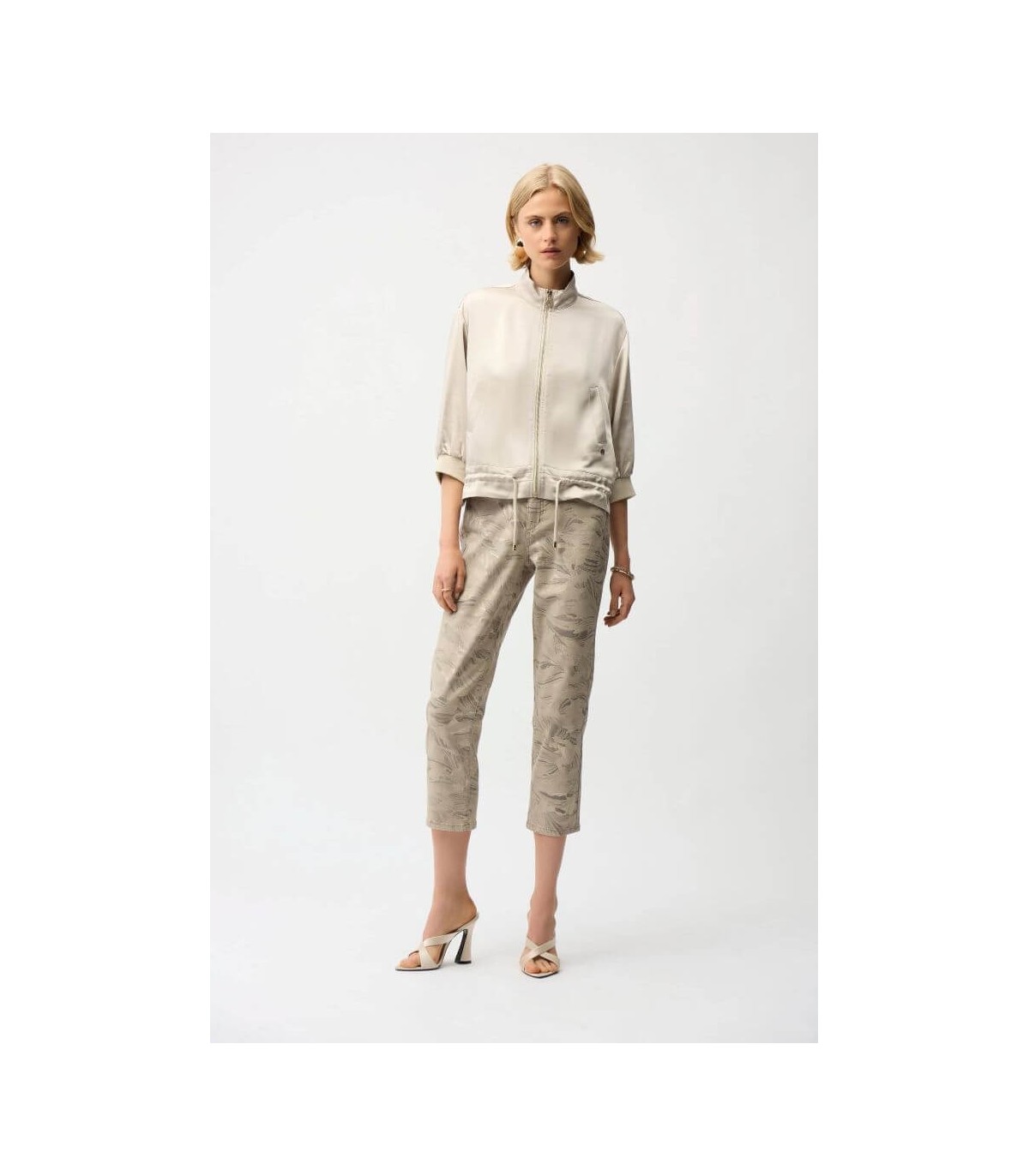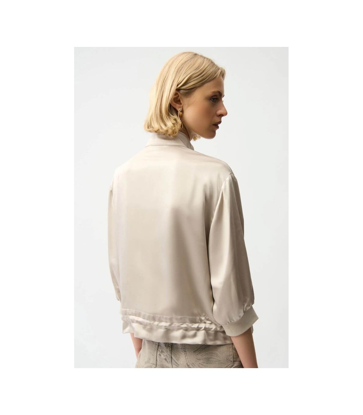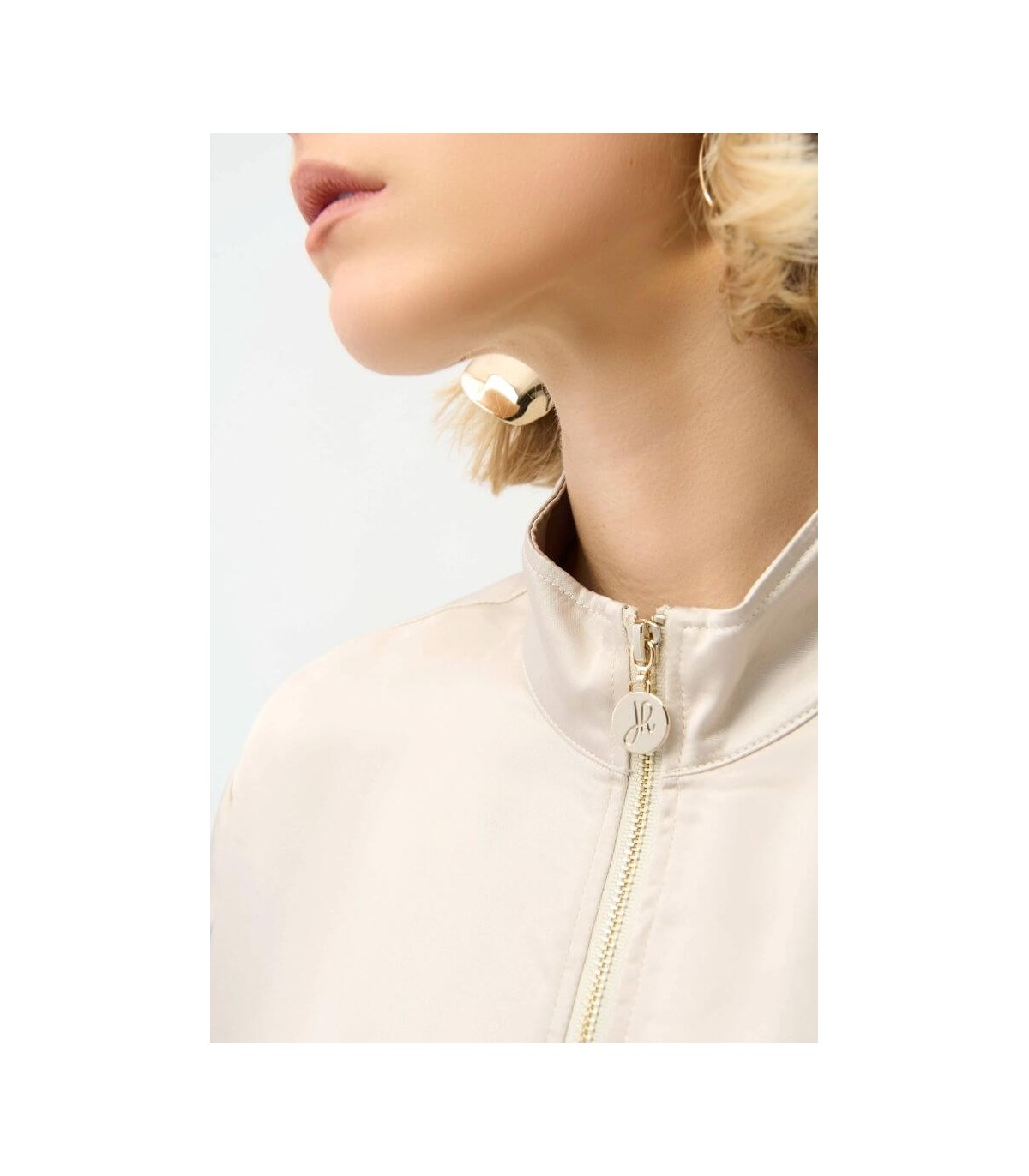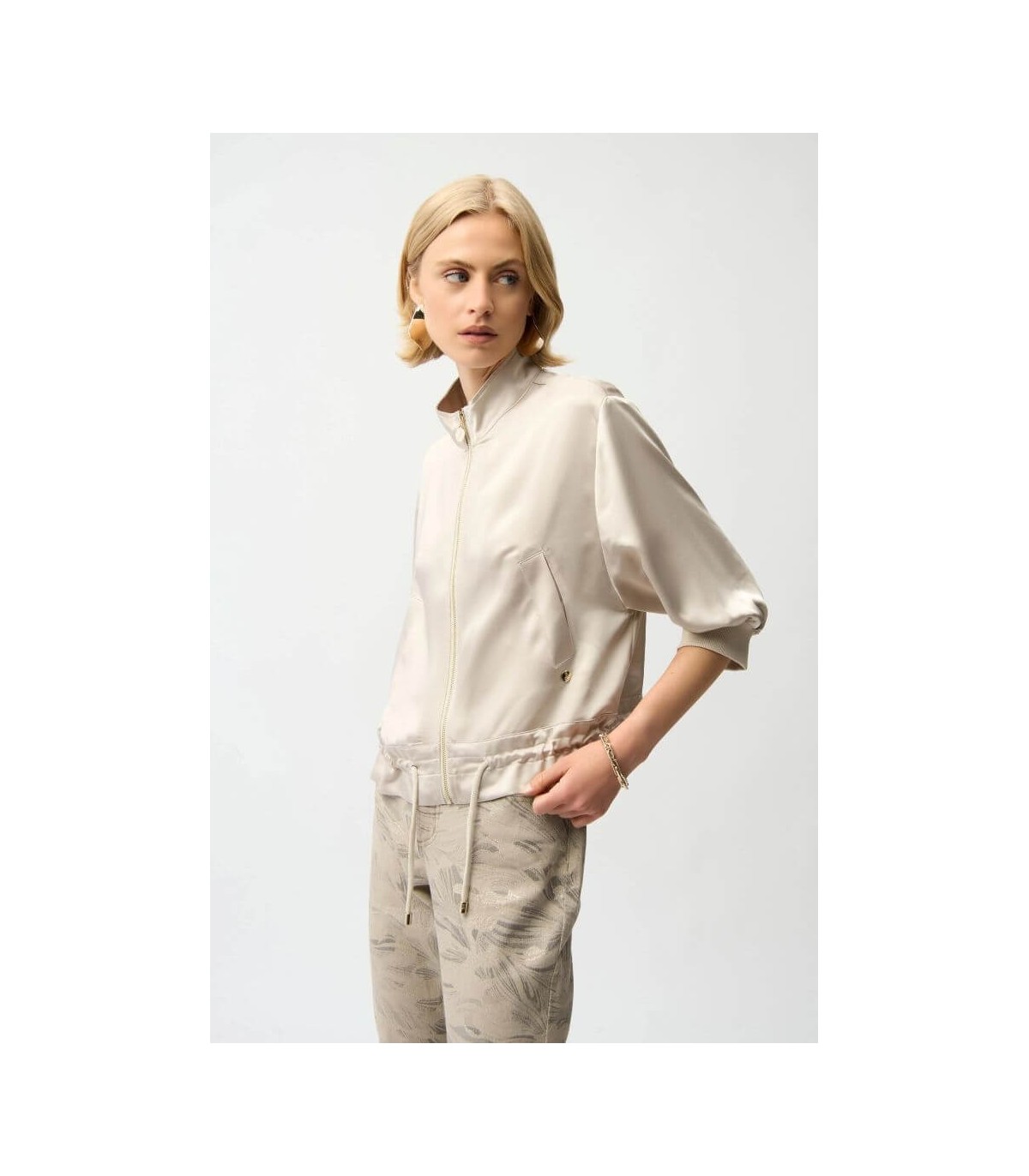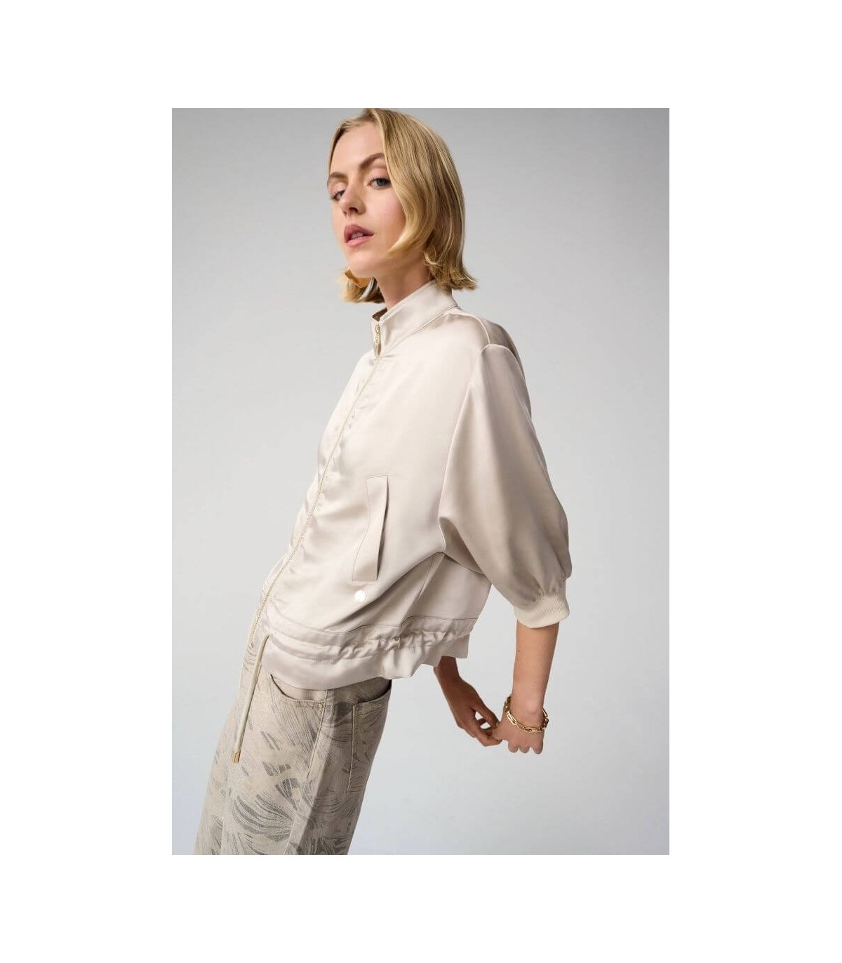 Chaqueta de tejido satén, color piedra, corte boxy, cuello chimenea, mangas tres cuartos con hombros caídos, puños de canalé, dobladillo con cordón y cierre frontal con cremallera, de la marca canadiense Joseph Ribkoff.