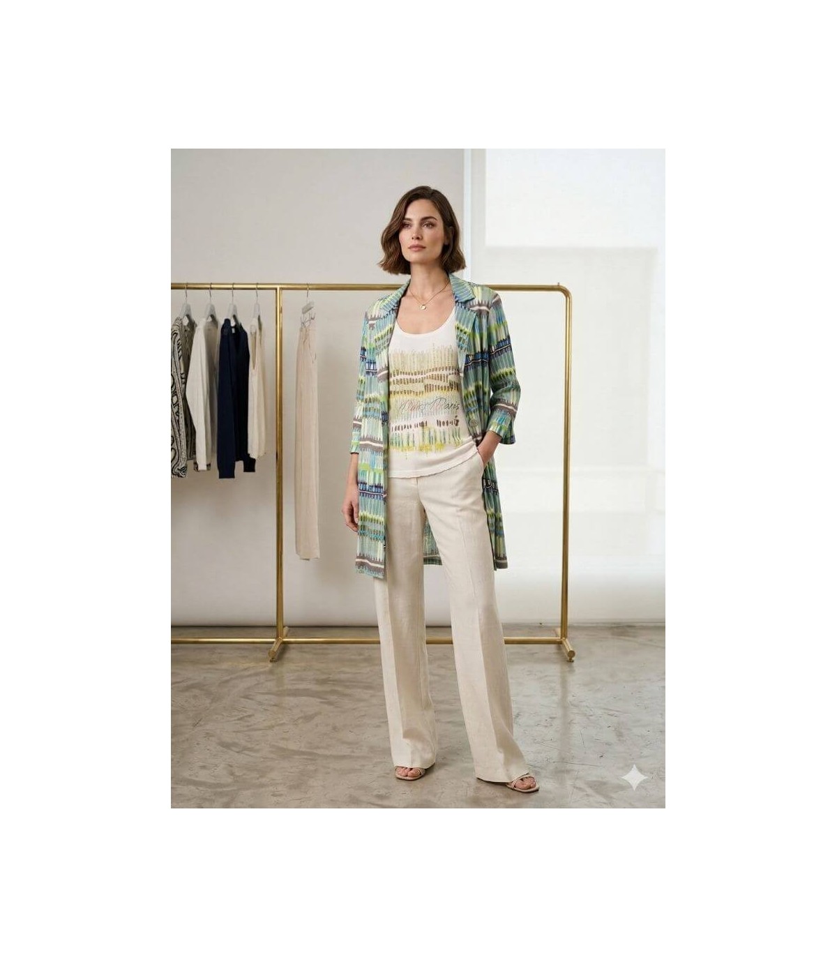 Chaqueta corte media pierna, línea recta con dos aberturas laterales, manga tres cuartos, bolsillos laterales, tejido punto de seda, estampado rayas en tonos verdes y cuello solapa, de la marca española Anna Mora.