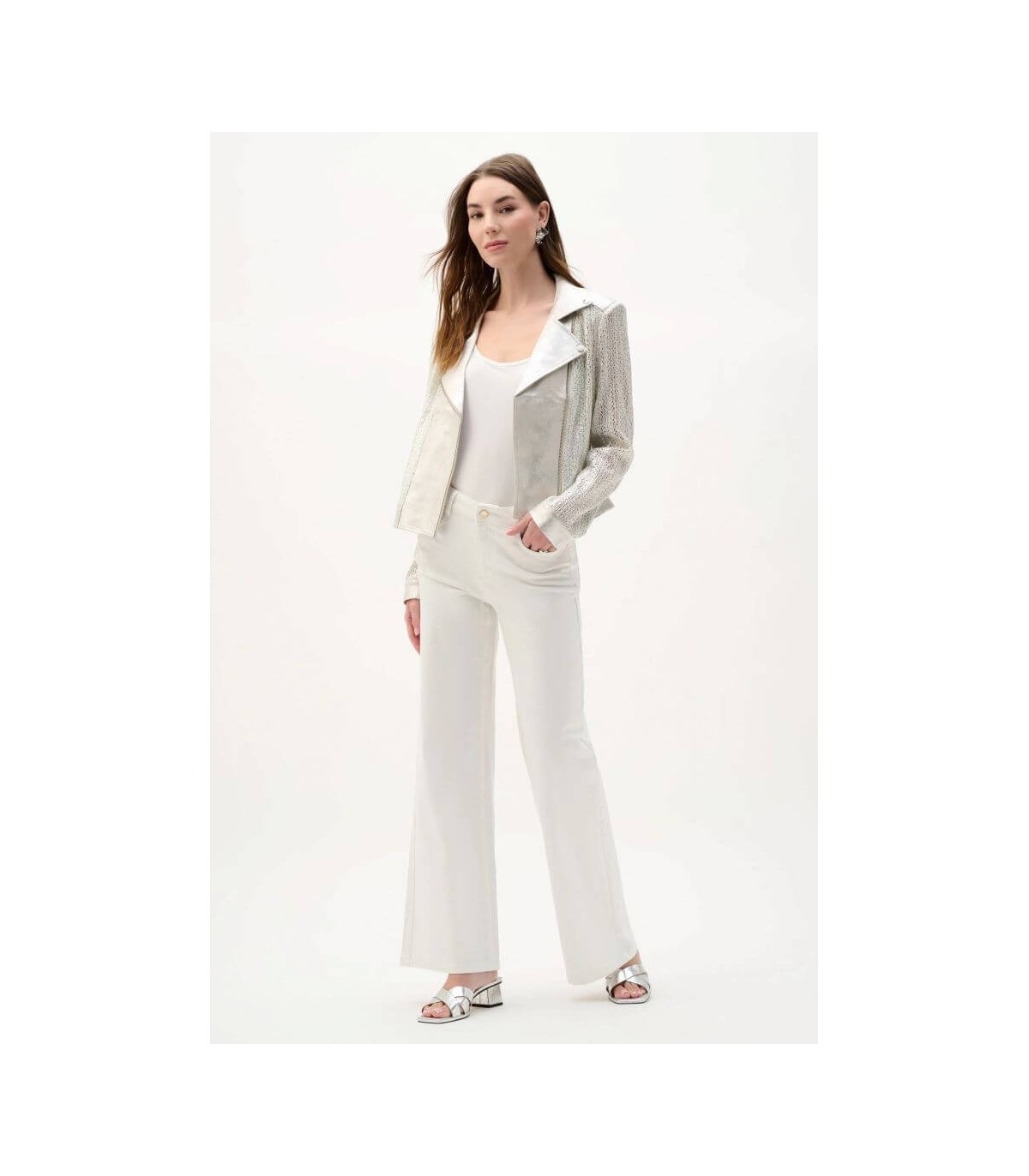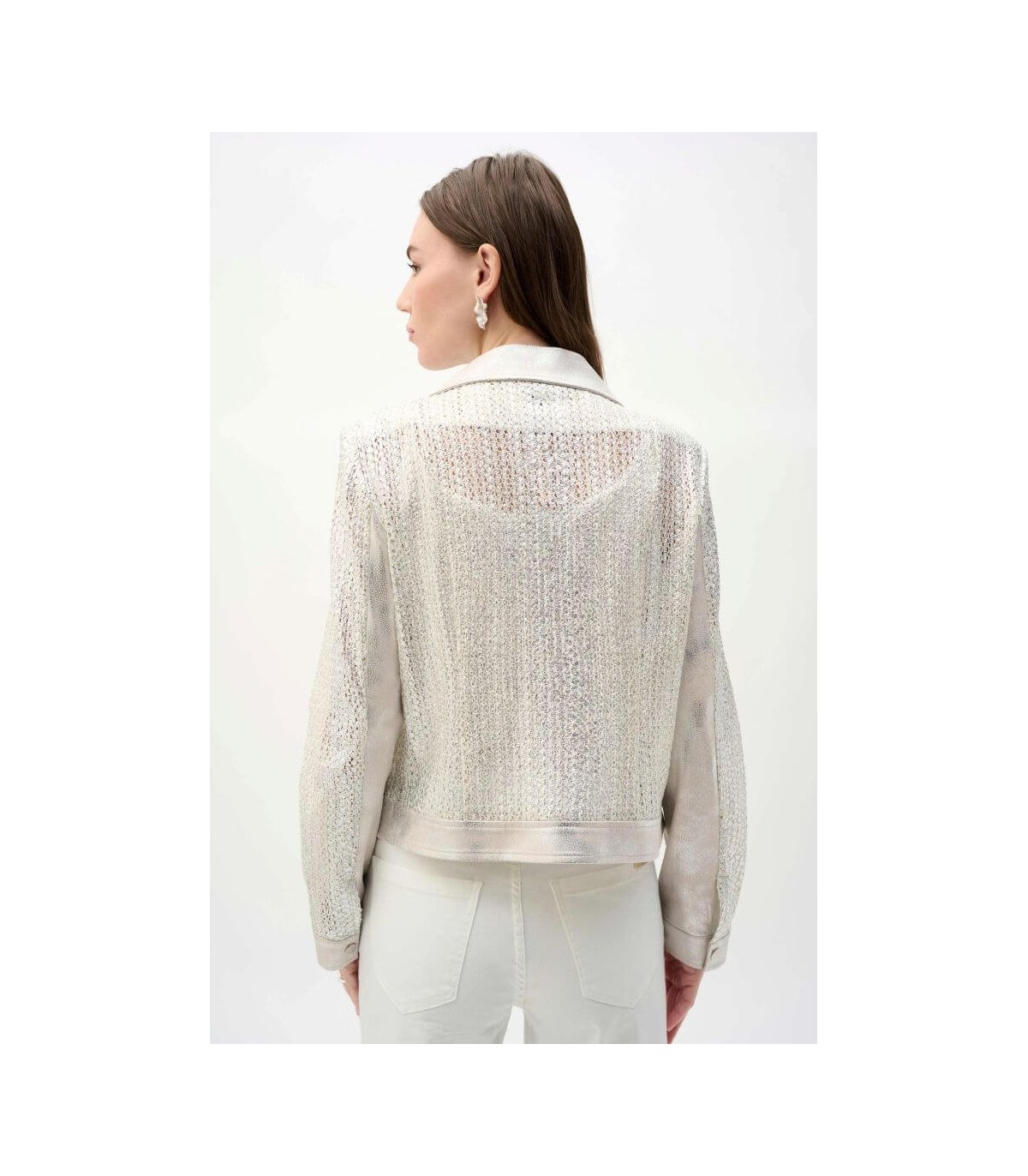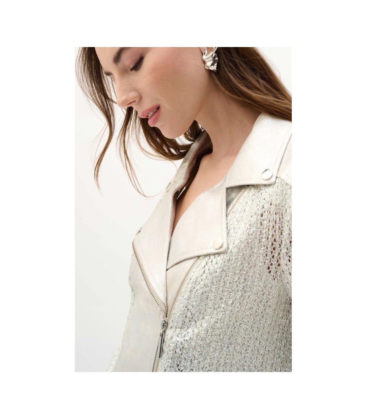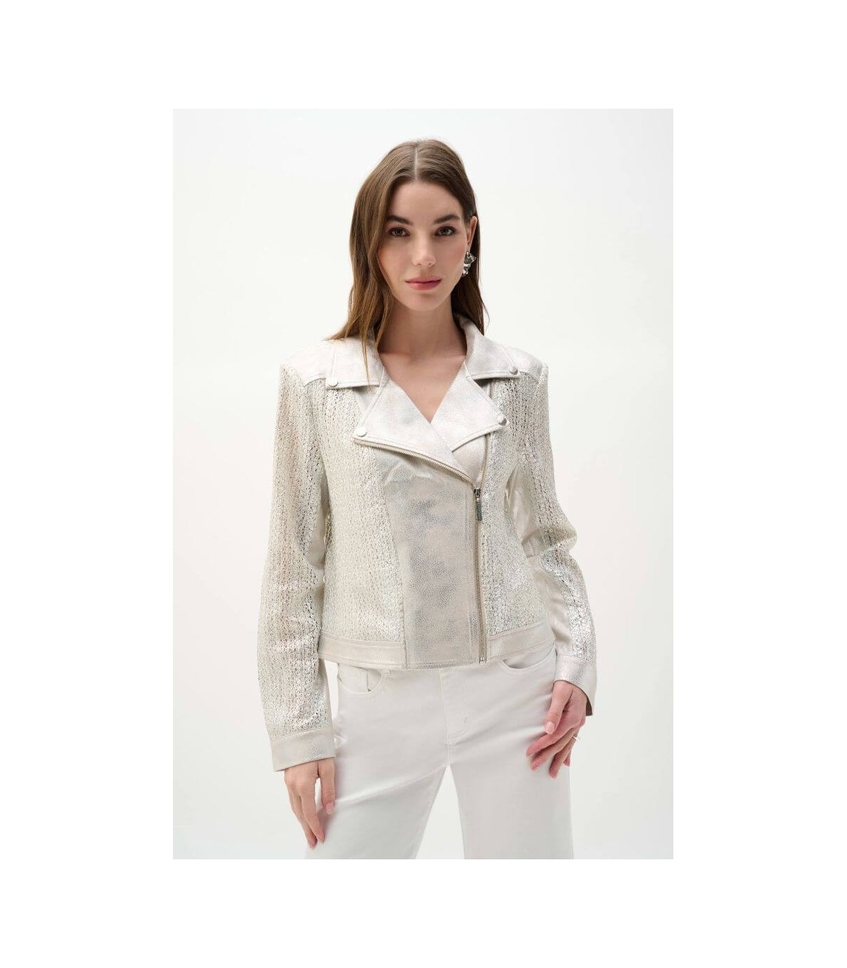 Chaqueta de ante sintético metalizado, color plata, cuello muesca, broches metálicos y cierre de cremallera, de la marca canadiense Joseph Ribkoff.