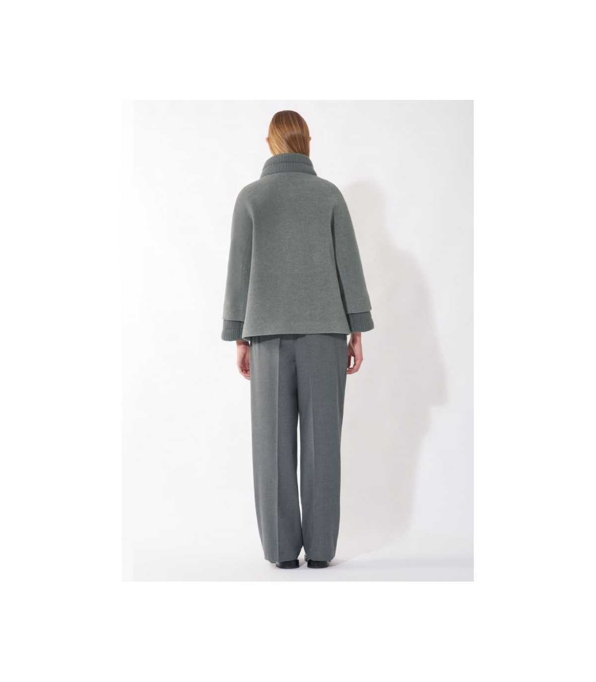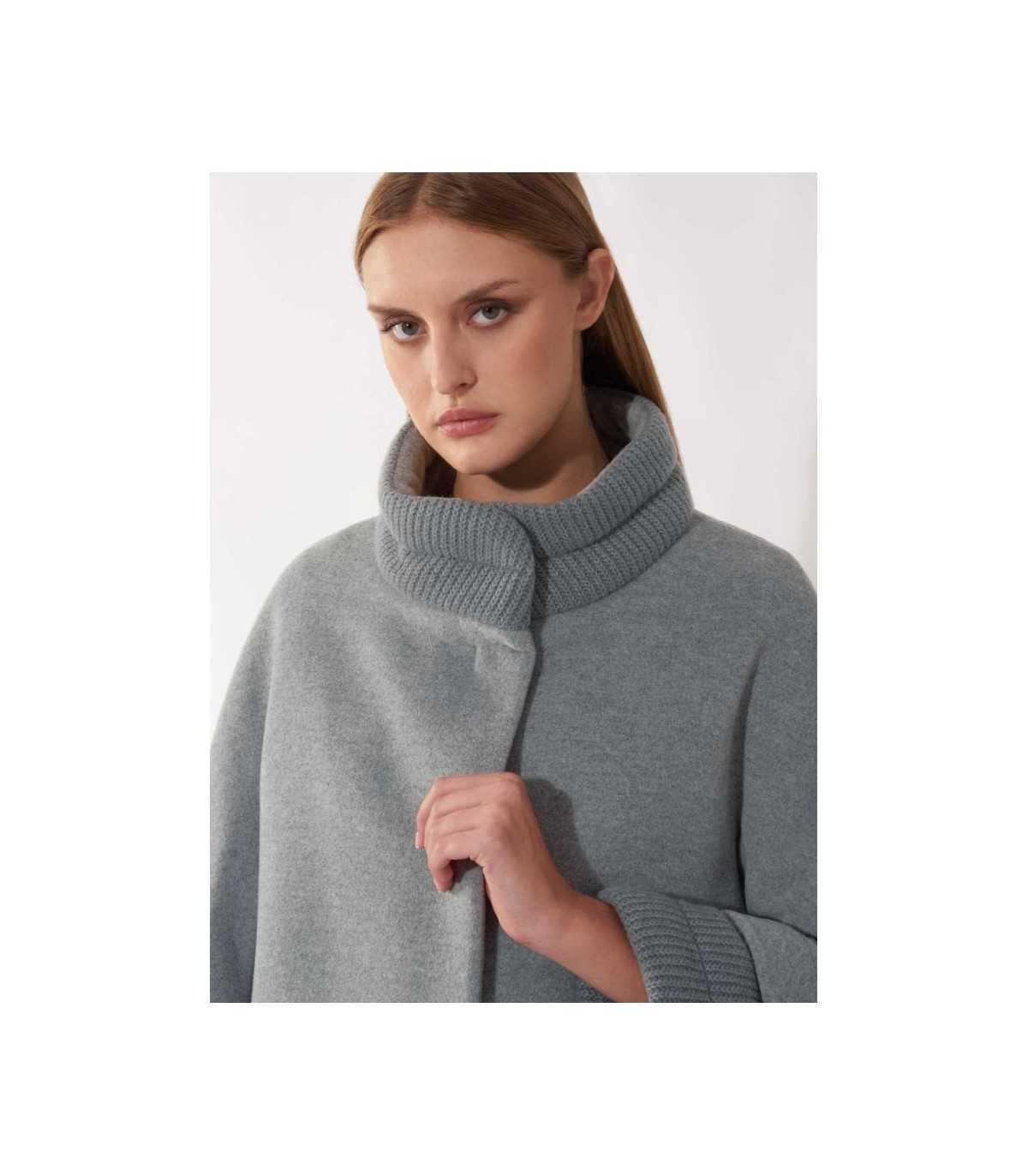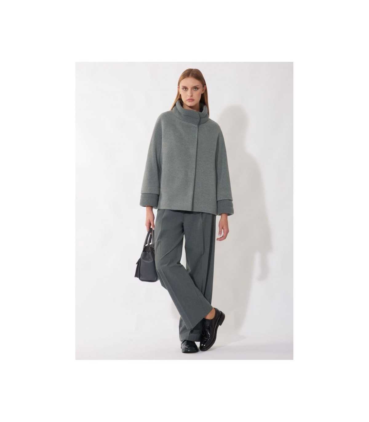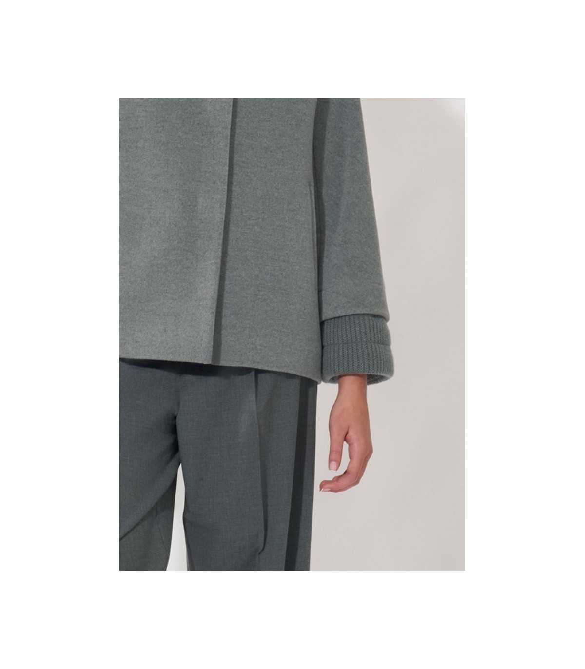Chaquetón corto de lana y cachemir en color gris claro con inserciones de punto acanalado, corte recto, cierre de cuatro botones con broches ocultos, cuello alto, manga ranglán, puños de punto, bolsillos laterales y forrado, de la marca italiana Cinzia Rocca.