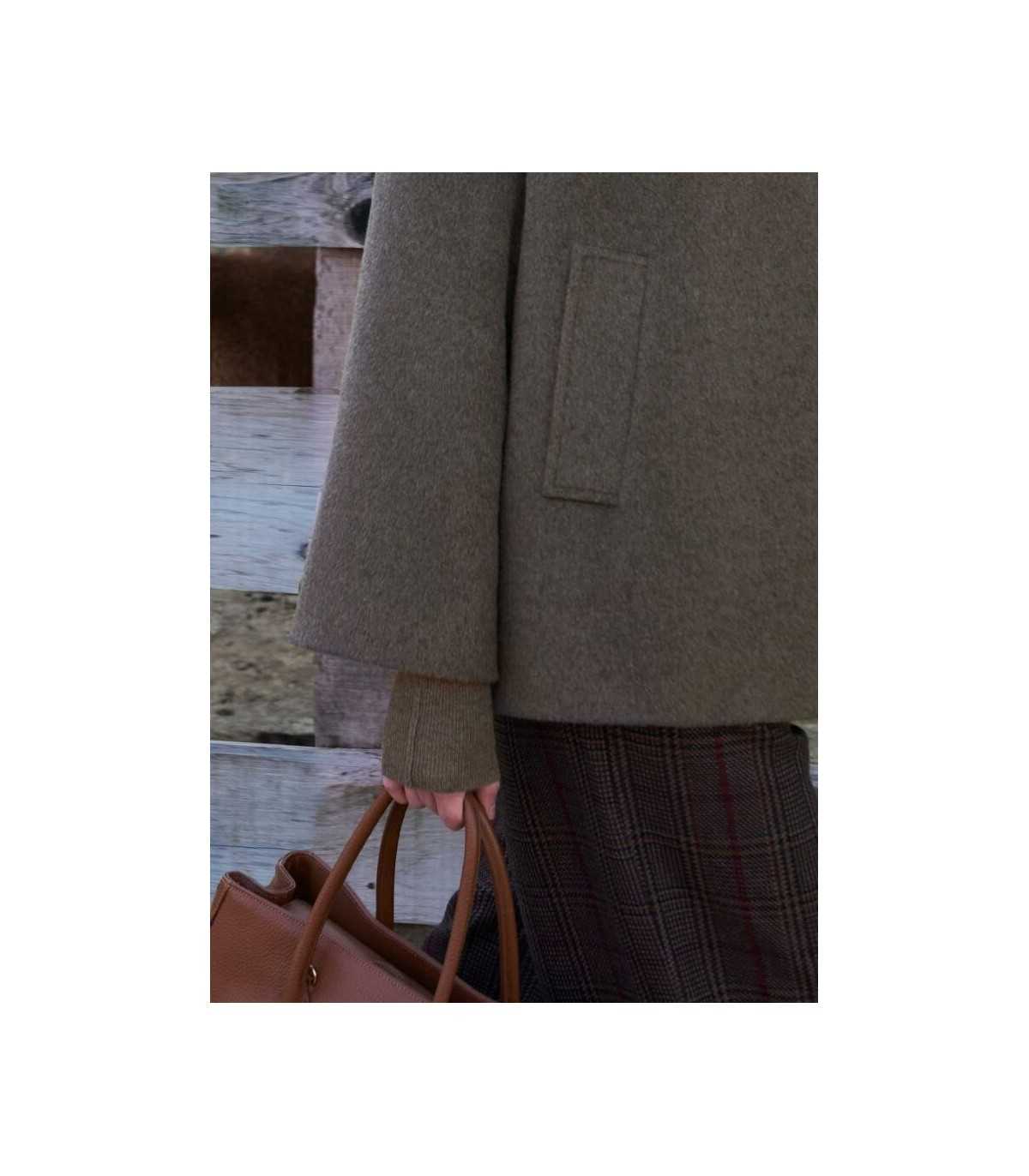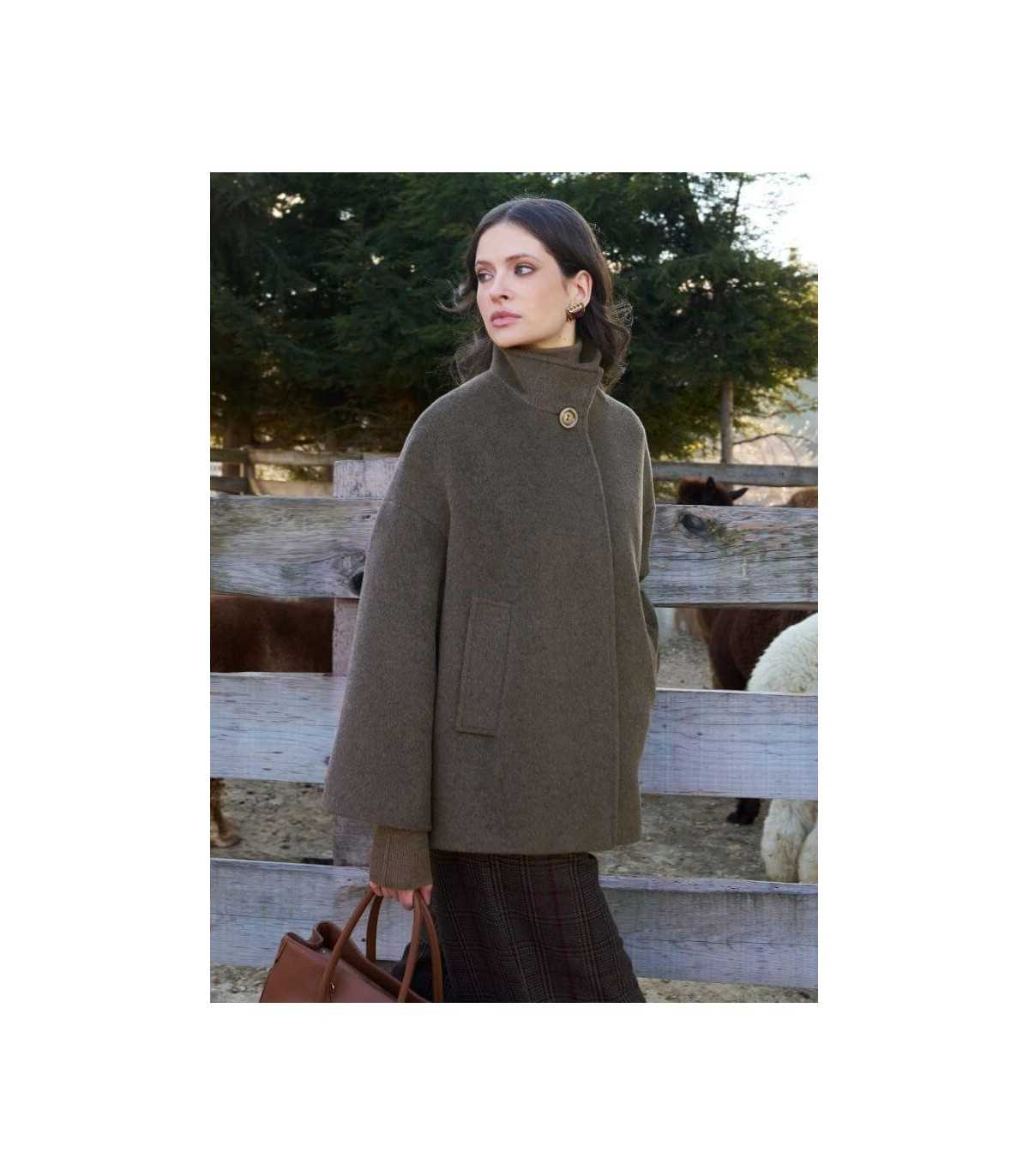 Chaquetón corto de lana color topo oscuro, ligeramente acampanado, manga caída, cuello alto, cierre con un botón visible y tres ocultos, bolsillos laterales y forrado, de la marca italiana Cinzia Rocca.