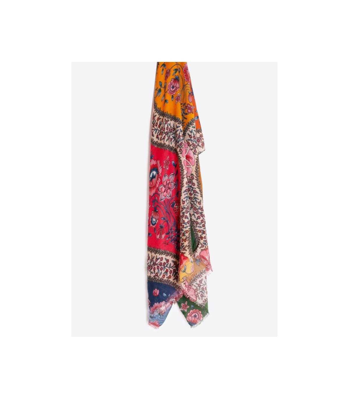 Chal rectangular con estampado floral simétrico en bloques de color azul, fucsia, verde, mostaza y coral, bordes sin flecos, caída fluida y ligera, de la marca española Vilagallo.