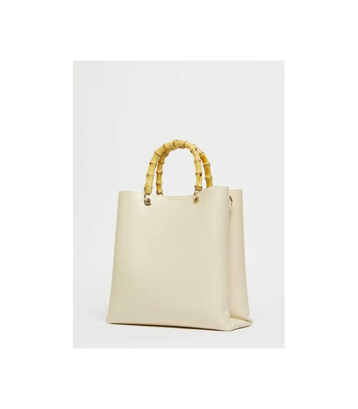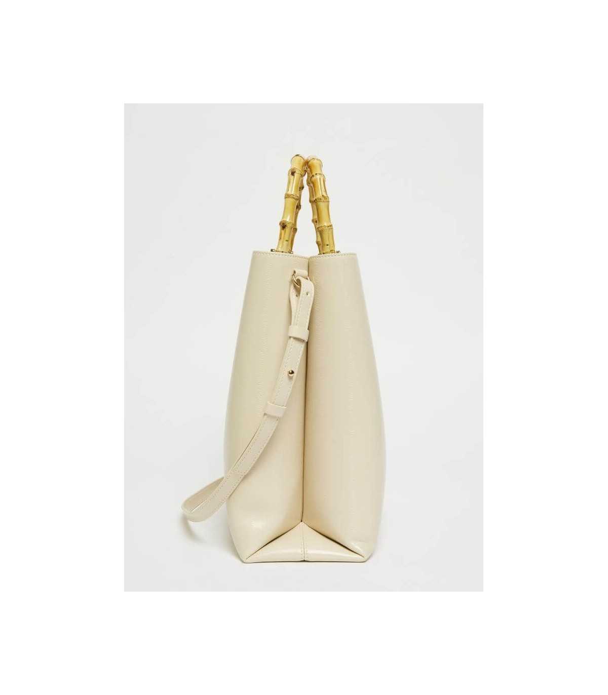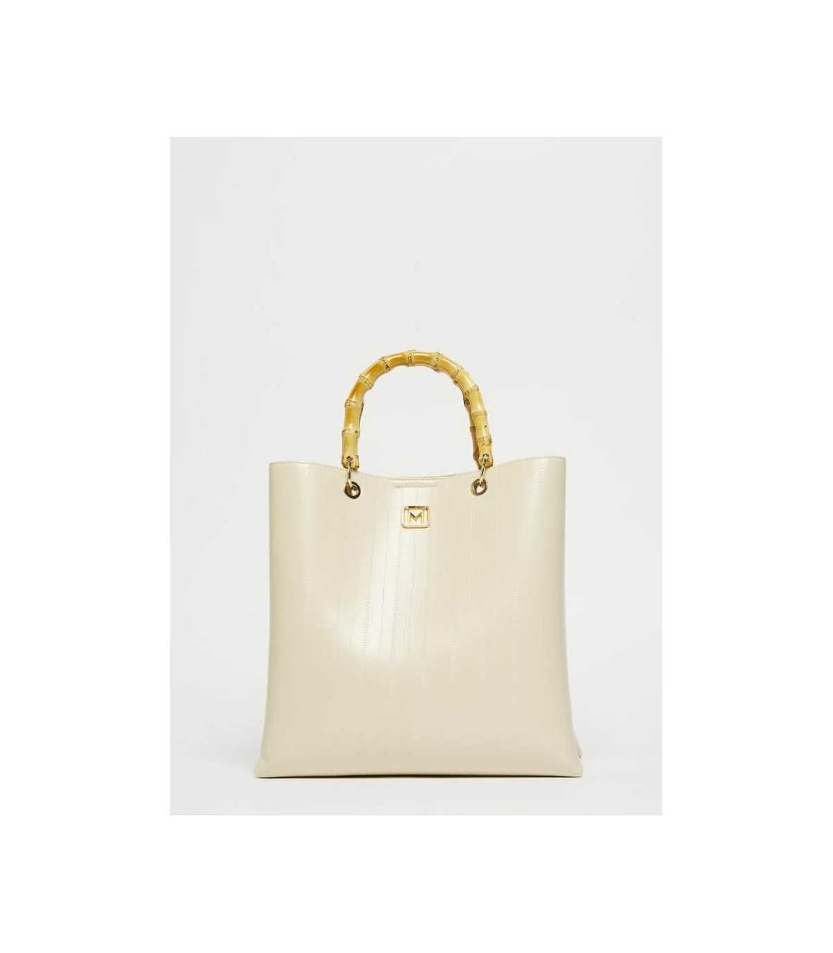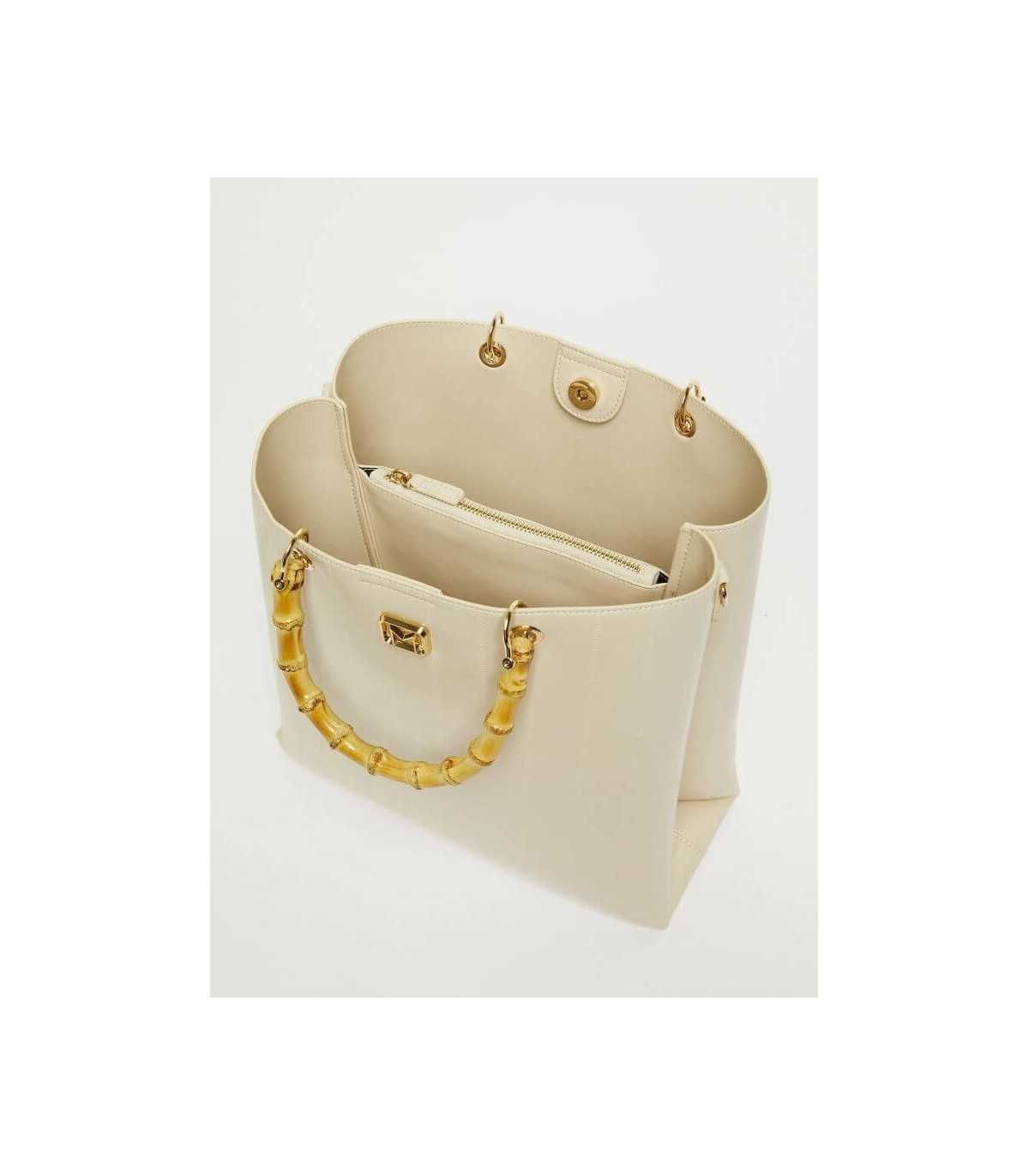 Bolso de compras con estampado de reptil, color marfil, división interna con un bolsillo con cremallera, doble asa de bambú y detalle de logotipo de metal con acabado dorado, de la marca italiana Marella.