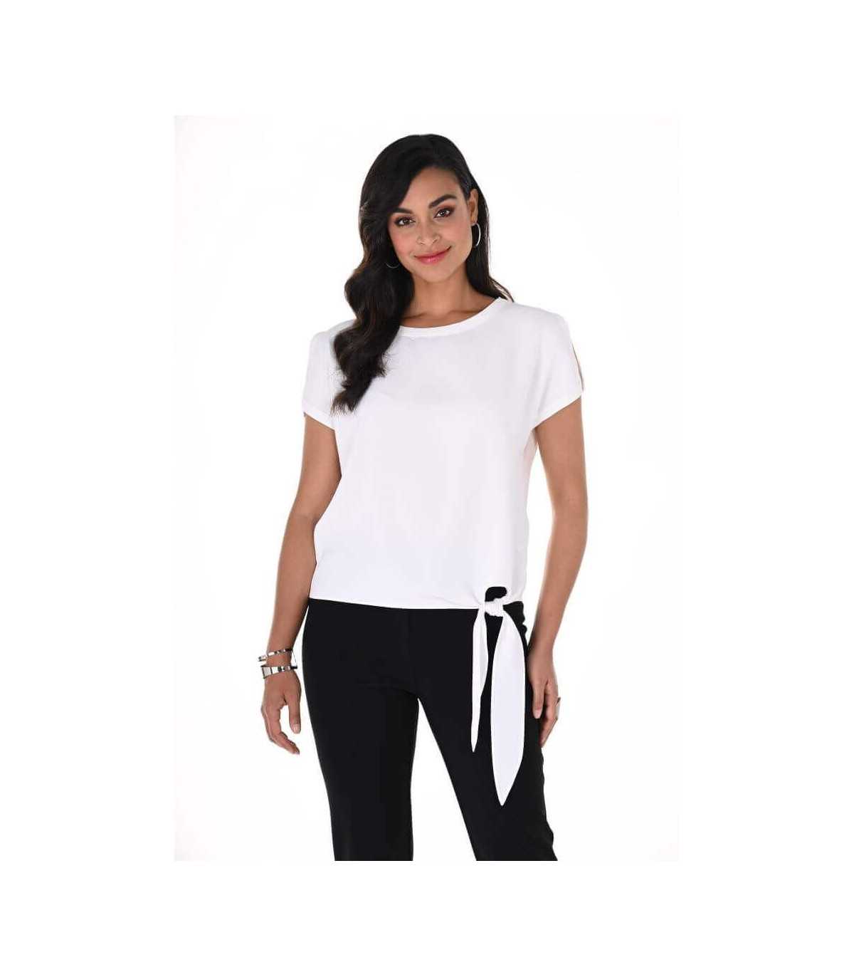 Top manga caída con abertura, color blanco y ajuste de lazo en el bajo, de la marca canadiense Frank Lyman.