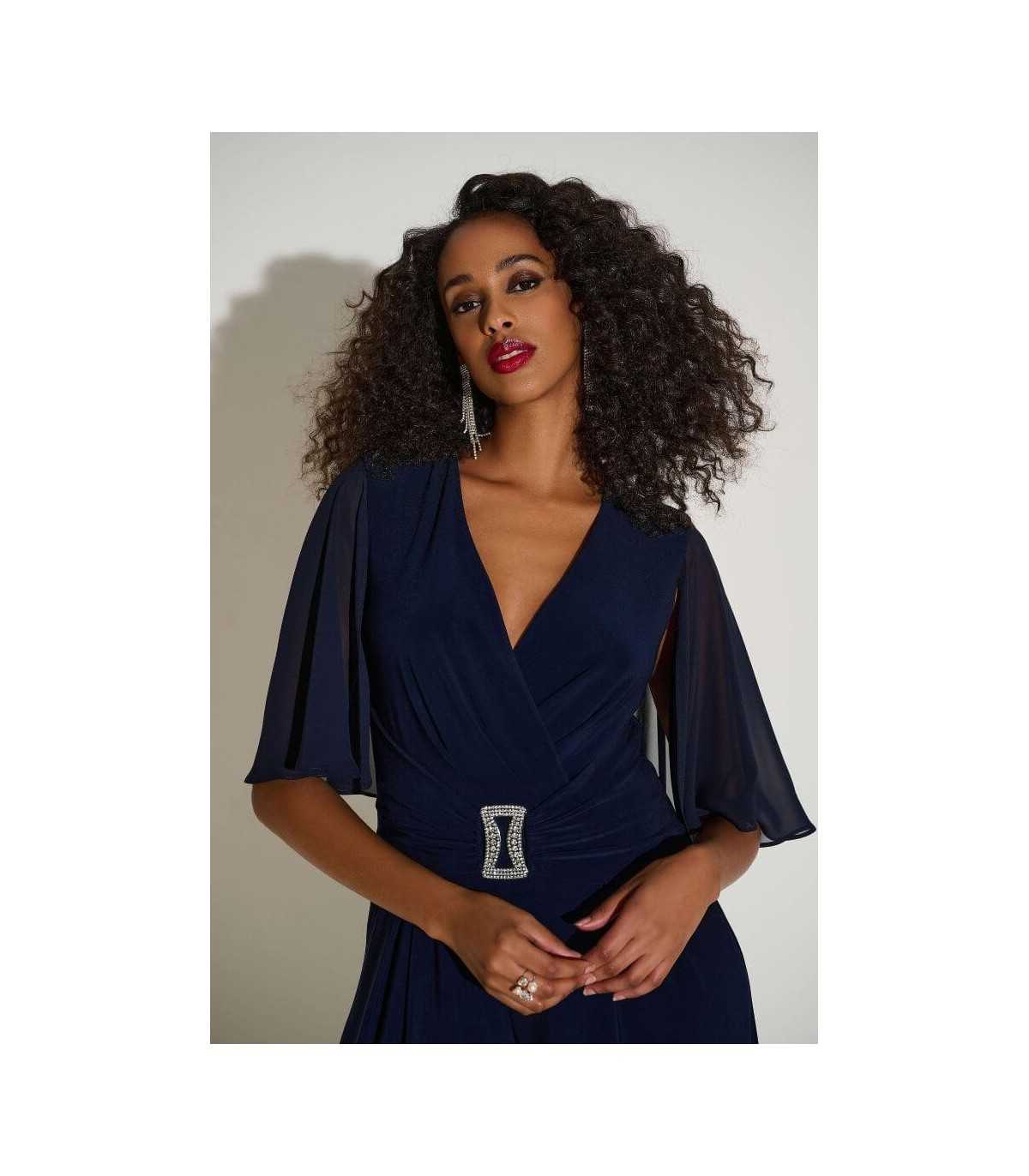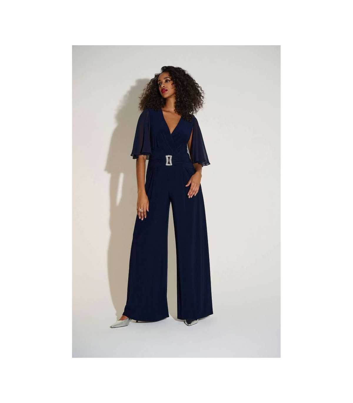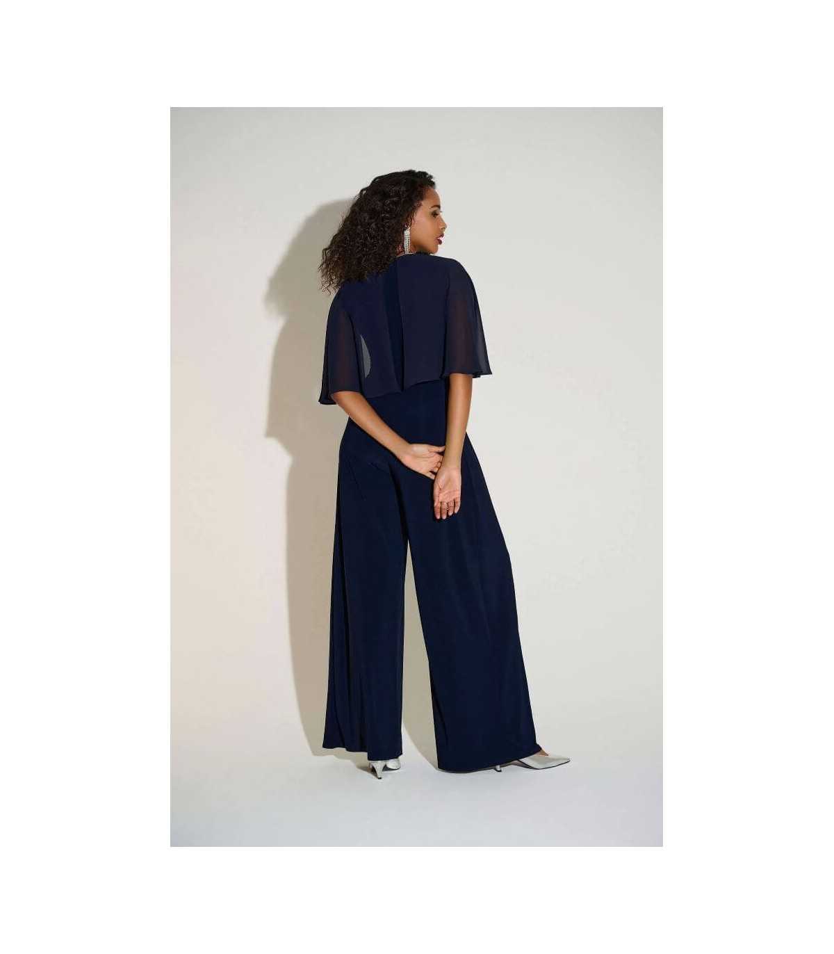 Mono en tejido punto de seda, color azul marino, pernera ancha, mangas de gasa y escote cruzado con detalle de pedrería, de la marca canadiense Joseph Ribkoff.