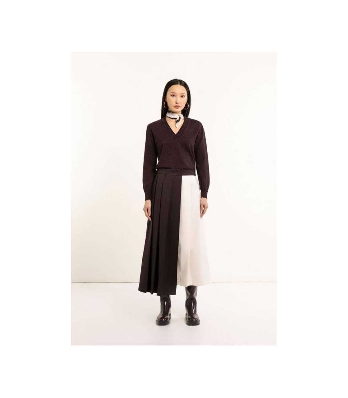 Suéter en tejido punto de lurex, en color negro, cuello de pico y dos aberturas laterales en la terminación del bajo, de la marca italiana Maria Bellentani.