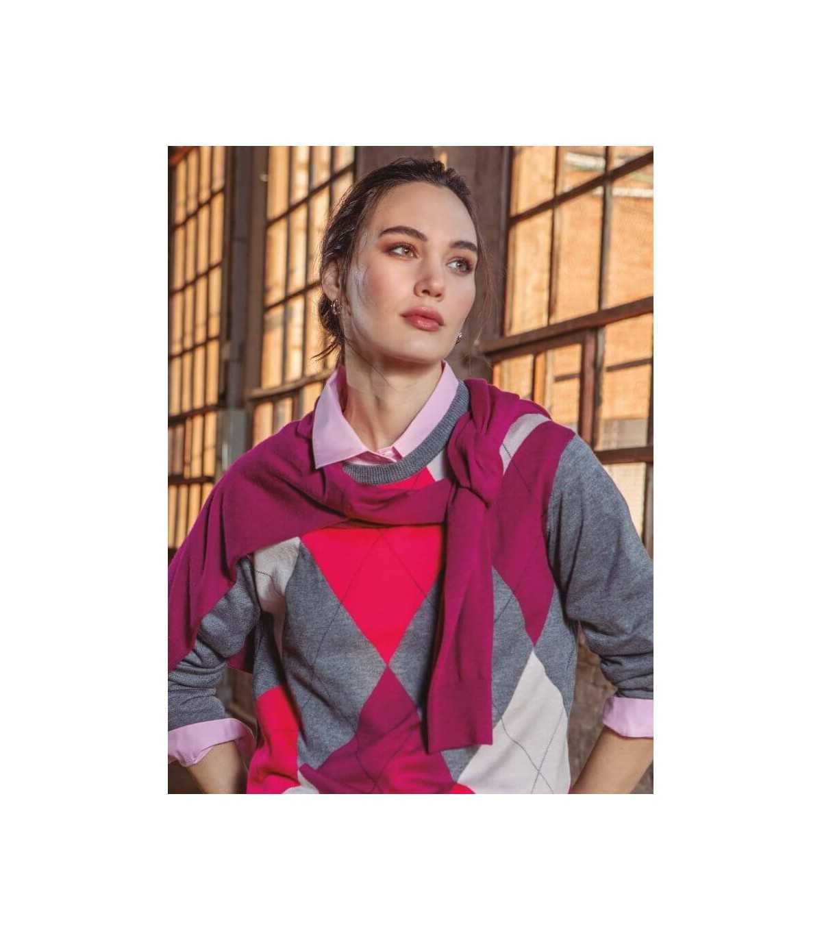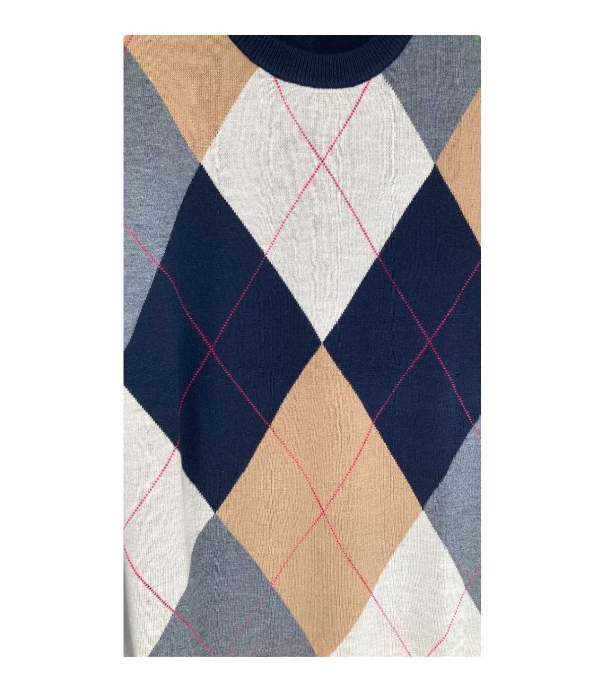 Suéter en color azul marino con detalle de rombos en la parte delantera en color camel, gris y crudo, cuello redondeado y manga larga, de la marca española Trovels.