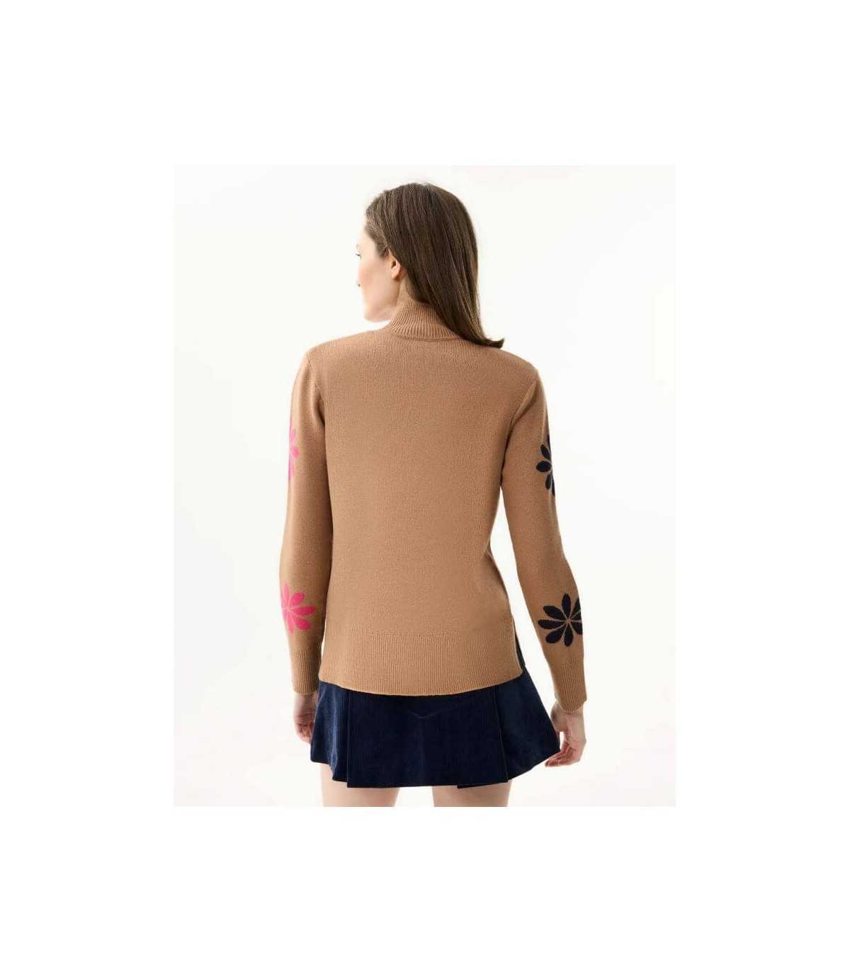 Suéter de punto en color fucsia con espalda en tono beige, las mangas combinan bloques en naranja, fucsia y azul marino, cuello redondo de canalé en naranja, puños y bajo en beige y marino y corte recto con hombro...