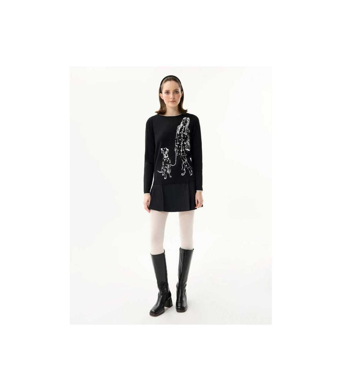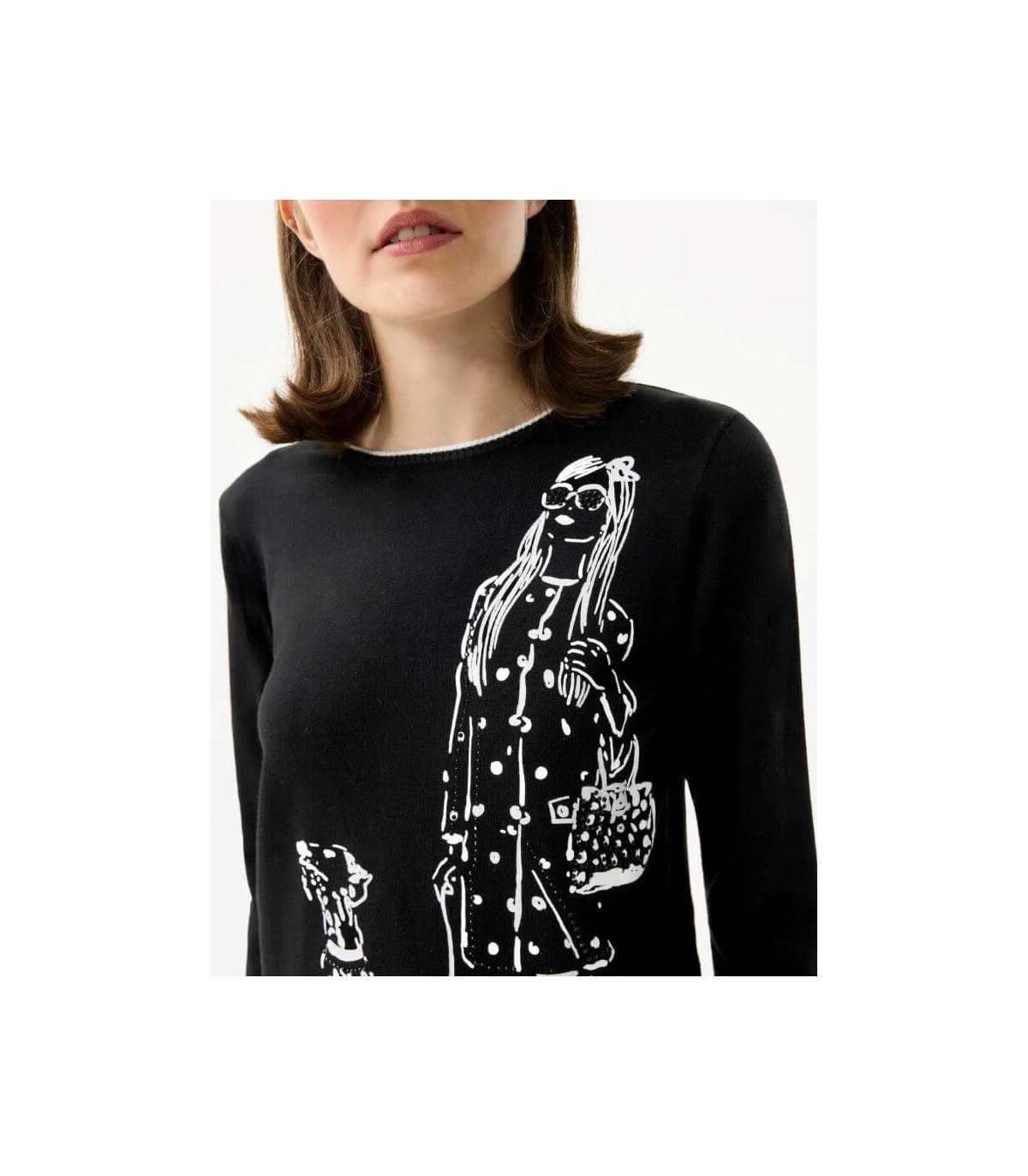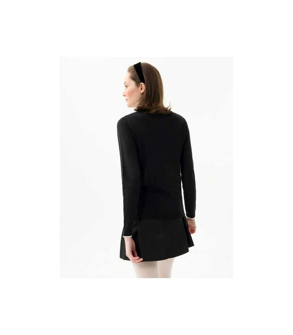 Suéter color negro con rayas centrales multicolor, cuello medio con abertura de cremallera, de la marca española Aldo Martins.Composición: 69% viscosa, 29% acrílico, 2% elastano.