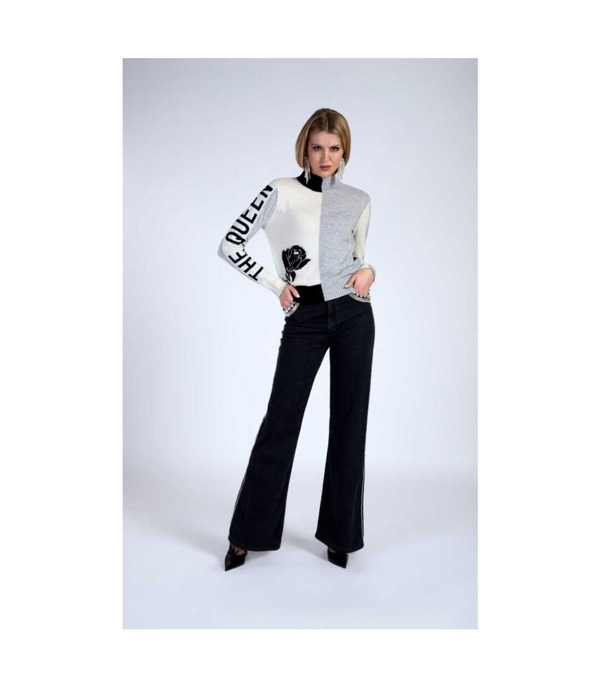 Suéter combinado en color crudo y gris perla con dibujo de flor y letras en color negro, cuello chimenea y manga larga, de la marca italiana Laftylie.