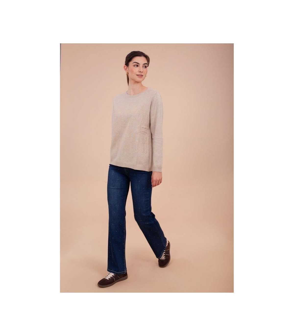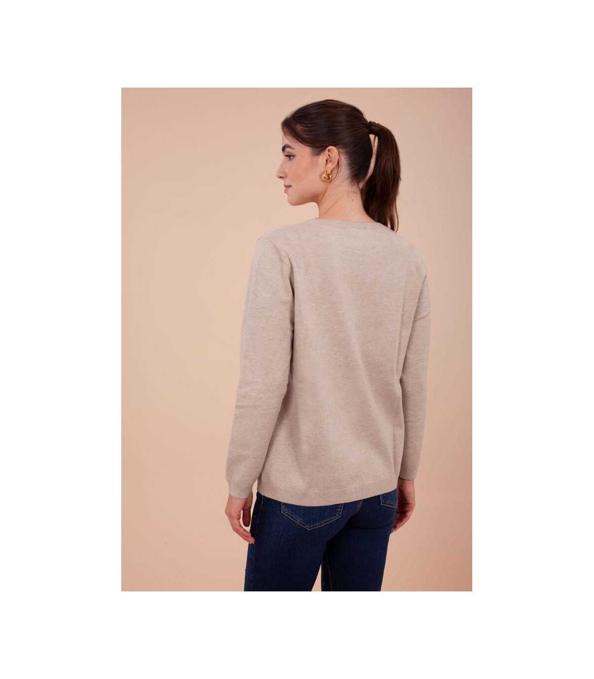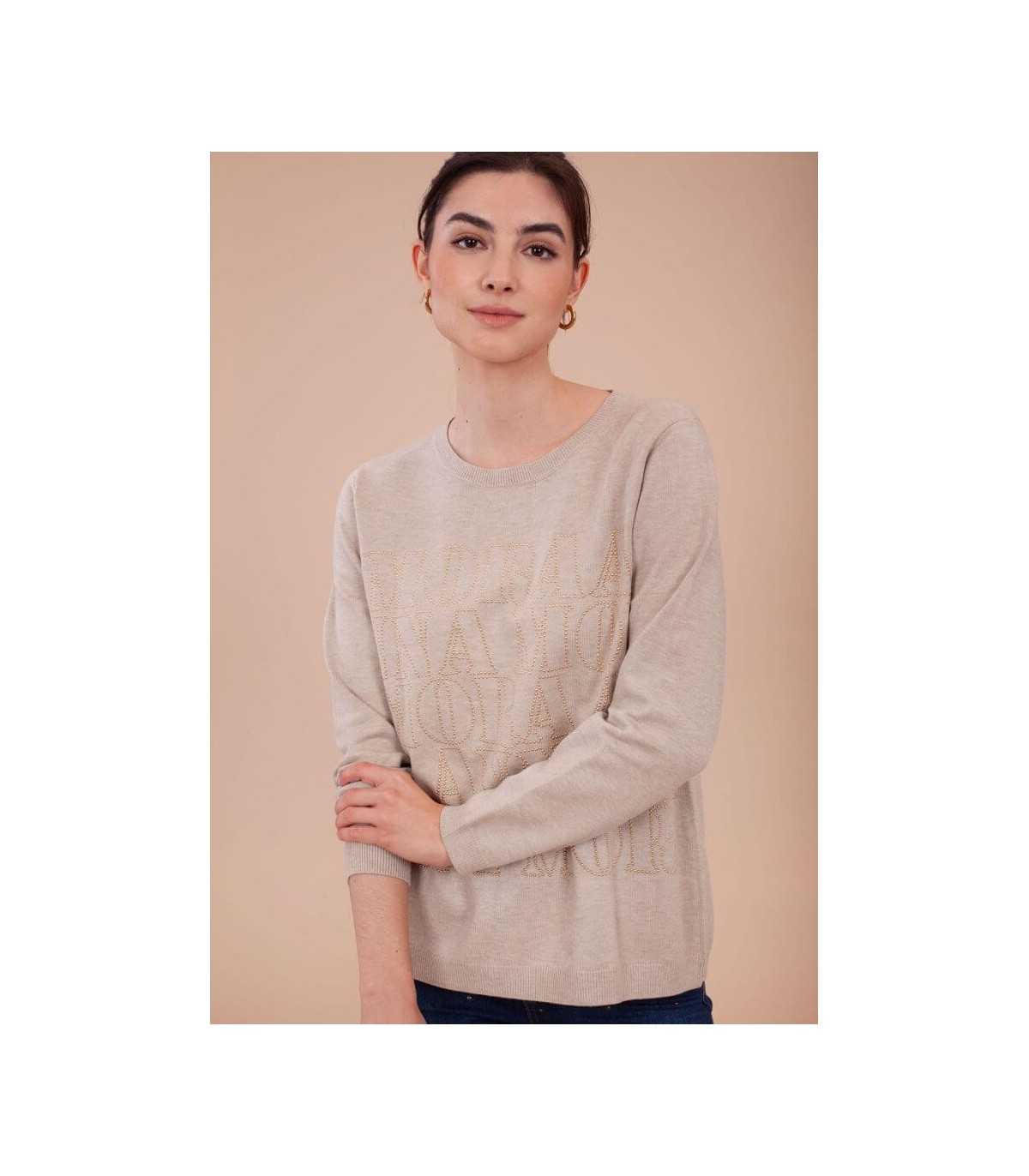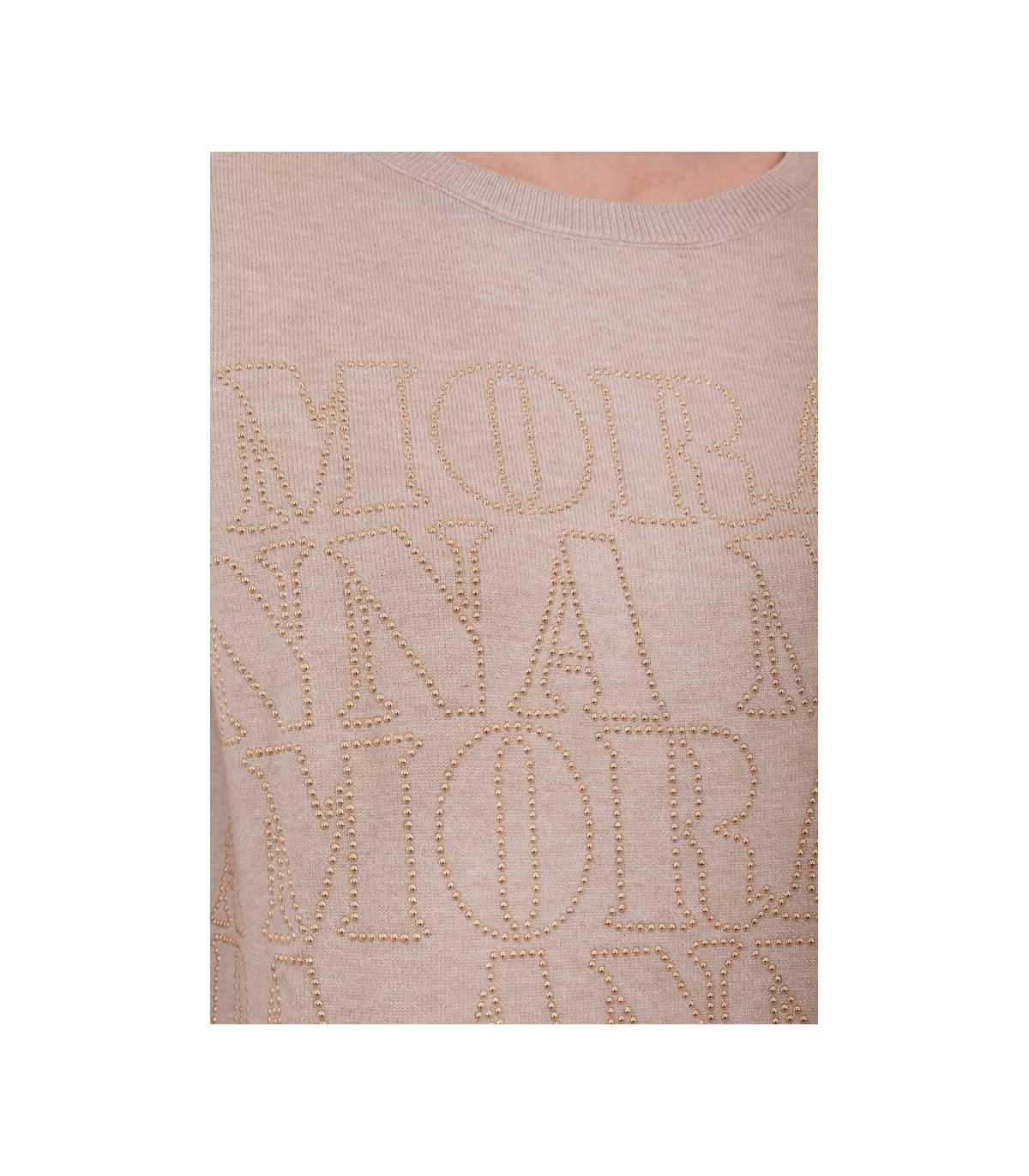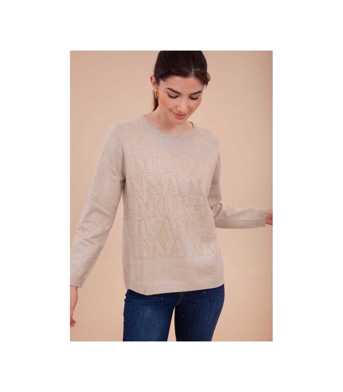 Suéter de punto fino, color beige, cuello redondo, manga larga y detalle de apliques dorados con el texto "Anna Mora", de la marca española Anna Mora.