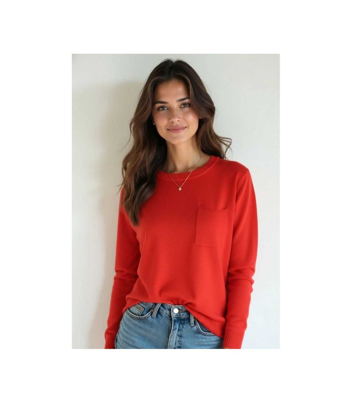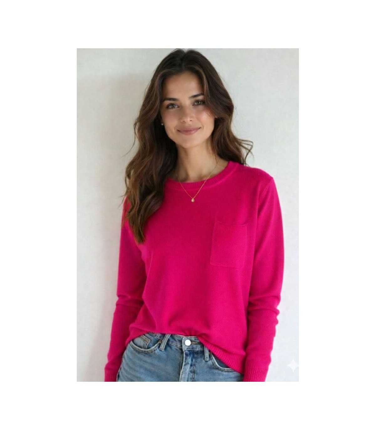 Suéter básico, cuello redondeado, un bolsillo a la altura del pecho, dos pequeñas aberturas laterales en la terminación del bajo y manga larga, de la marca española Trovels.