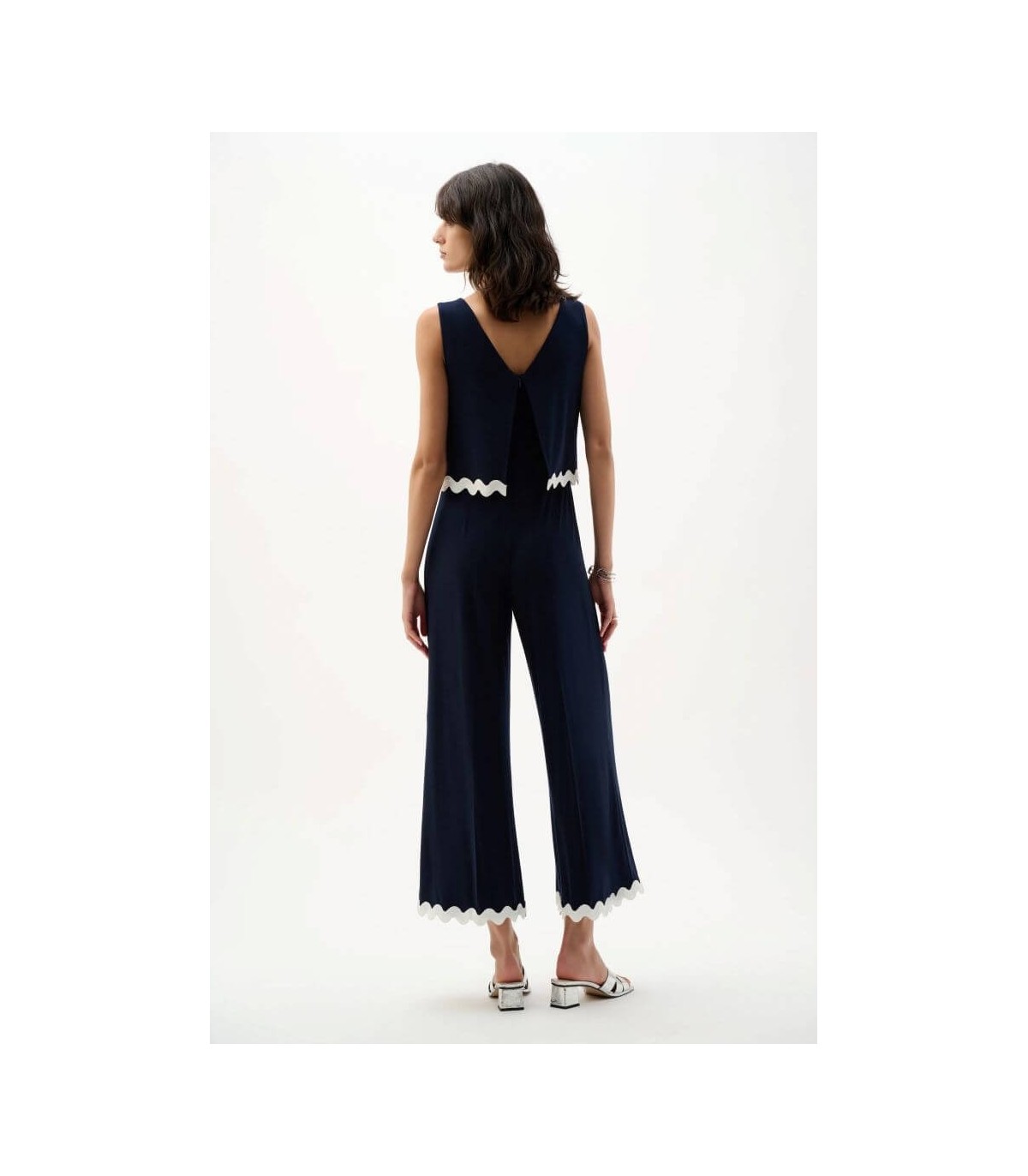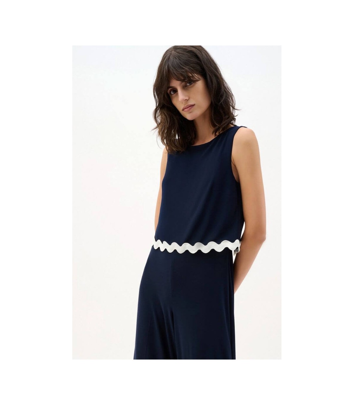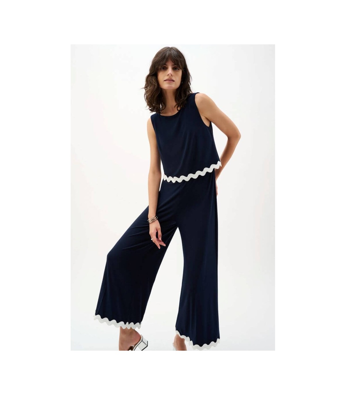 Mono tipo culotte sin mangas, punto de seda color marino con ribete en contraste, cuello barca y corpiño en capas, de la marca canadiense Joseph Ribkoff.