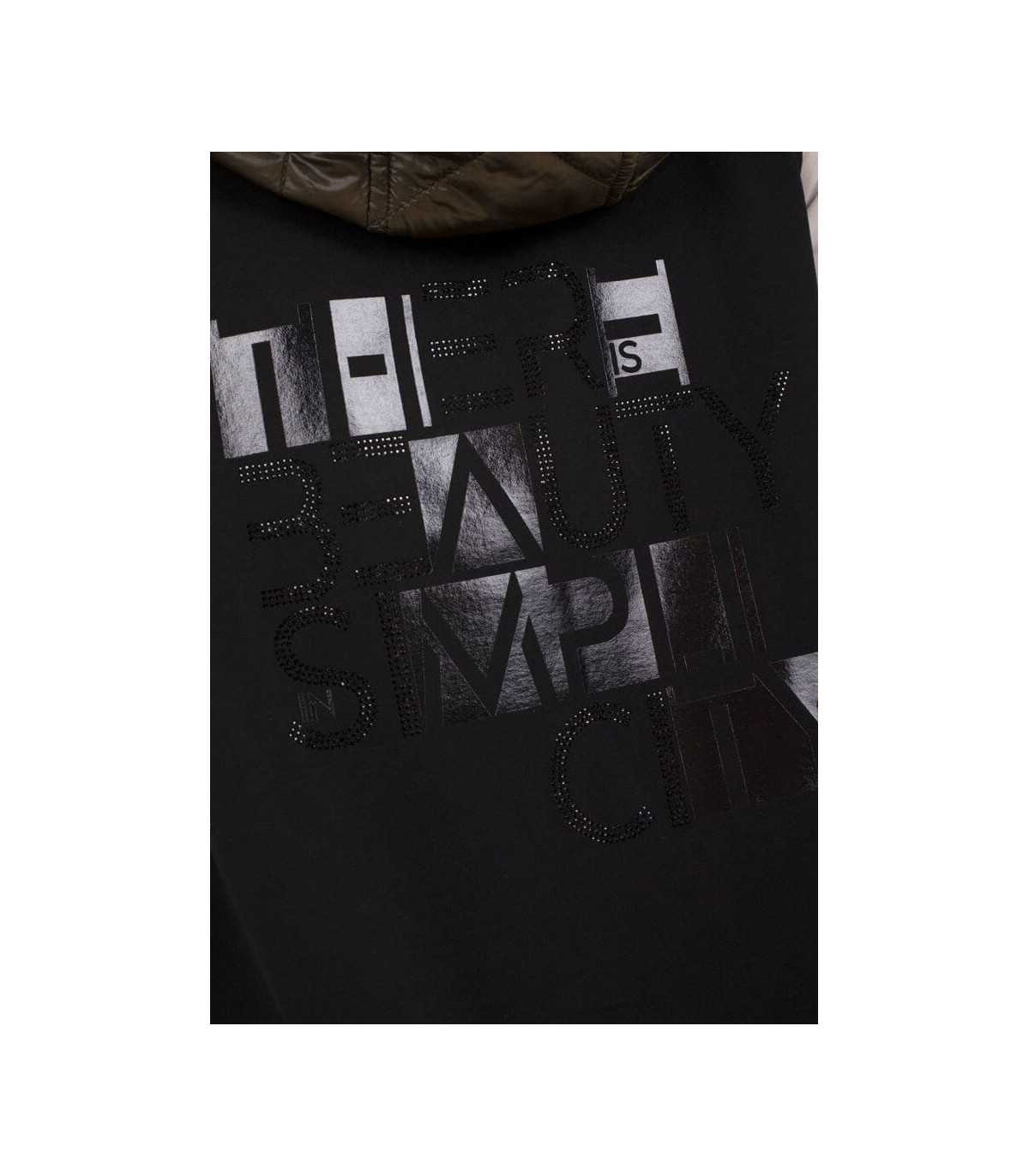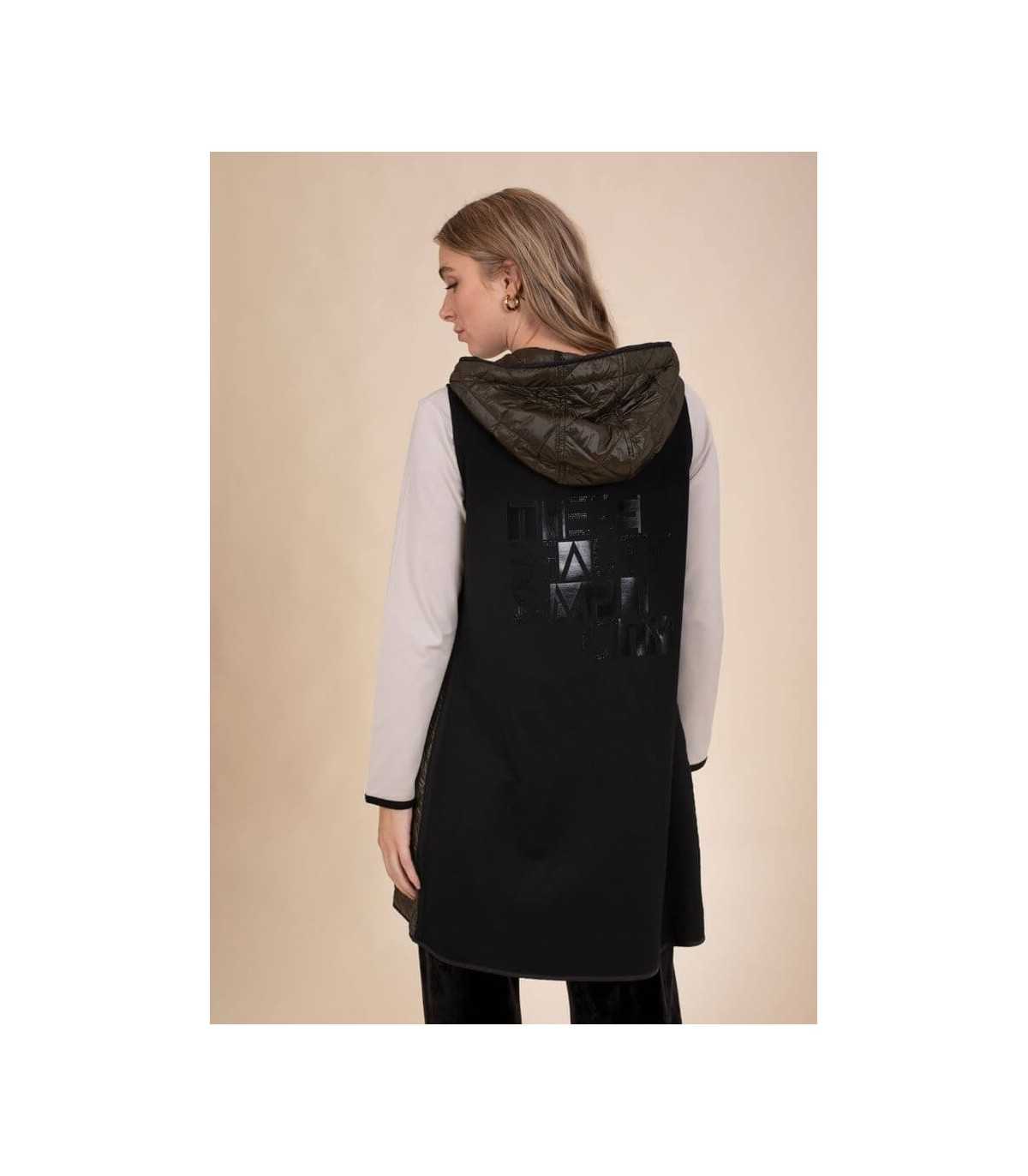 Chaleco largo de color verde caqui, acolchado, abrochado con botones a presión, bolsillos de plastrón delanteros, capucha y espalda en punto grueso, de la marca española Anna Mora.