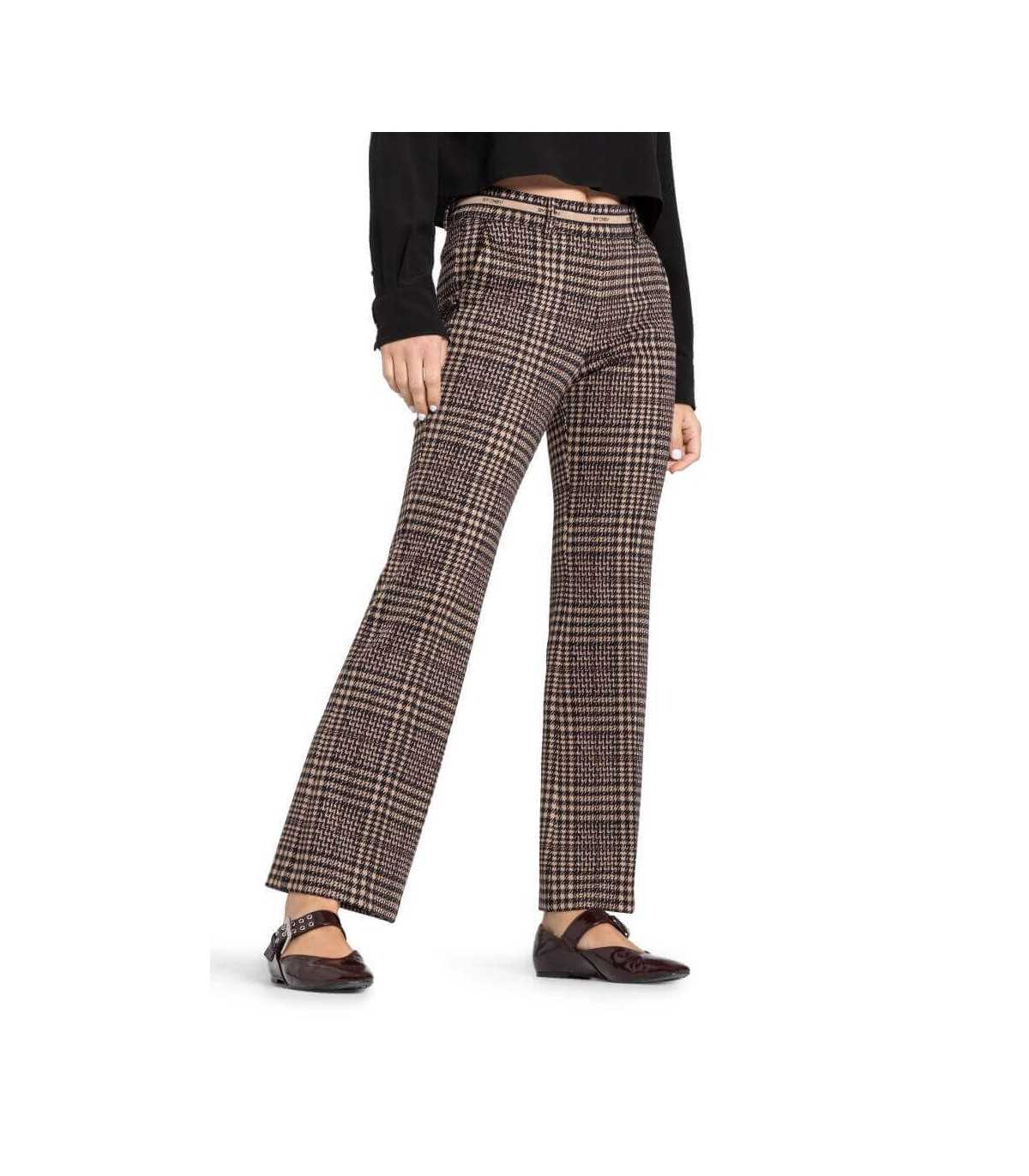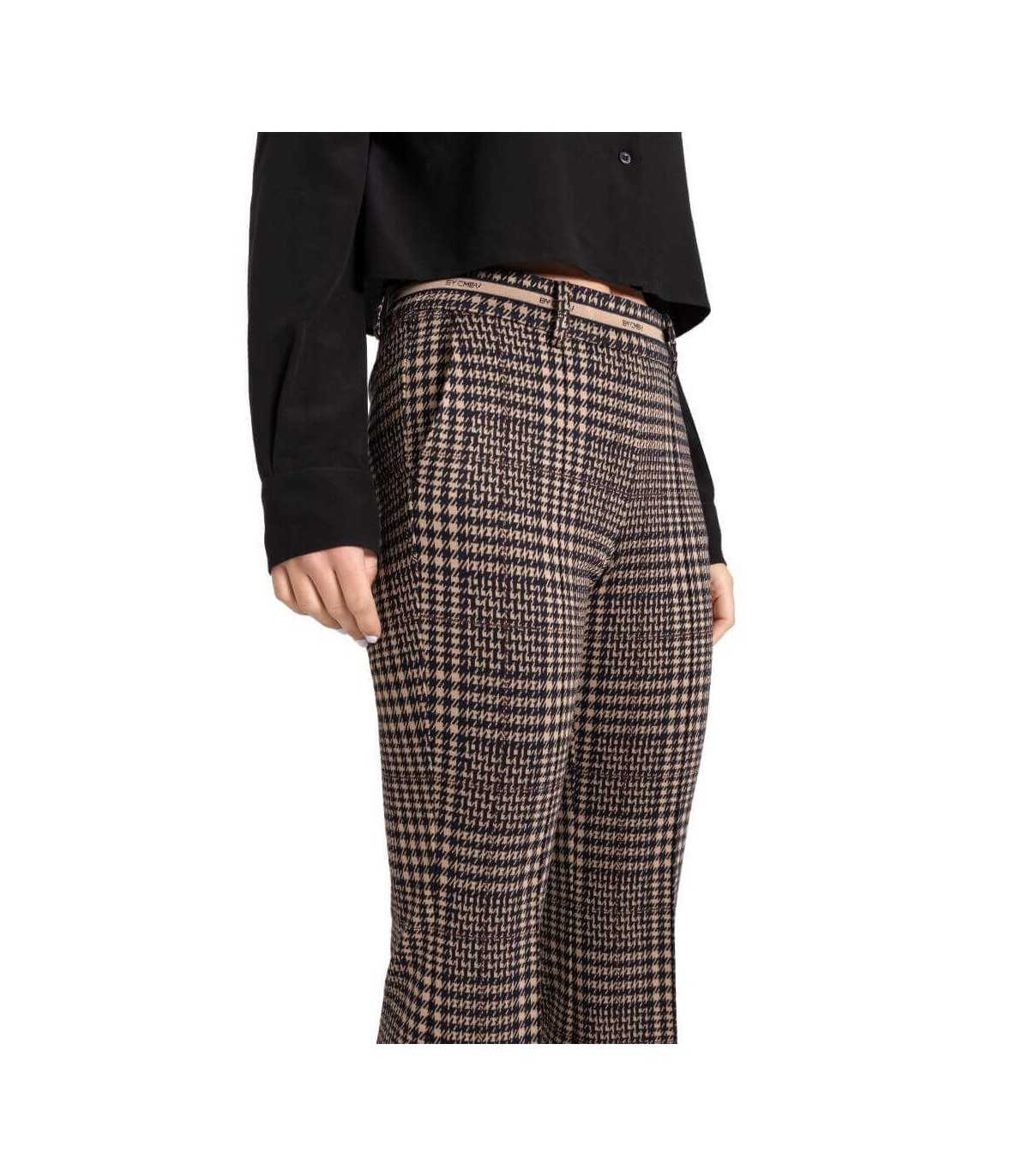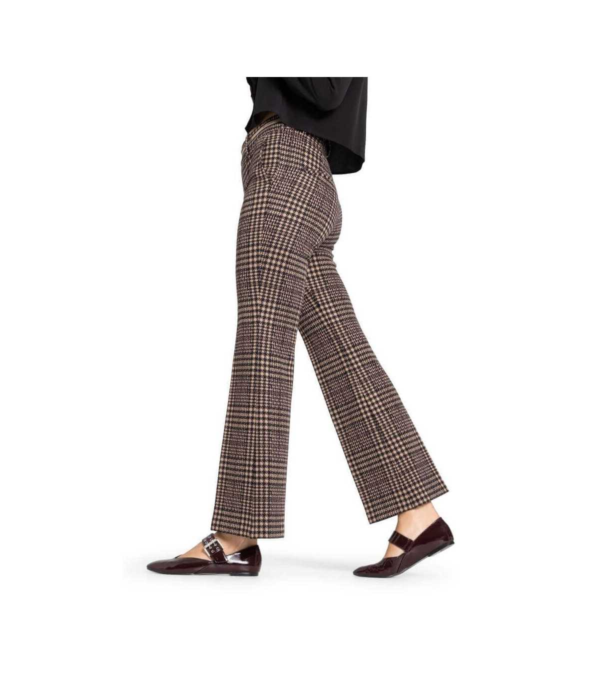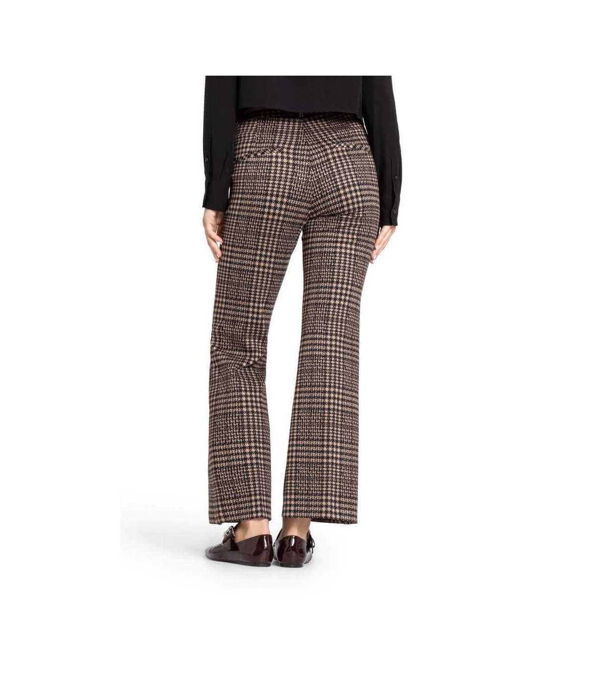 Pantalón acampanado, estampado de pata gallo color marino y camel en tejido punto milano, cinturilla elástica con trabillas, bolsillos laterales y bolsillos de ojal en la parte trasera, de la marca alemana Cambio.
