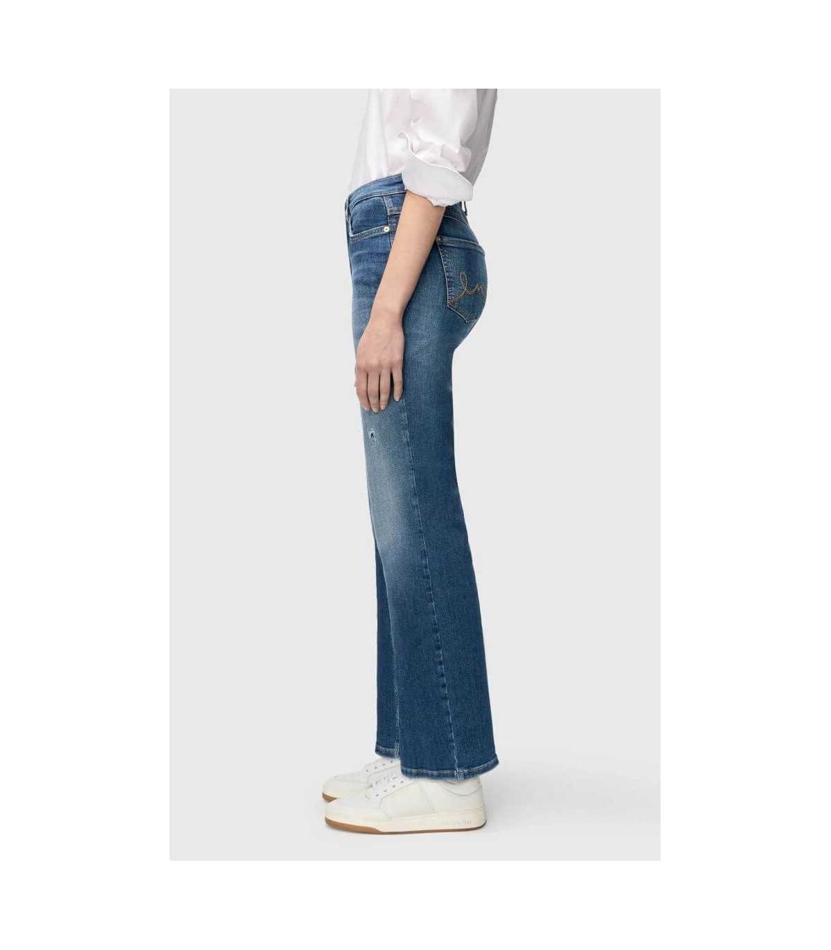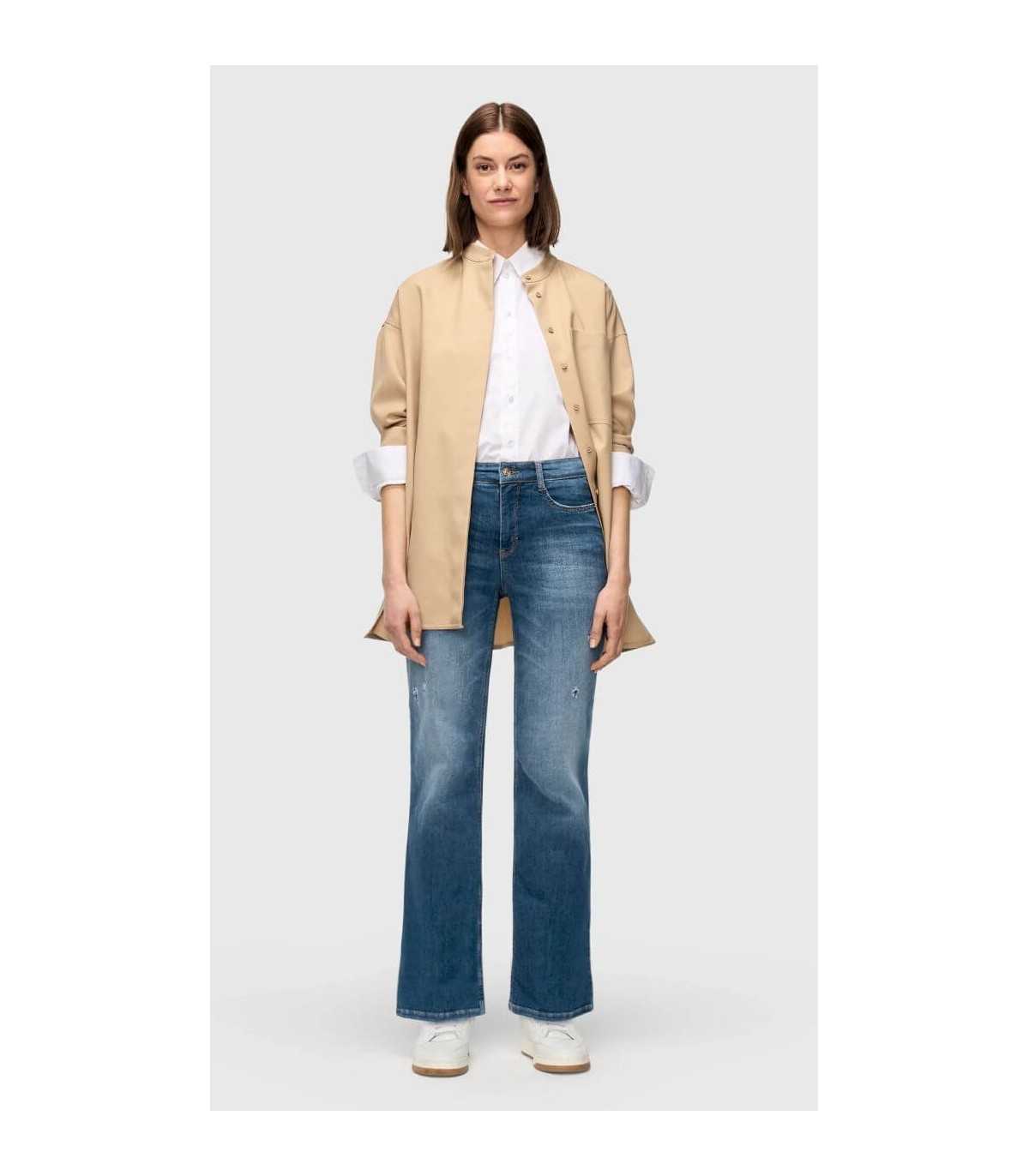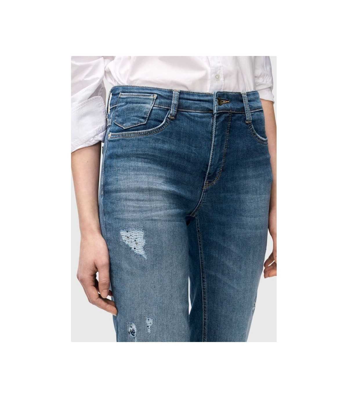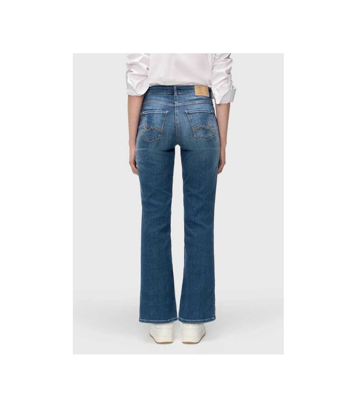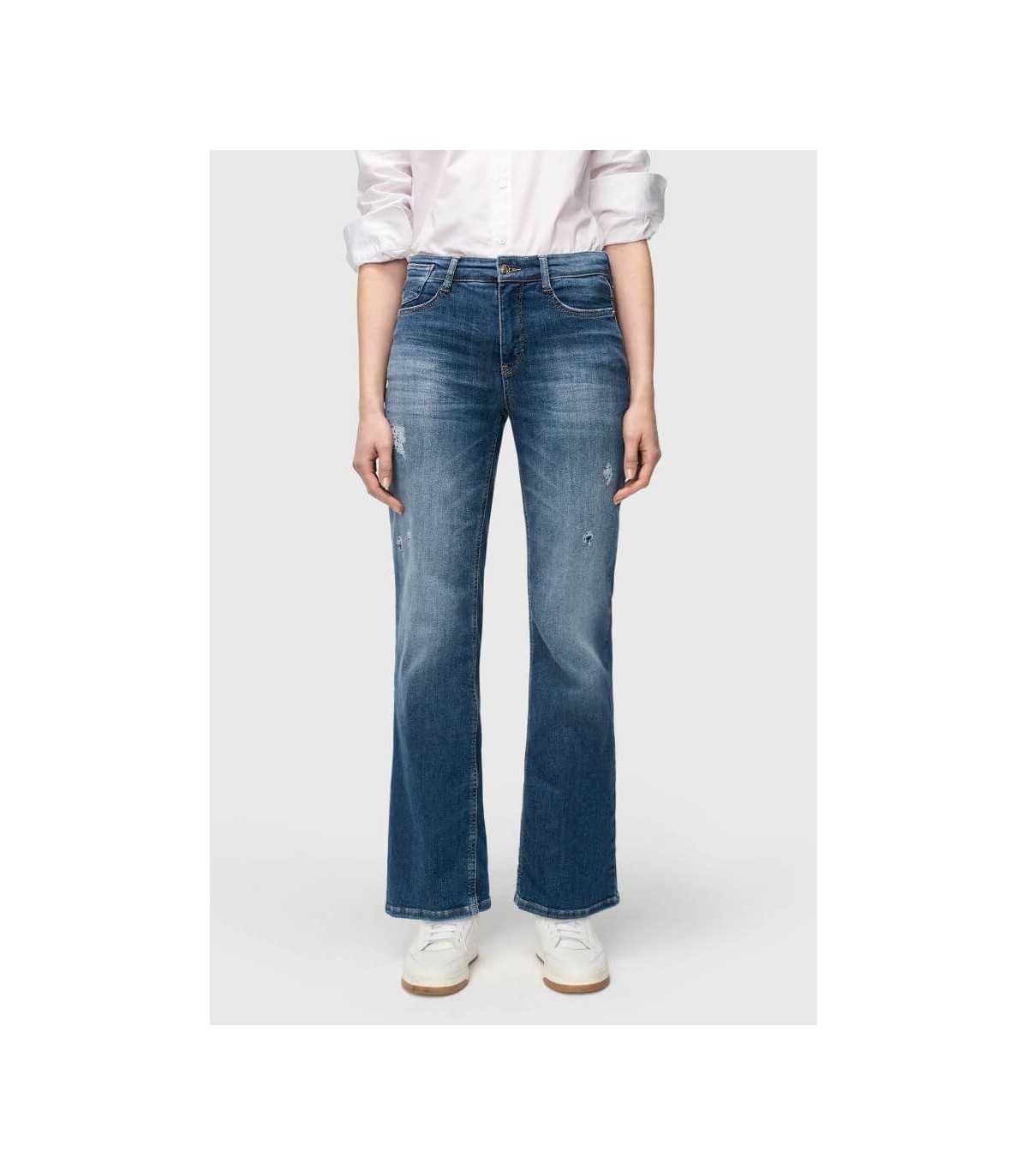 Pantalón cinco bolsillos color azul con desgaste, corte acampanado, efectos glamurosos destruidos con tachuelas, elástico de muy alta calidad y agarre muy cómodo, de la marca alemana Mac.