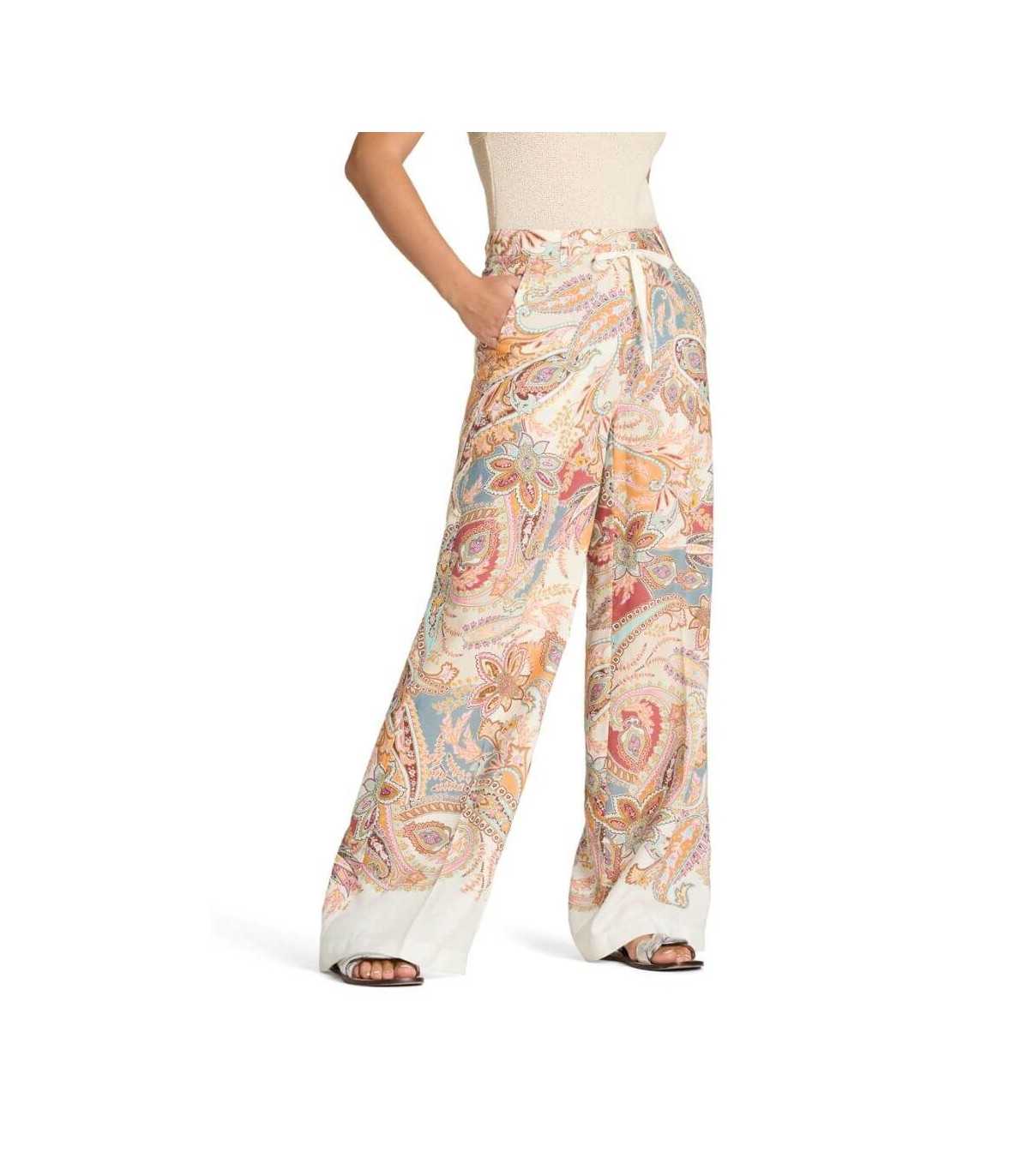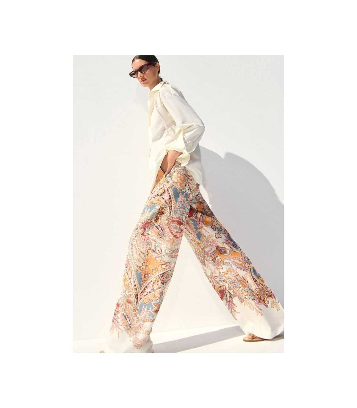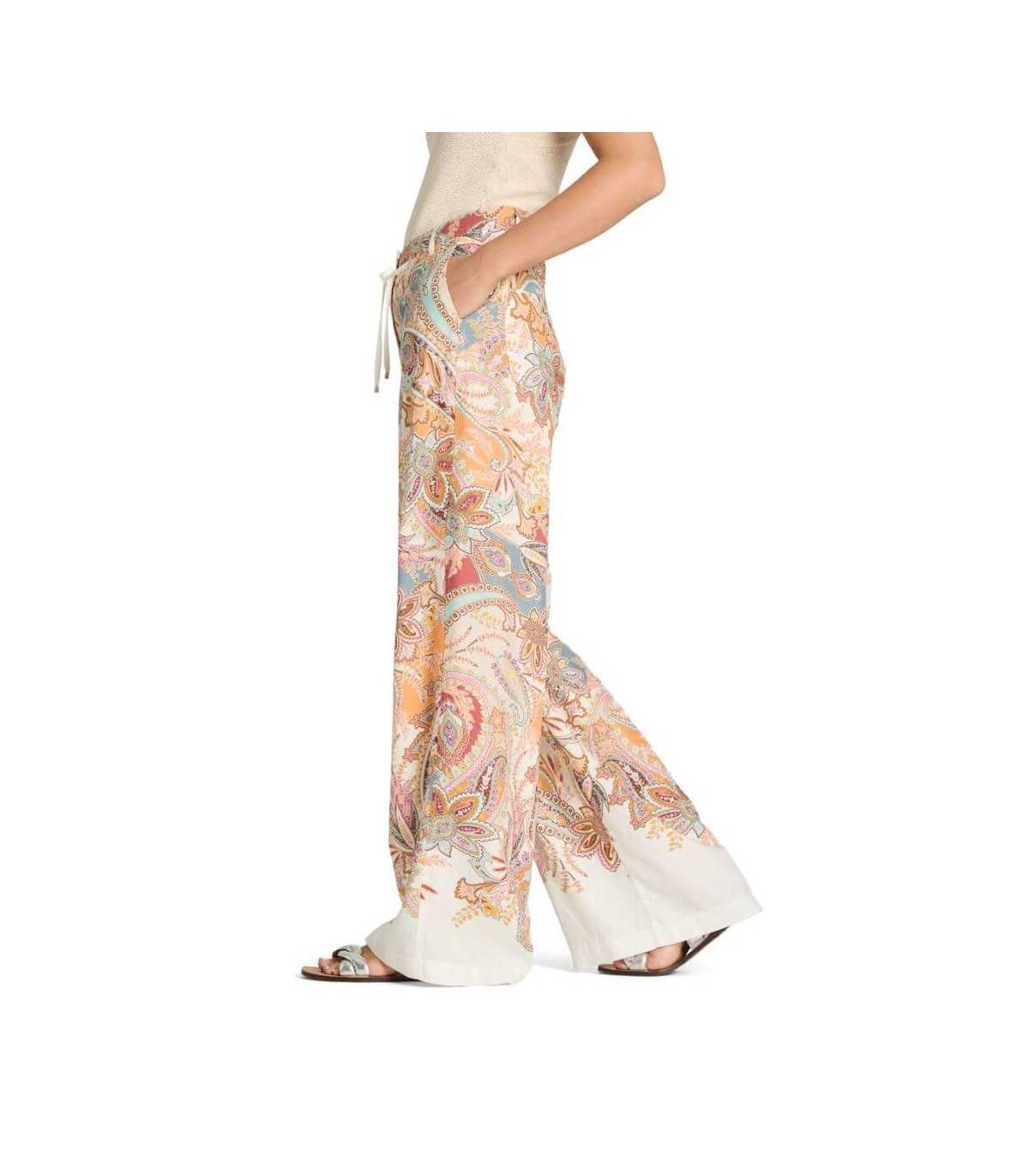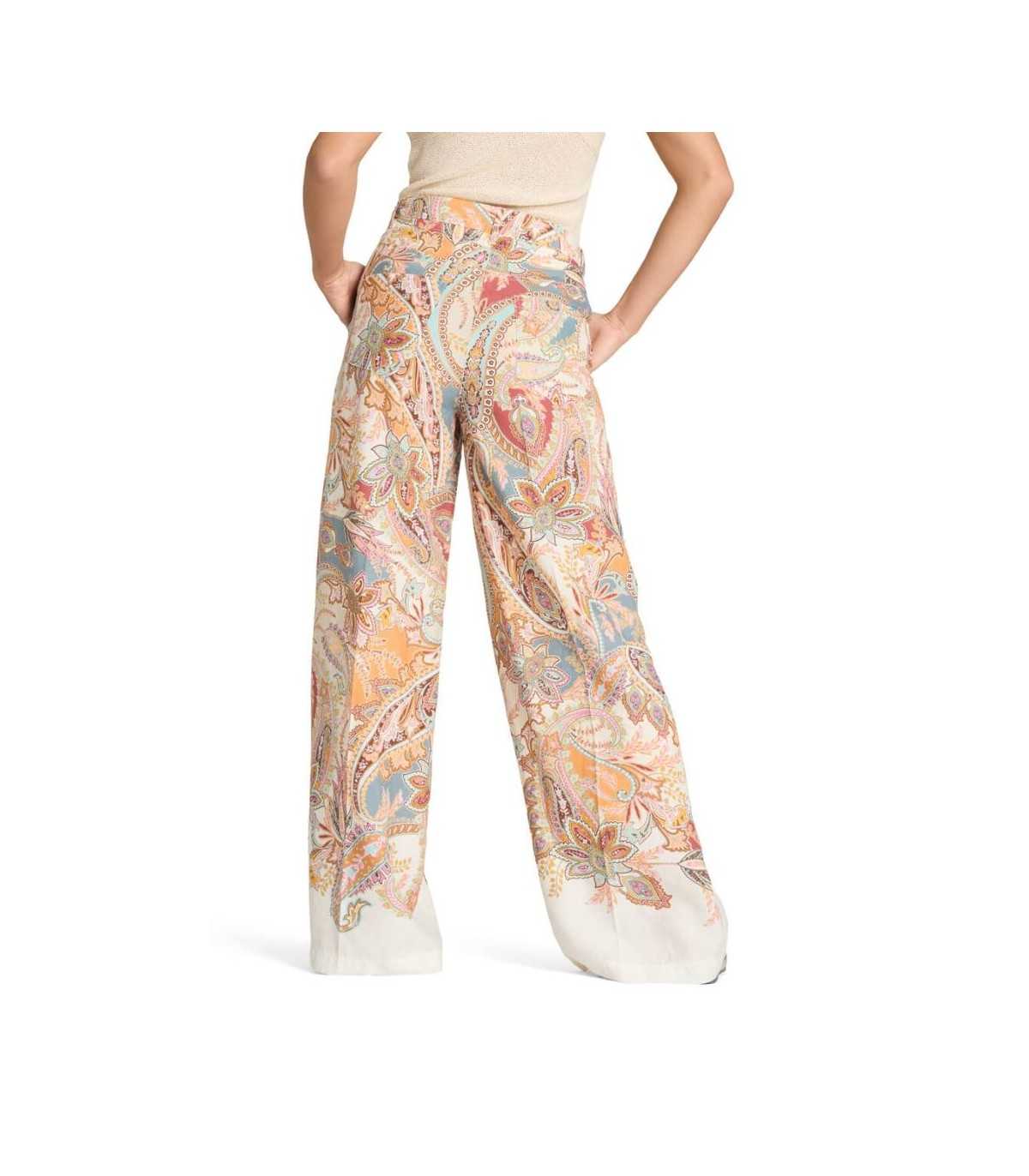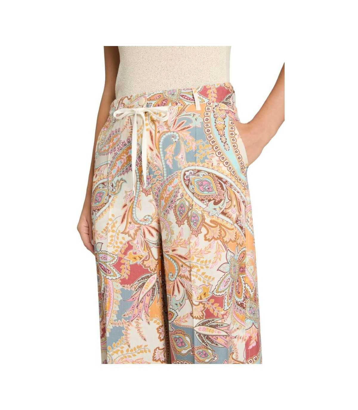 Pantalón estampado paisley multicolor sobre lino-tencel, cinturilla con trabillas y cordón de ajuste, bolsillos laterales y en la parte trasera bolsillos tipo jeans, cierre de botón y cremallera, de la marca alemana Cambio.