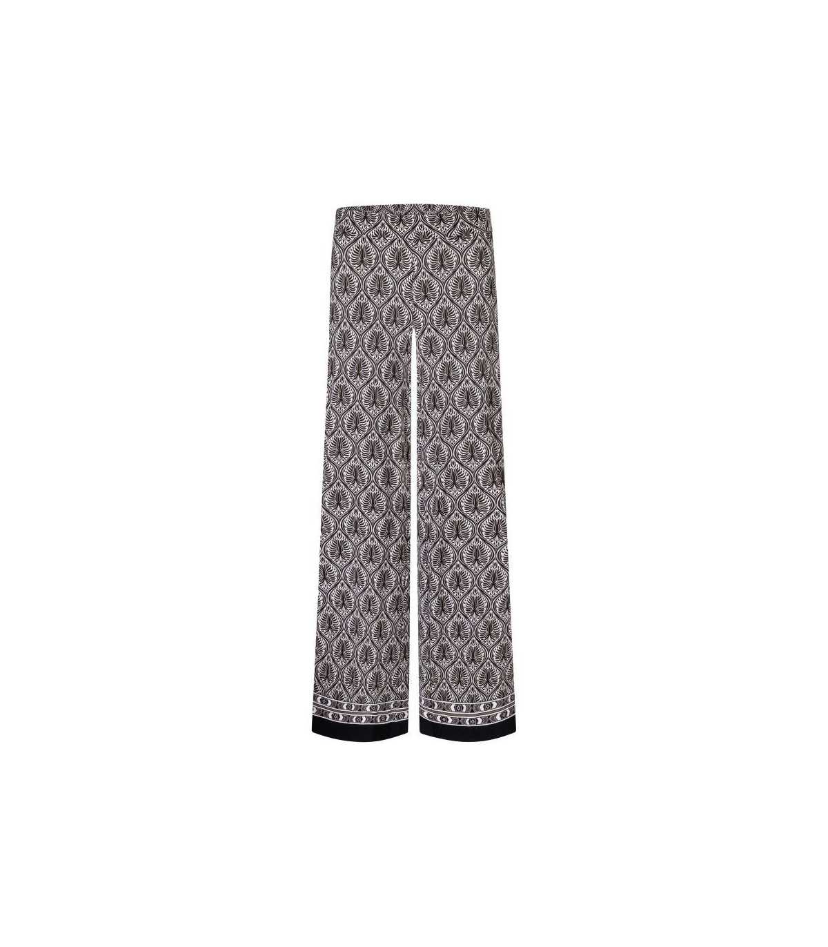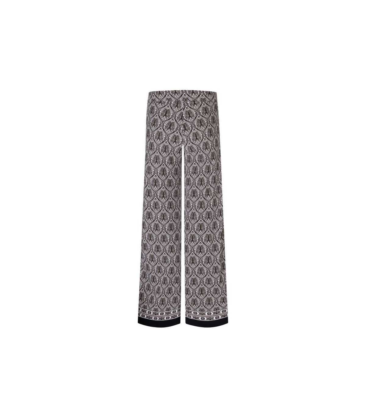 Pantalón estampado geométrico en color marrón y crudo con terminación del bajo con cenefa en color negro, tejido punto elástico con caída, línea recta y cinturilla elástica, de la marca alemana Cambio.
