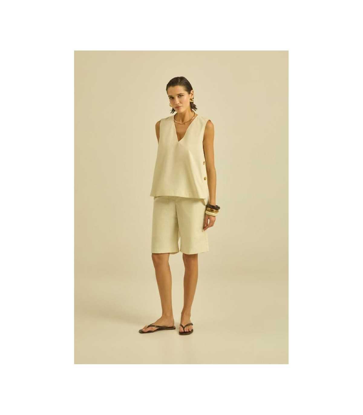 Pantalón blanco de corte recto con detalle de botones decorativos en ambos laterales de la cintura. Presenta pernera ligeramente acampanada, de la marca española Vilagallo.Composición: 52% algodón, 42% poliamida, 6%...