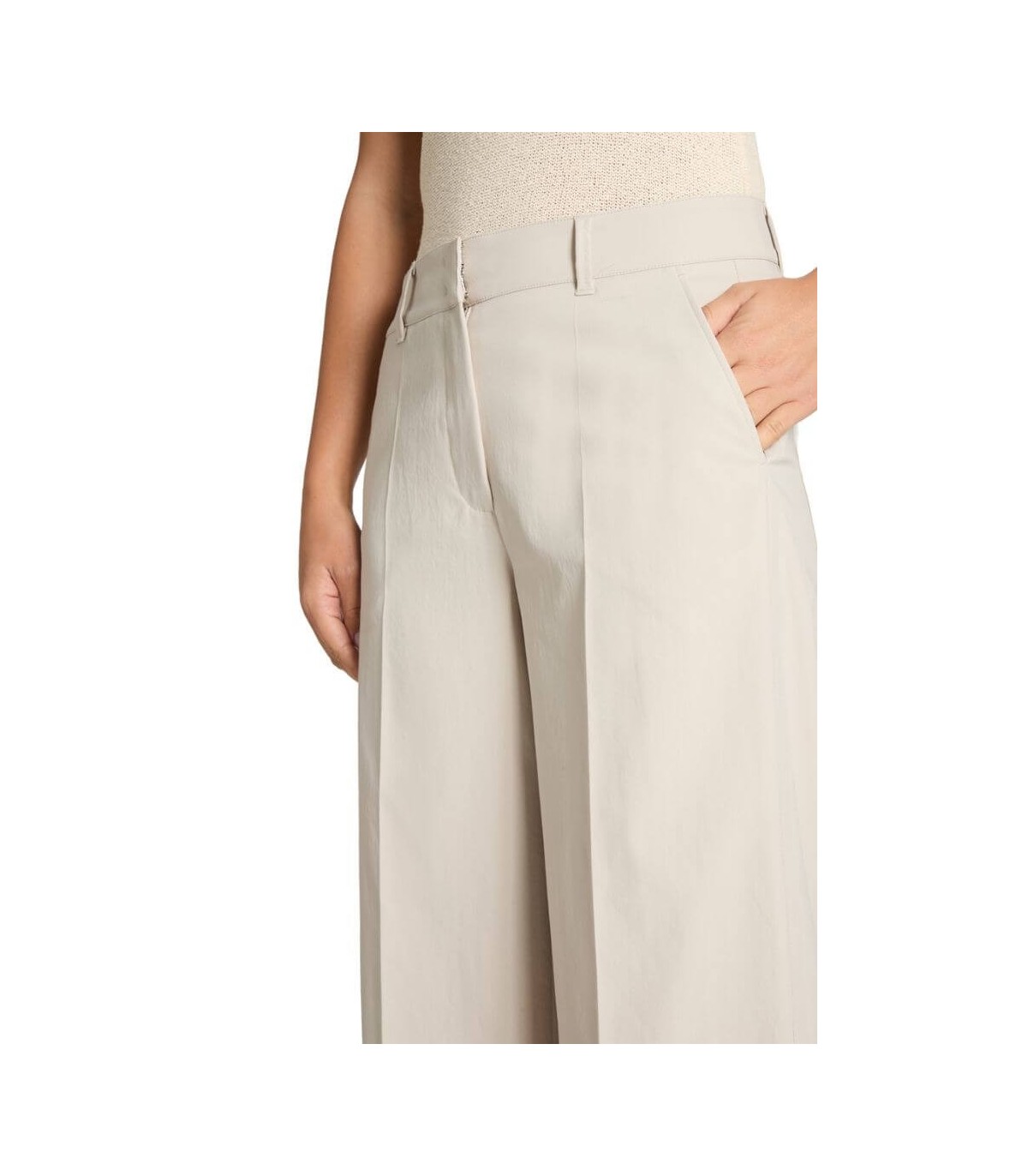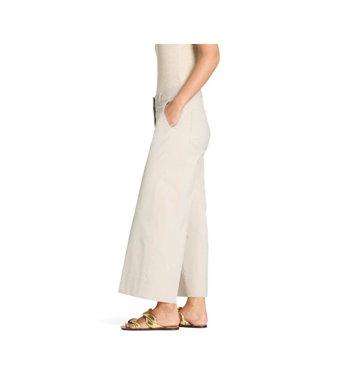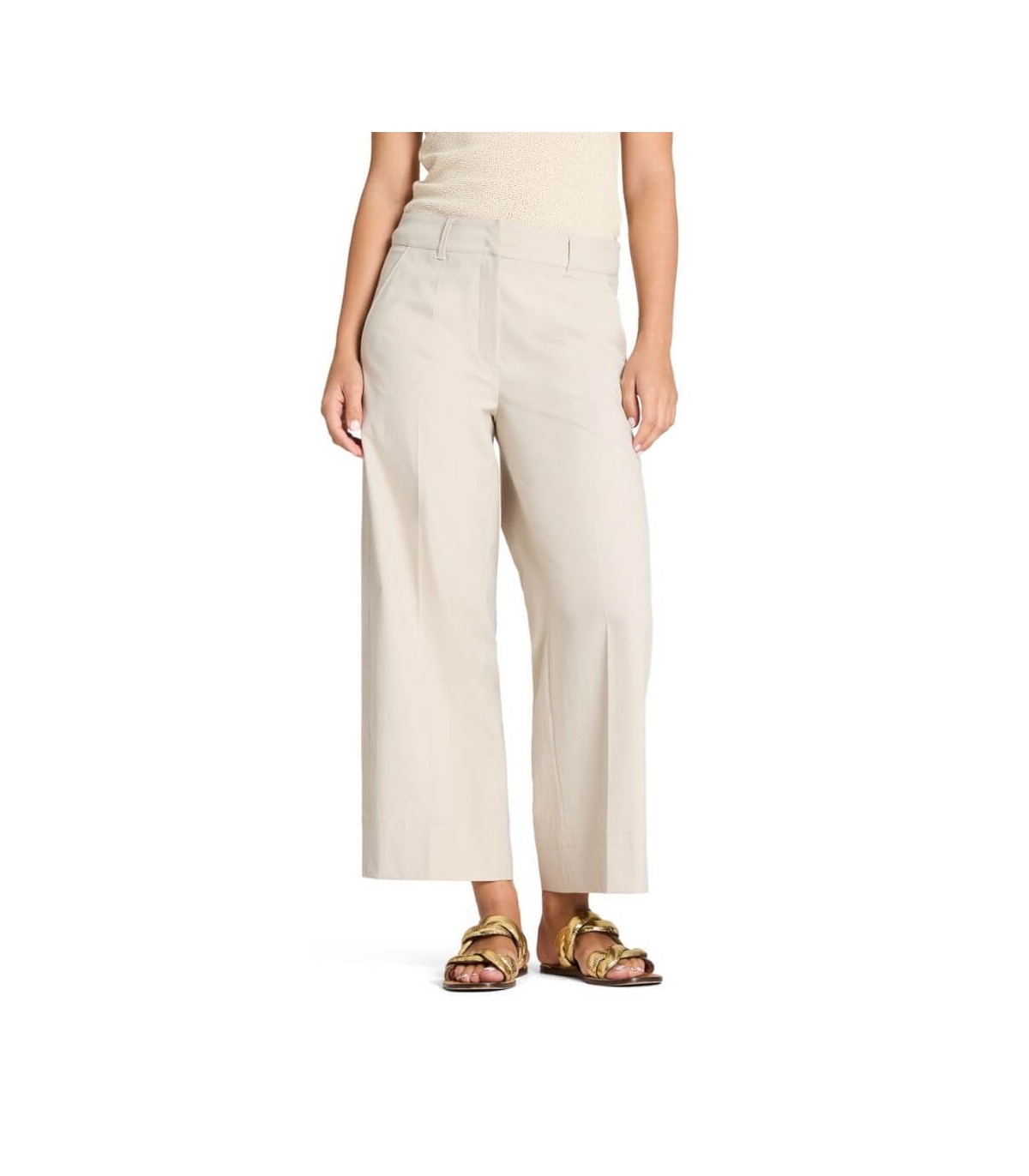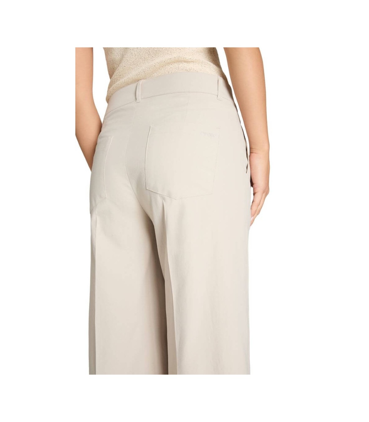 Pantalón culotte, color piedra, corte recto, tejido de algodón elástico, bolsillo francés y bolsillos sobrepuestos parte trasera , cierre delantero con corchete y cremallera, de la marca alemana Cambio. Composición: 100% poliéster
