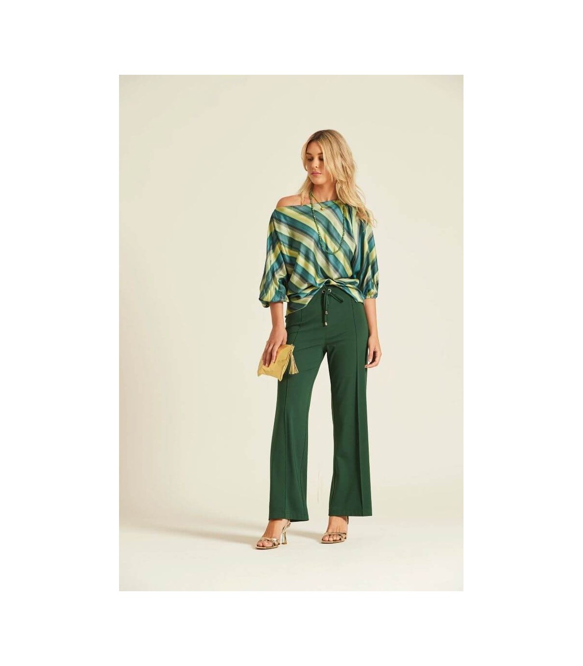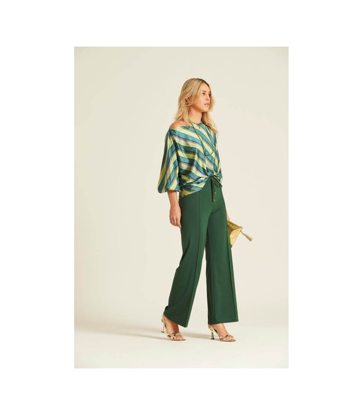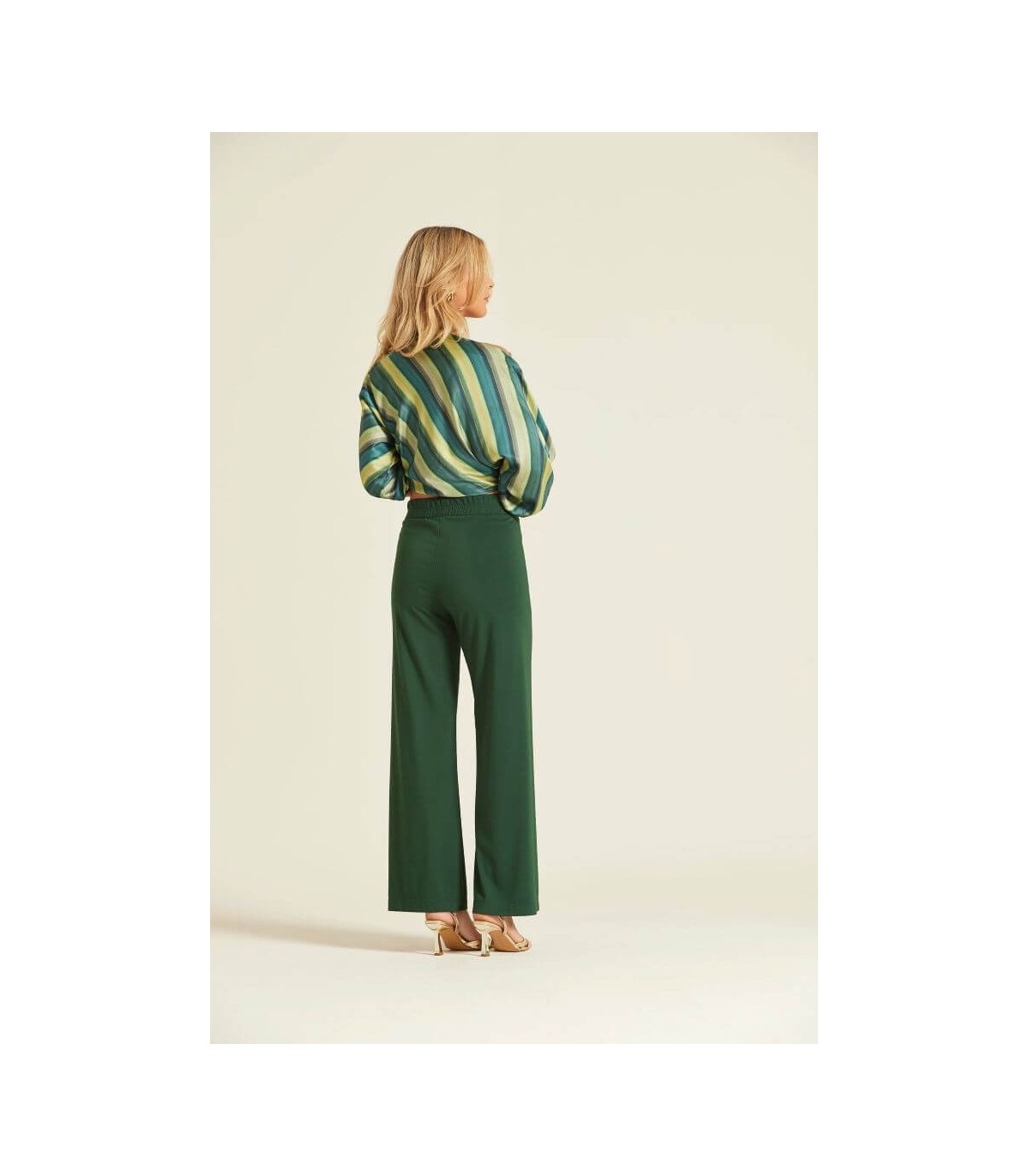 Pantalón corte recto y fluido, color verde y cintura elástica con cordón de ajuste, de la marca española Oky.