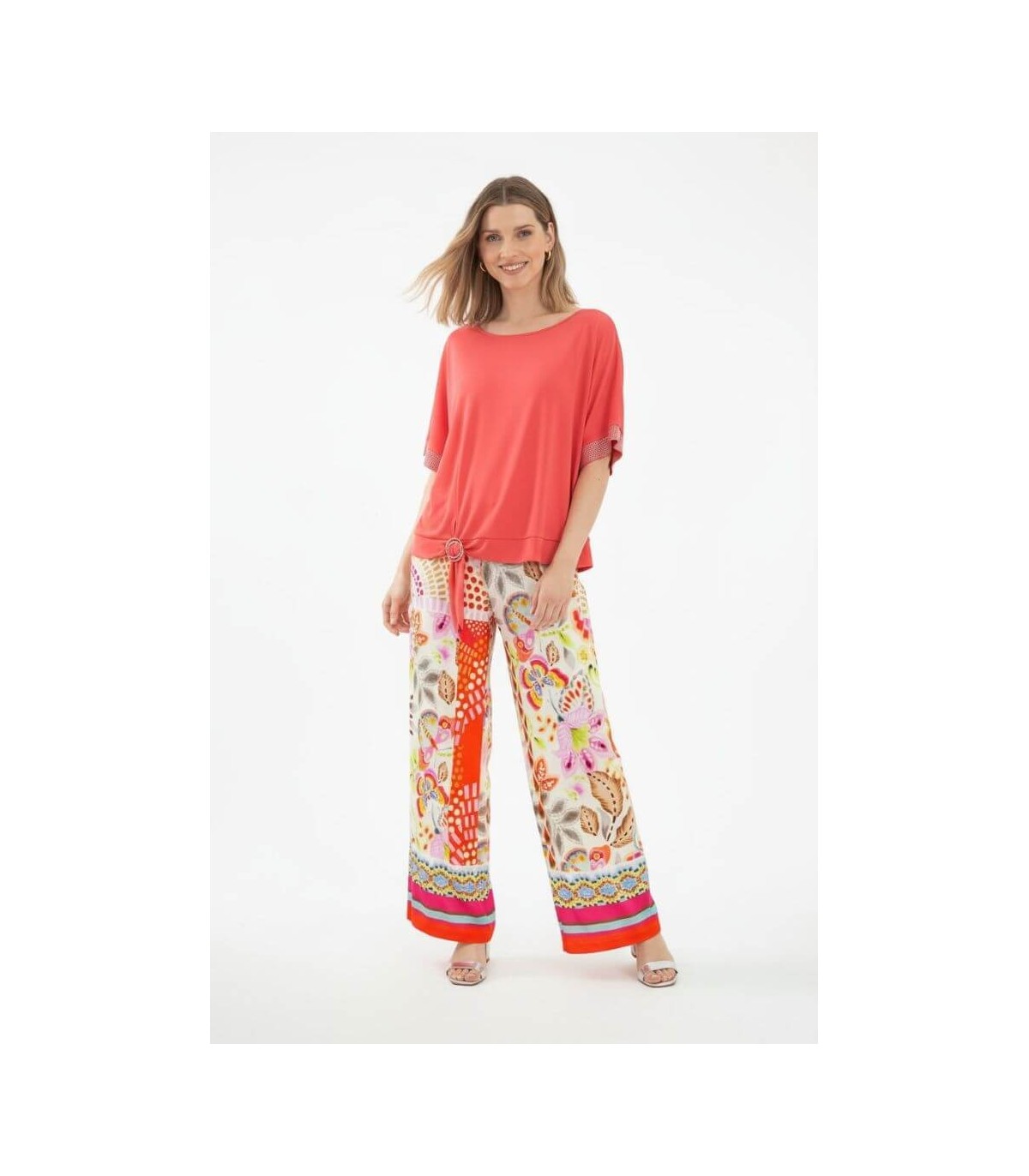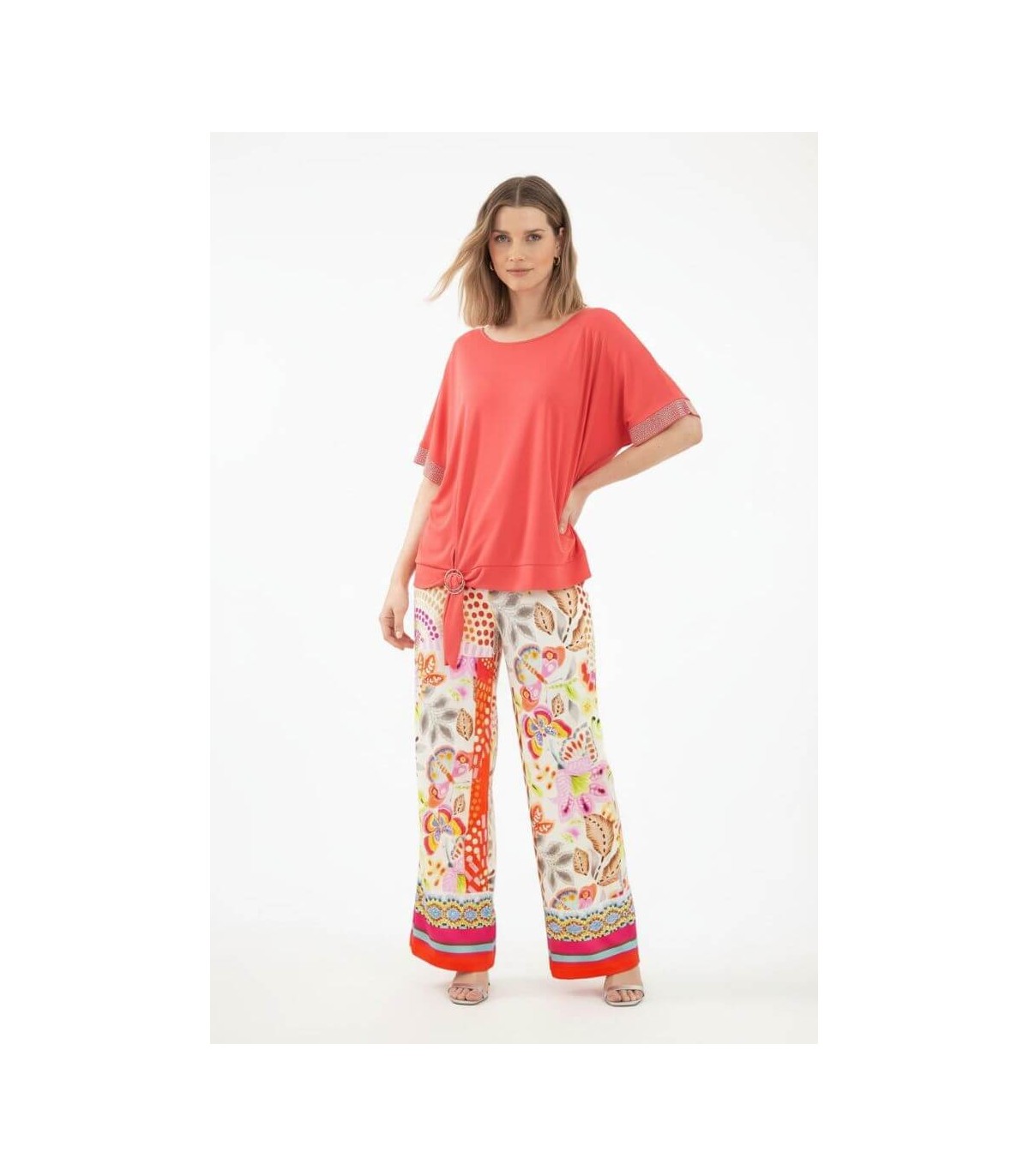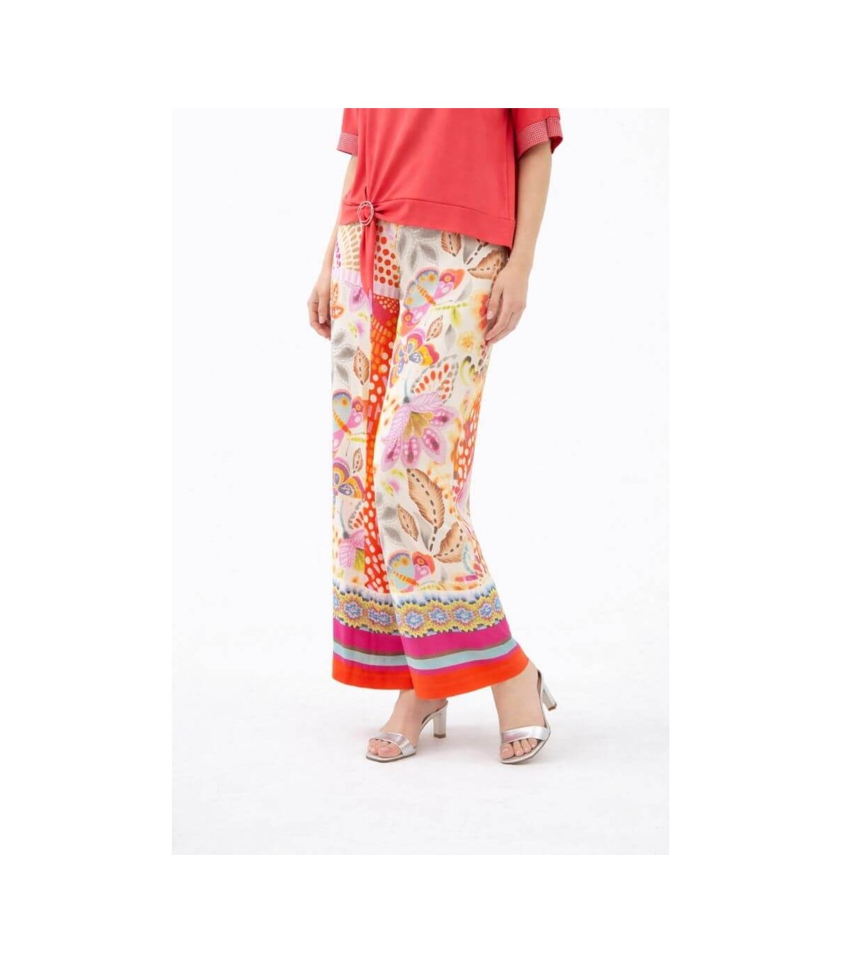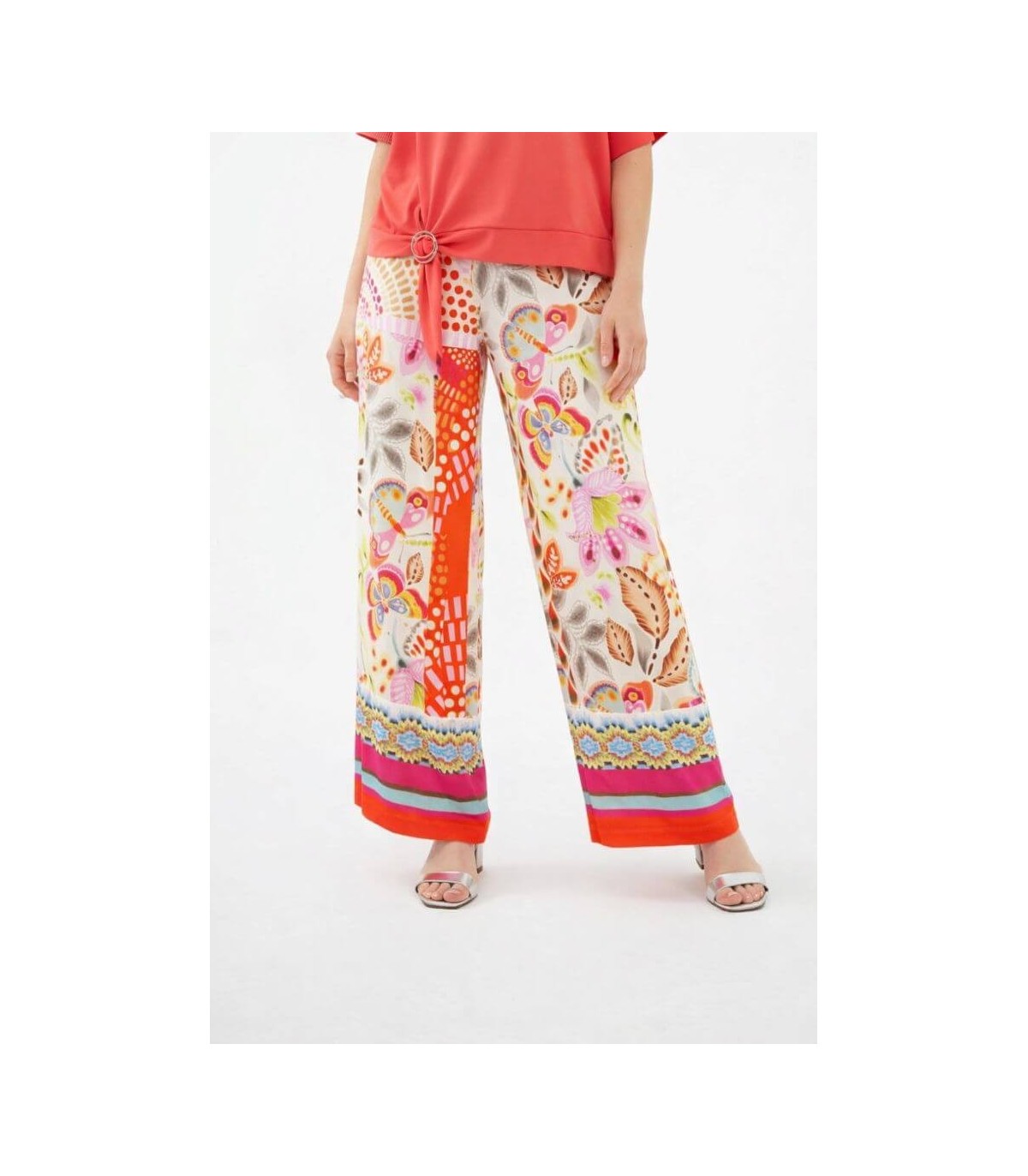 Pantalón en tejido punto de seda, corte recto, estampado patch y cintura elástica, de la marca española Anna Mora.