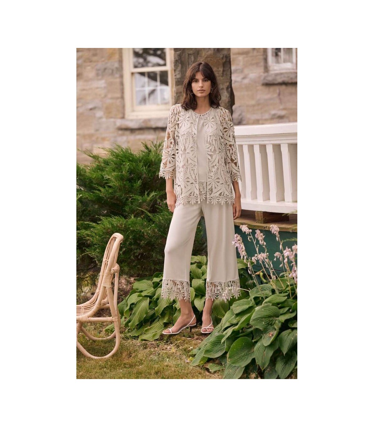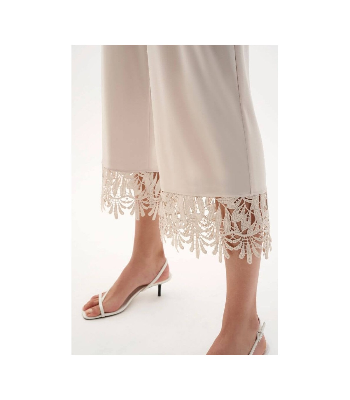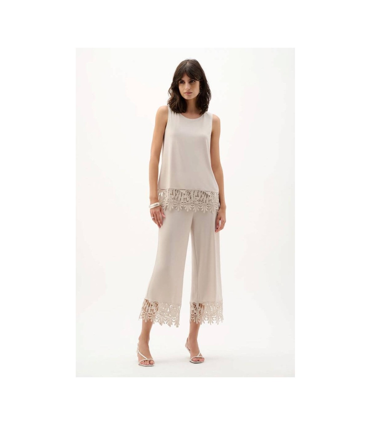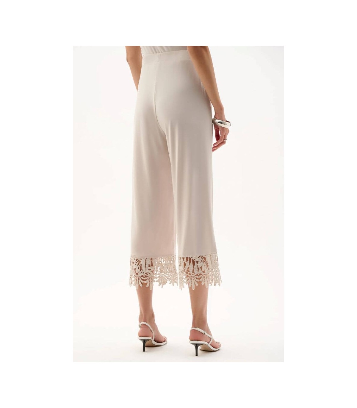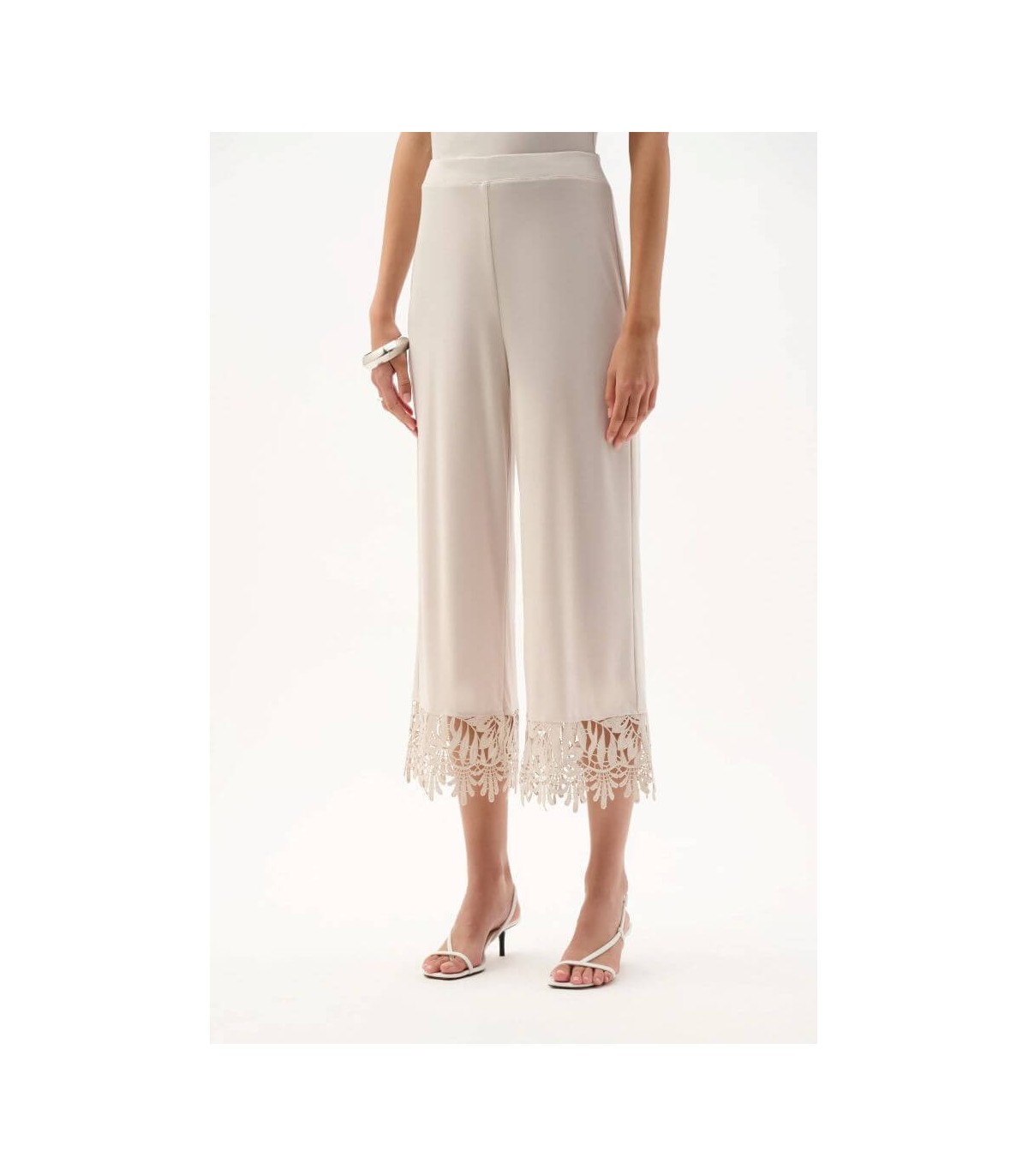 Pantalón en tejido punto de seda, color piedra, culotte, dobladillo de encaje guipur, pierna ancha y corte largo crop, de la marca canadiense Joseph Ribkoff.