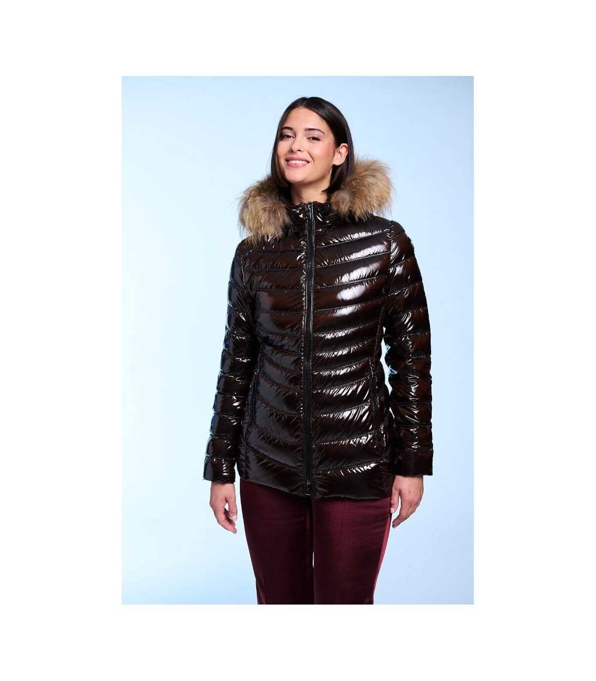 Parka color moka, diseño de ondas, cierre central con cremallera de doble carro, bolsillos, capucha desmontable con pelo de racoon, tejido repelente al agua y cortavientos, relleno de plumón termorregulador, de la marca española Henry Arroway.