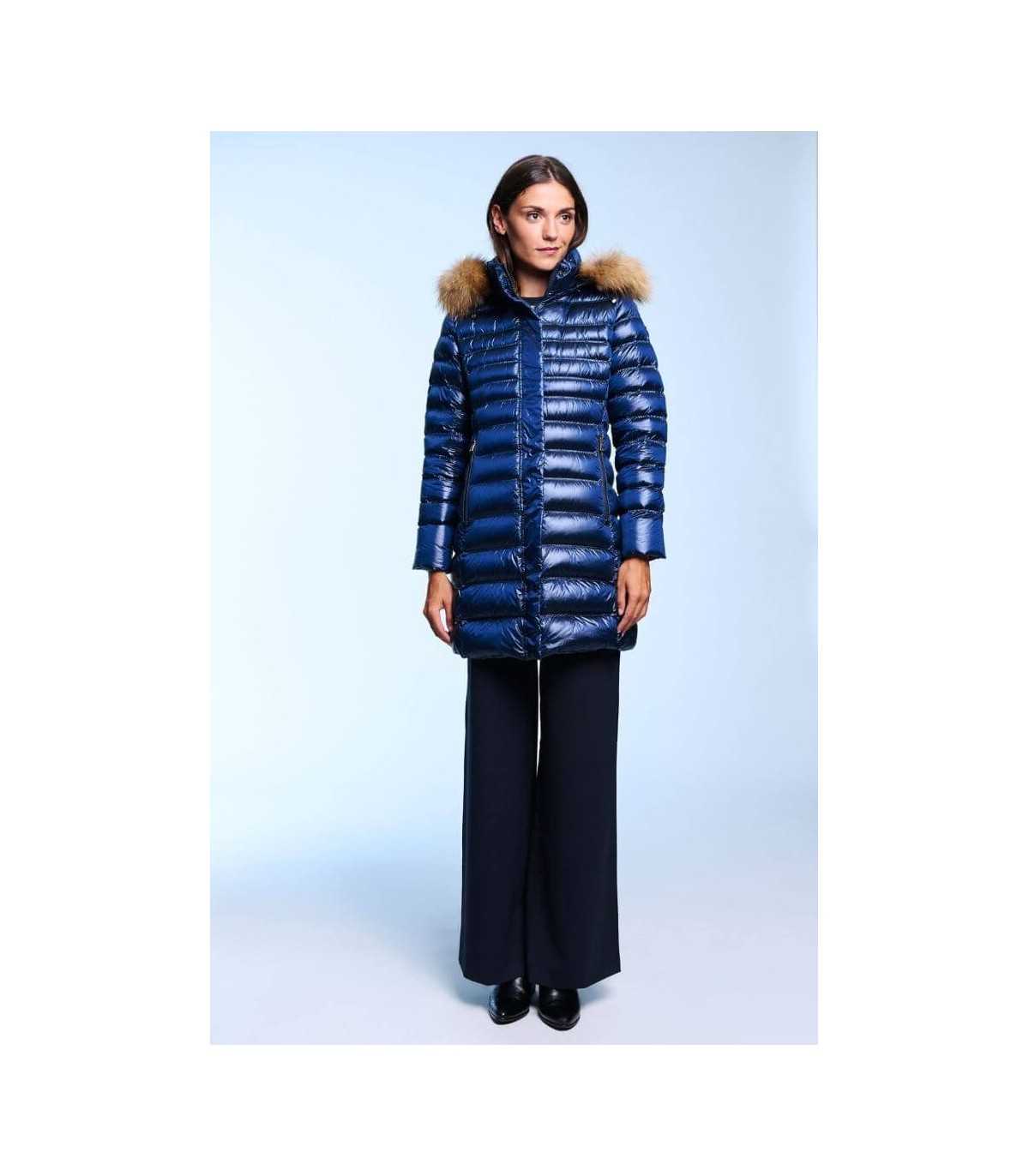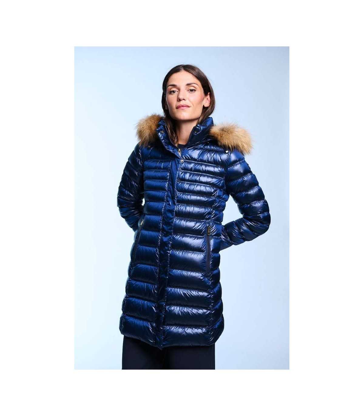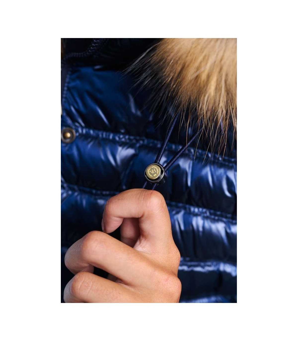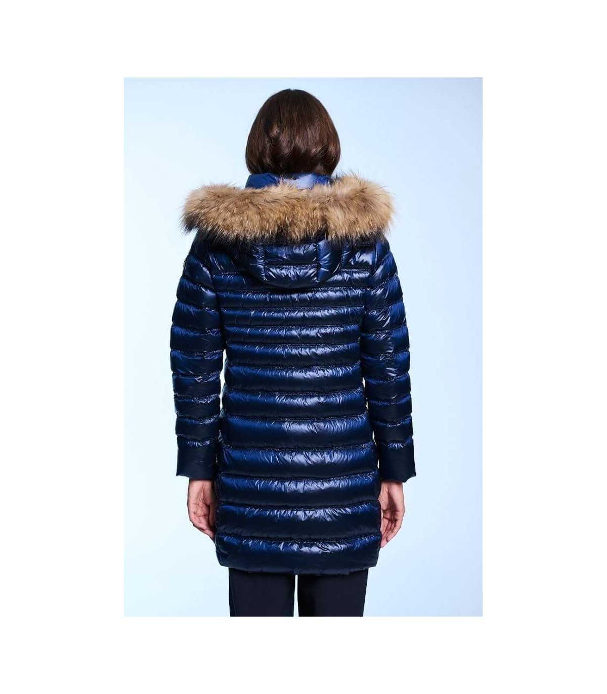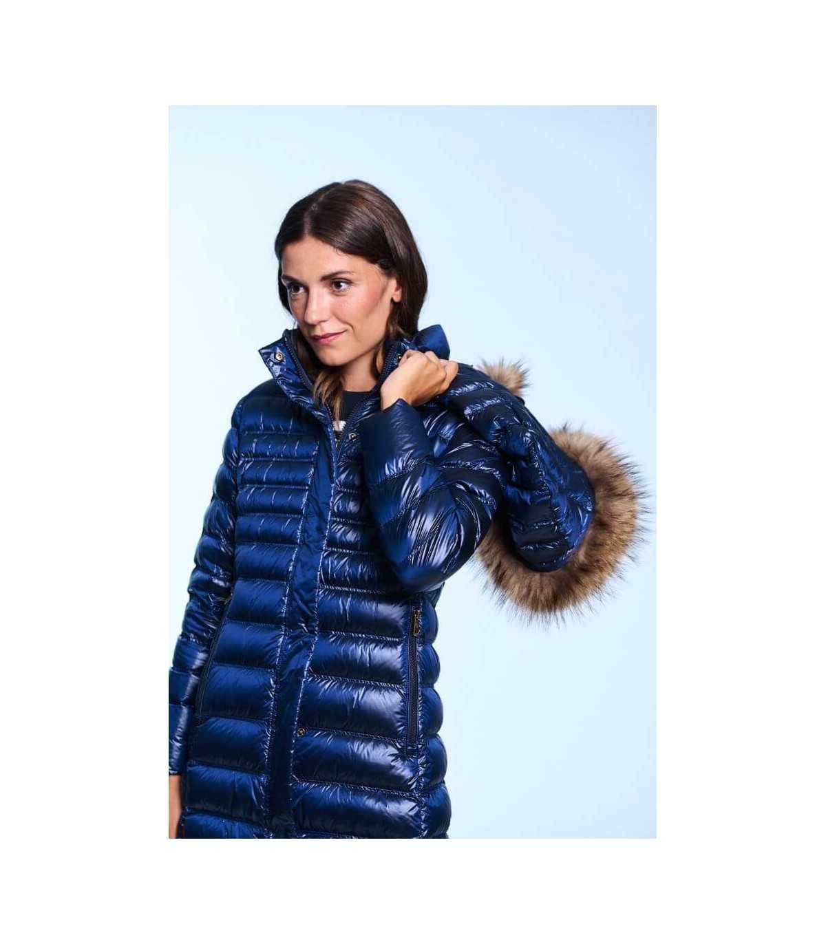 Parka larga en color marino, con capucha desmontable y pelo racoon, cierre de cremallera con tapeta y bolsillos laterales, tejido impermeable y con un relleno de plumón, de la marca española Henry Arroway.