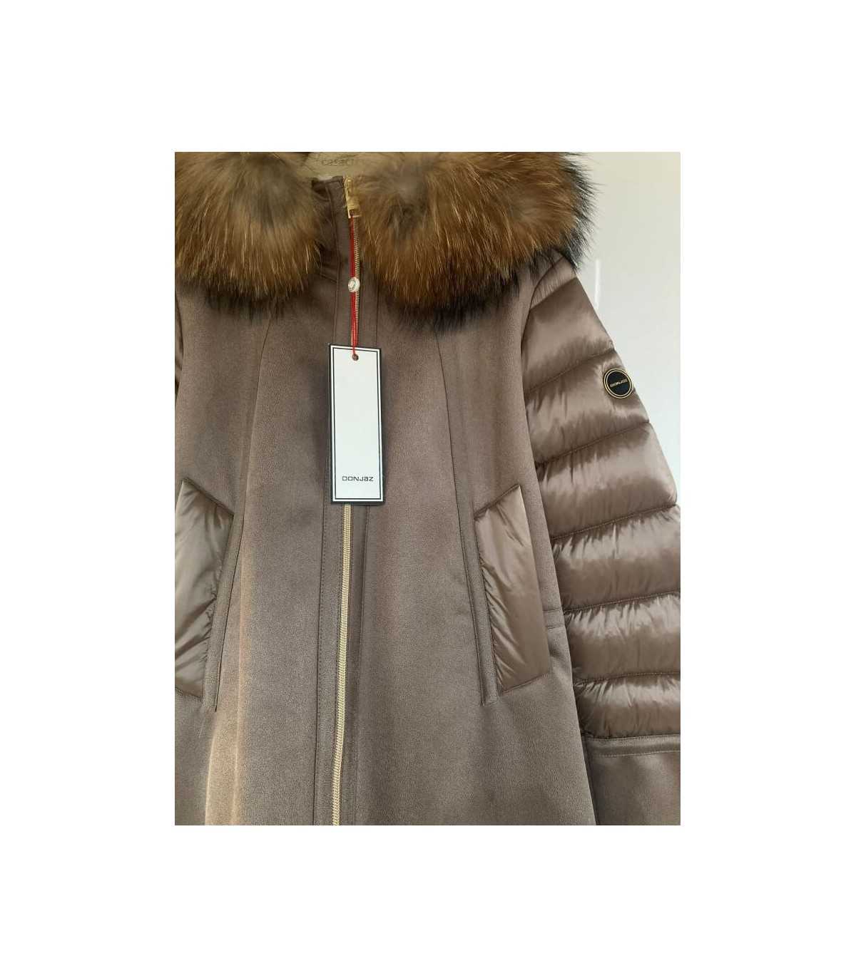 Parka en tejido imitación piel vuelta combinado con tejido de nailon guateado en las mangas y bolsillos, interior de pelo, capucha fija con pelo natural desmontable y cierre frontal de doble carro, de la marca española Donjaz.