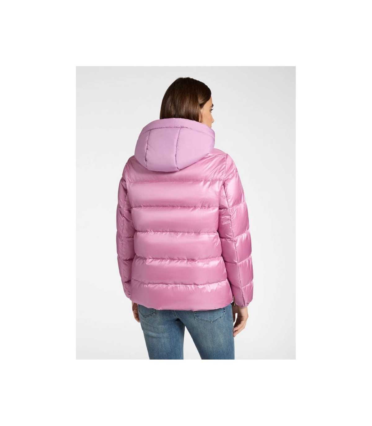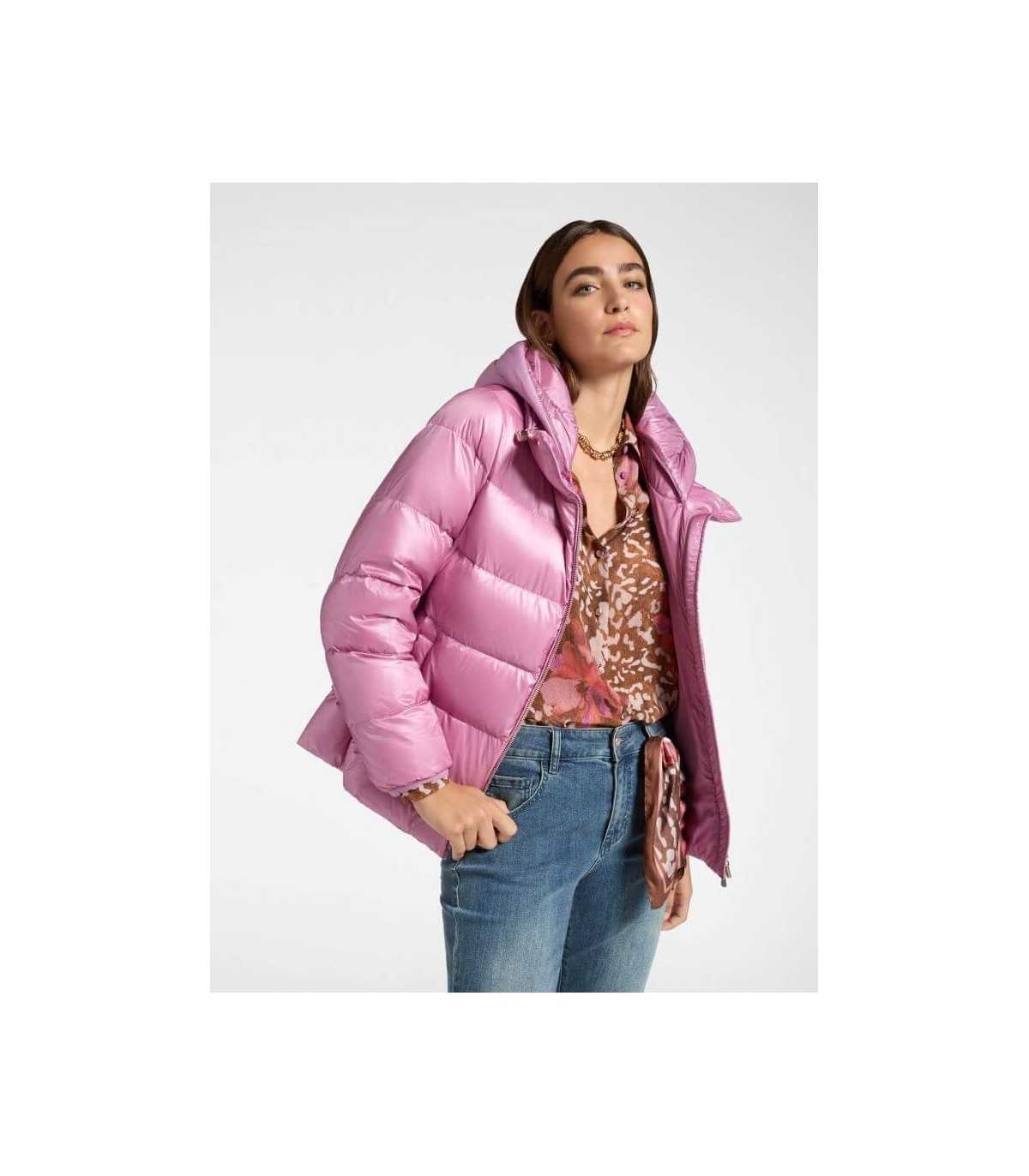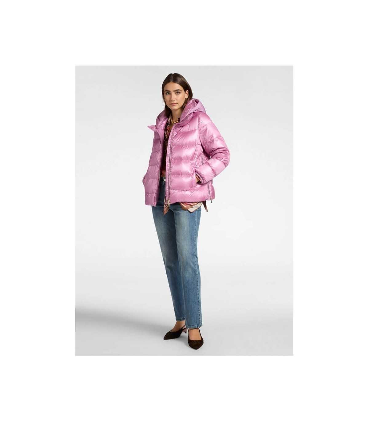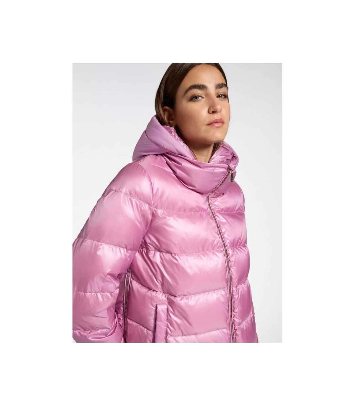 Parka acolchada ligera, color rosa, cierre de cremallera, bolsillos laterales y relleno de plumón.