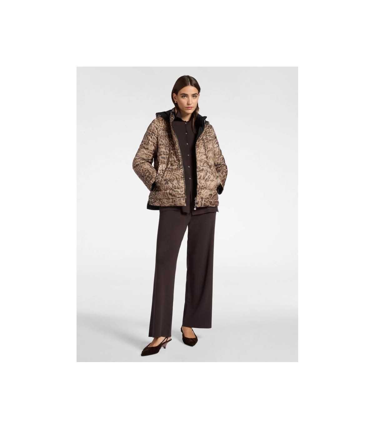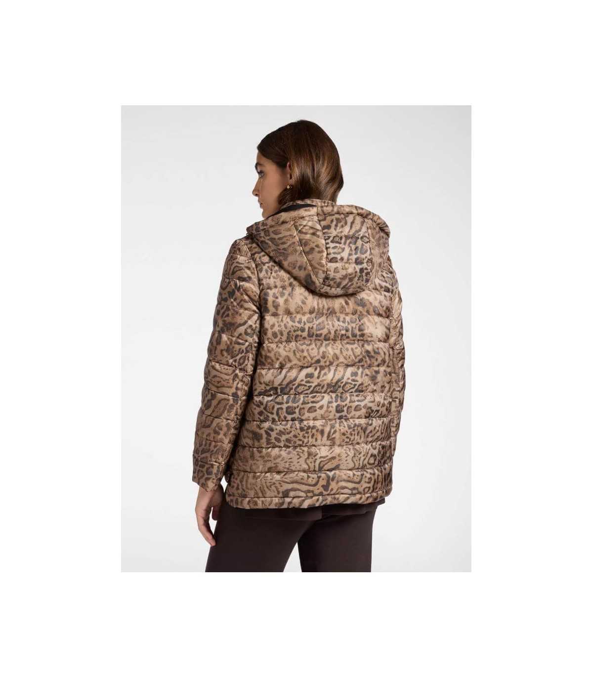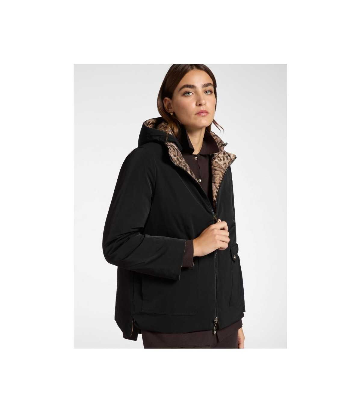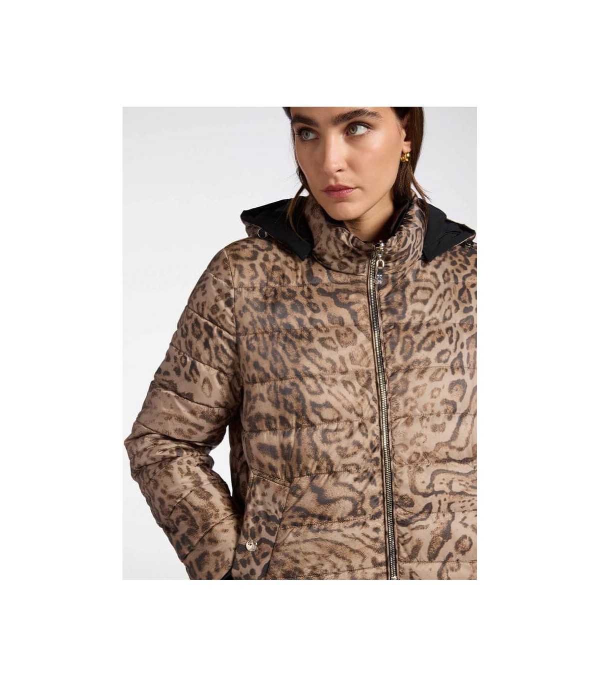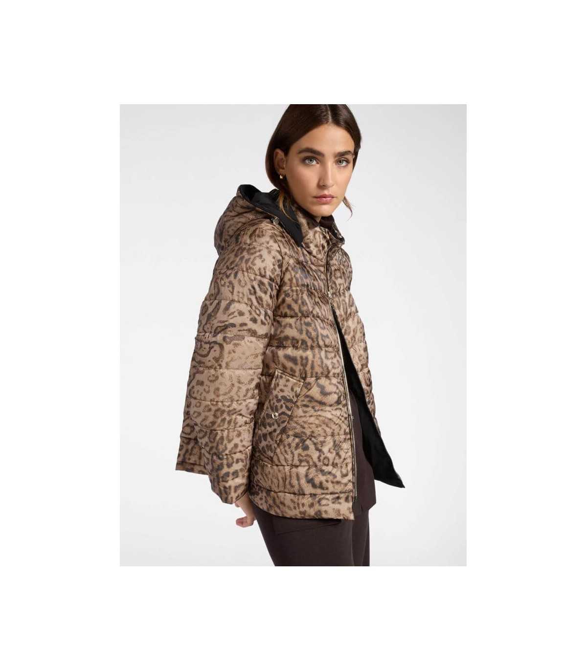 Parka acolchada reversible, estampado animal print y liso negro, cierre de cremallera, capucha desmontable y bolsillos, de la marca italiana Elena Mirò.