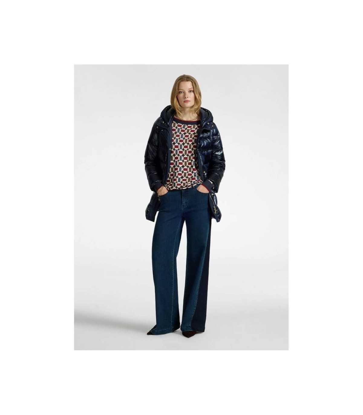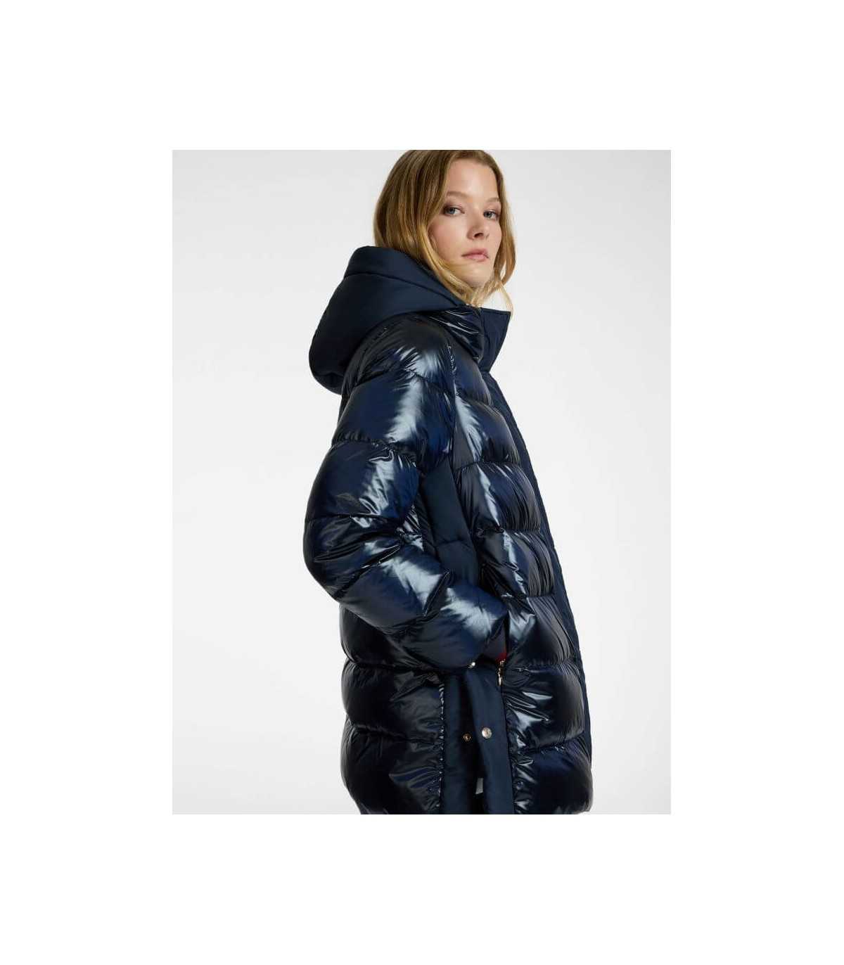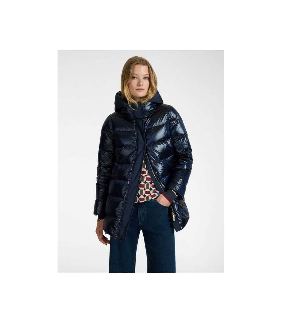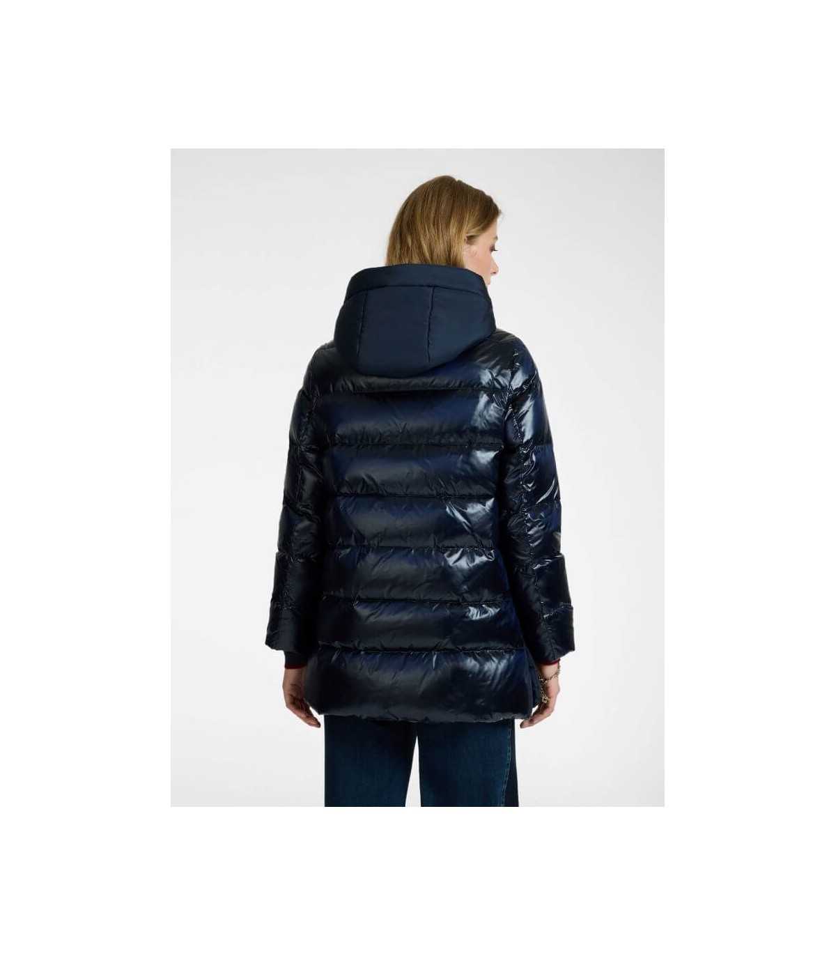 Parka acolchada, color azul marino, cuello envolvente, capucha desmontable, cierre de cremallera y solapa, y bolsillos verticales, de la marca italiana Elena Mirò.