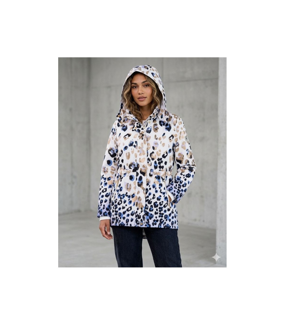 Parka en tejido técnico estampado de manchas, corte recto, cordón de ajuste en la cintura, capucha desmontable, forrada y manga larga con tirador de ajuste que se transforma en manga francesa, de la marca francesa Fuego.