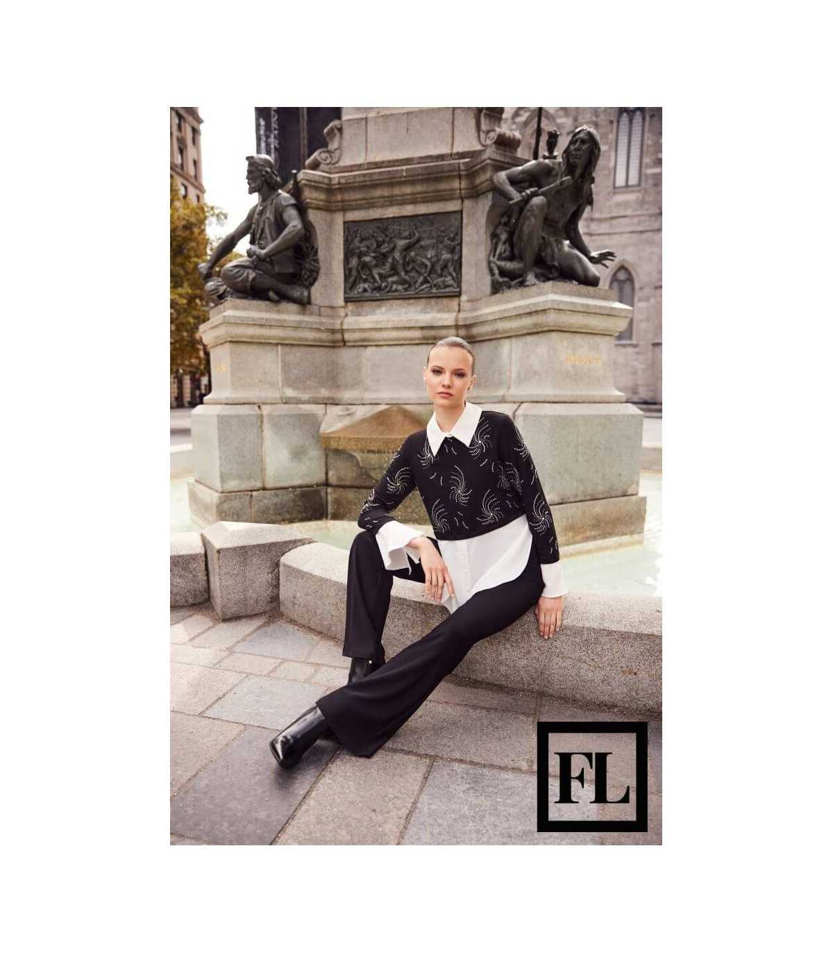 Top de punto ajustado, color negro de brillo, escote cruzado con drapeado en la cintura y manga larga, de la marca canadiense Joseph Ribkoff.Composición 20% fibra metálica, 75% nailon, 5% elastano. Tallaje español