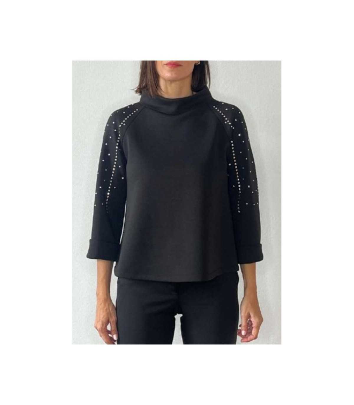 Top básico en tejido punto de seda color negro, manga tres cuartos, escote y dobladillo redondeado, ligeramente entallado, de la marca canadiense Joseph Ribkoff.Composición: 96% poliéster, 4% elastano.  Tallaje Español