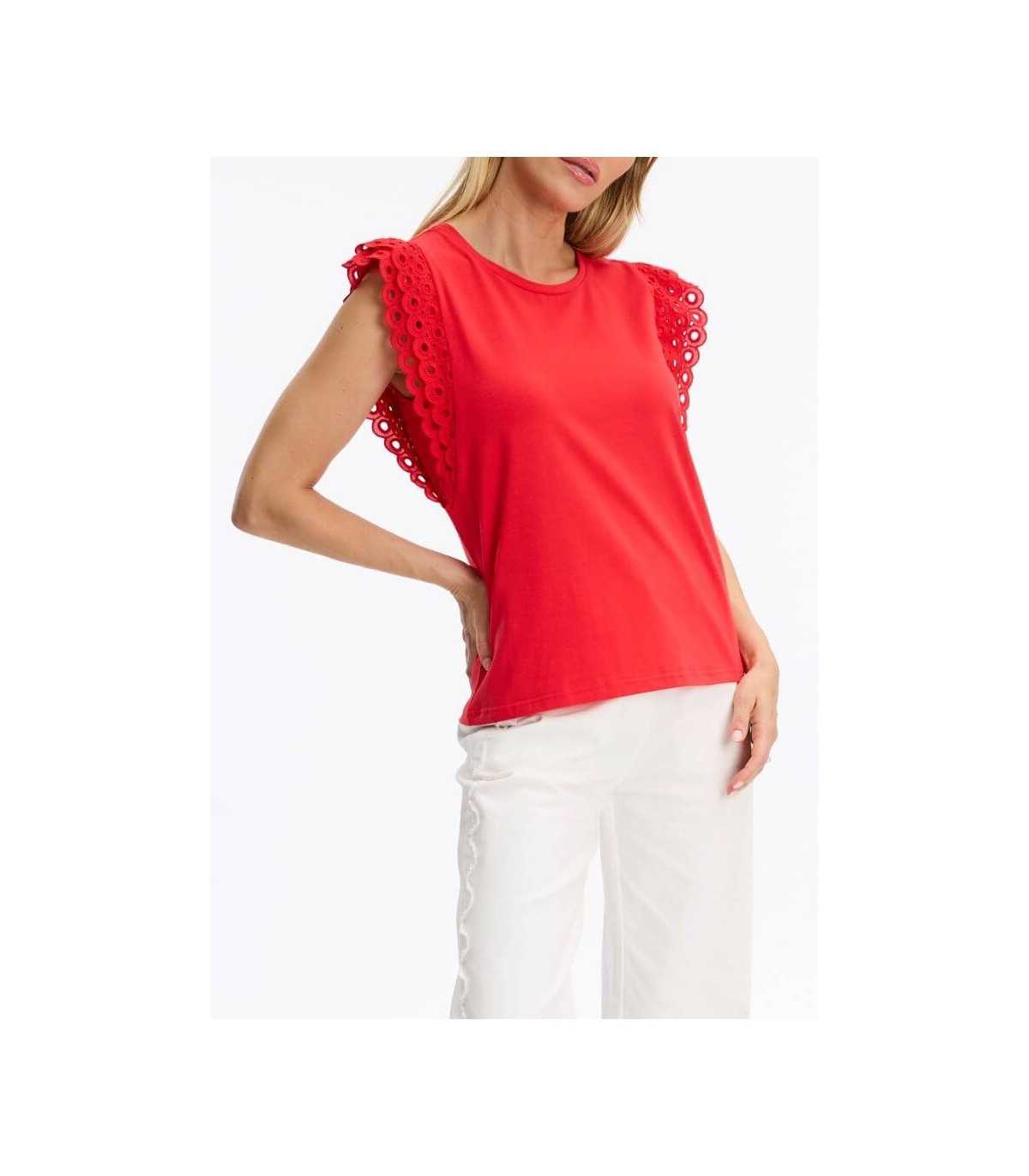 Camiseta en color rojo, cuello redondo, sin mangas con terminación doble tira bordada al tono de la camiseta y línea recta, de la marca francesa Leo&Ugo.