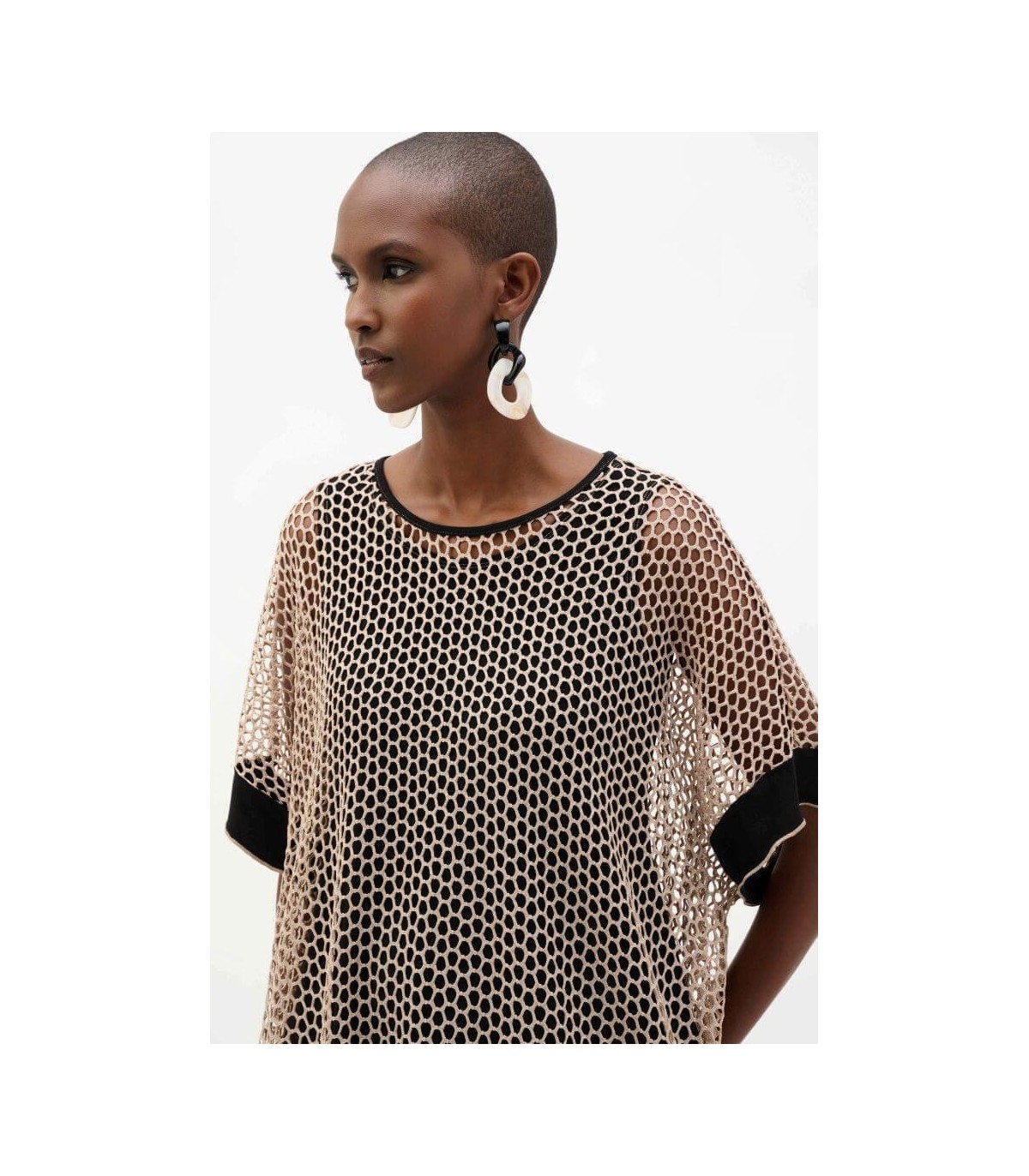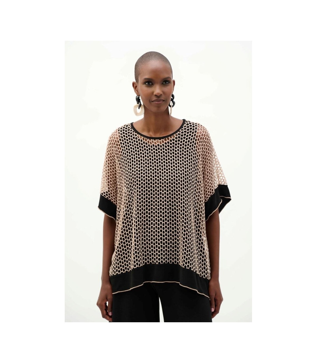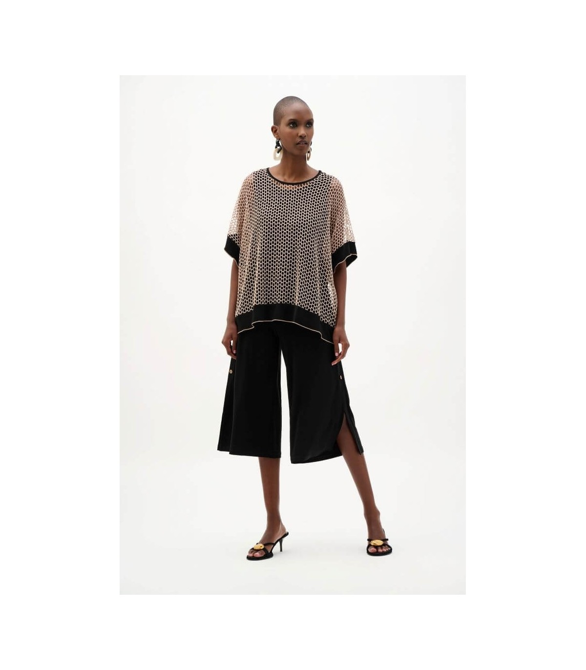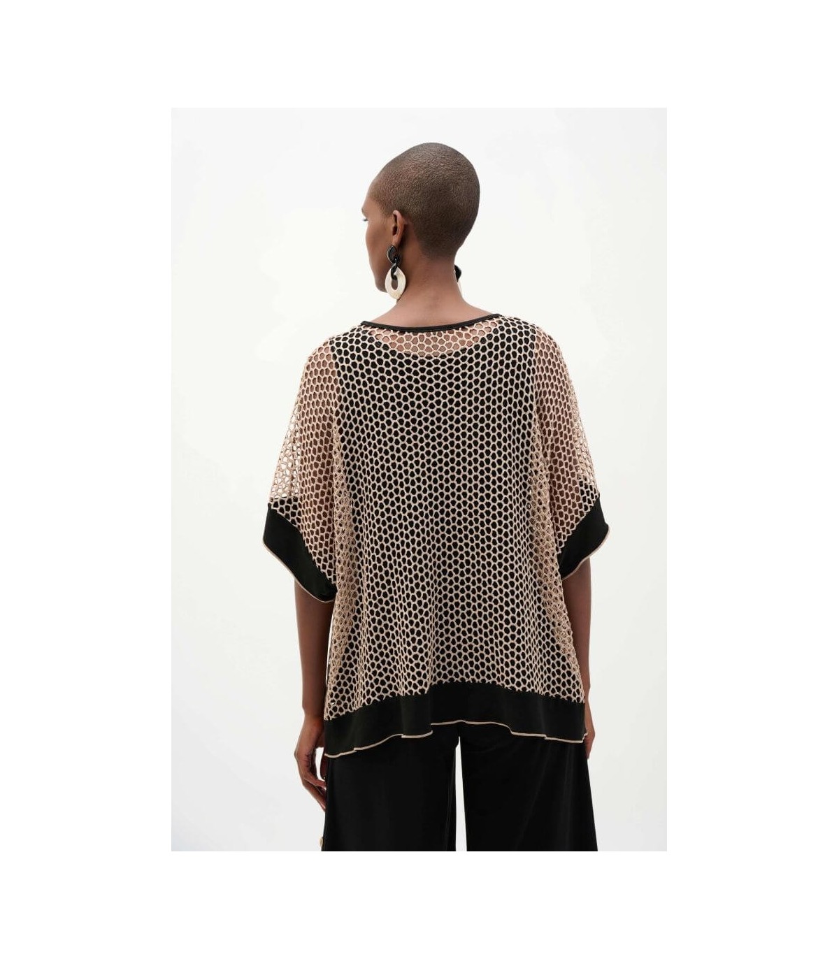 Top en tejido punto de seda color negro y malla de lurex en color beige, escote redondo y mangas dolmán cortas con puños de contraste, de la marca canadiense Joseph Ribkoff.